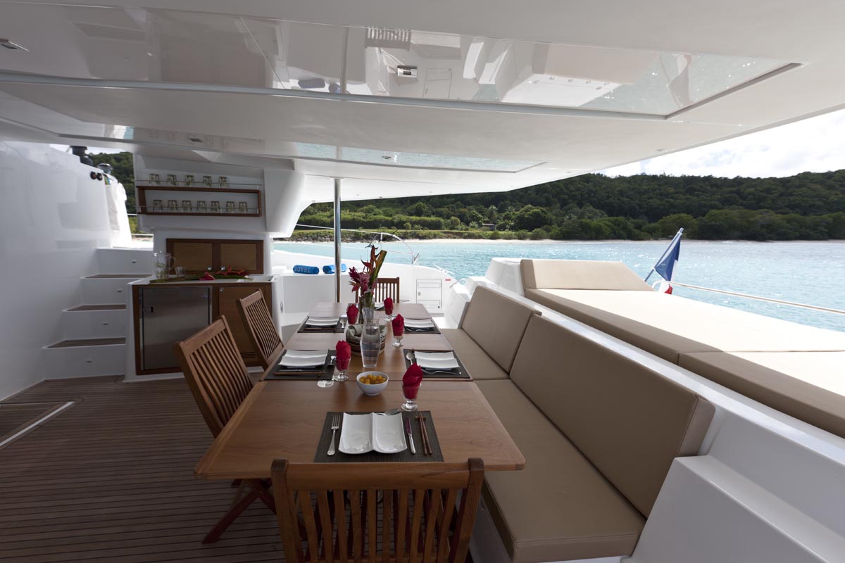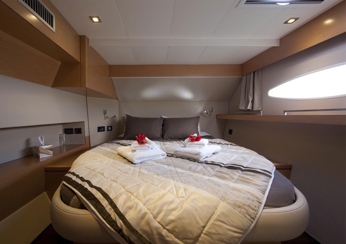 | Inside | 220V Steckdosen, Dusche, Eiswürfelmaschine, Gasherd mit Backofen, Generator, Inverter 12V/220V, Klimaanlage, Kühlschrank, Mikrowelle, Radio mit CD/MP3/USB (Ipod möglich), Ventilatoren in Kabinen, Warmwasser, Watermaker, WC (elektr.) |