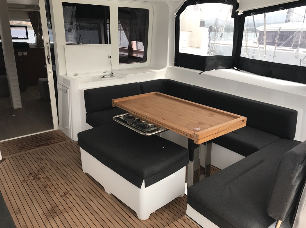 | Outside | Biminitop, Cockpitdusche, Cockpitkühlschrank, Cockpitlautsprecher, elektr. Ankerwinsch, hydraul. Gangway, Sprayhood, Teak im Cockpit |