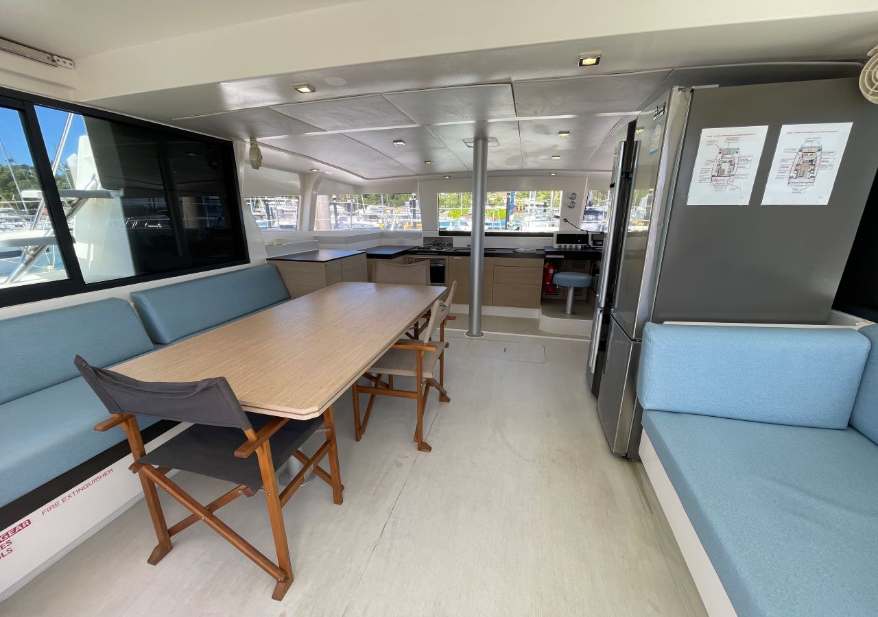 | Outside | Badeleiter, Biminitop auf Flybridge, Cockpitdusche, Cockpitlautsprecher, Cockpitpolster, Cockpittisch, Deckpolster, elektr. Ankerwinsch, elektr. Winsch, Flybridge, Polster auf Flybridge, Solaranlage |