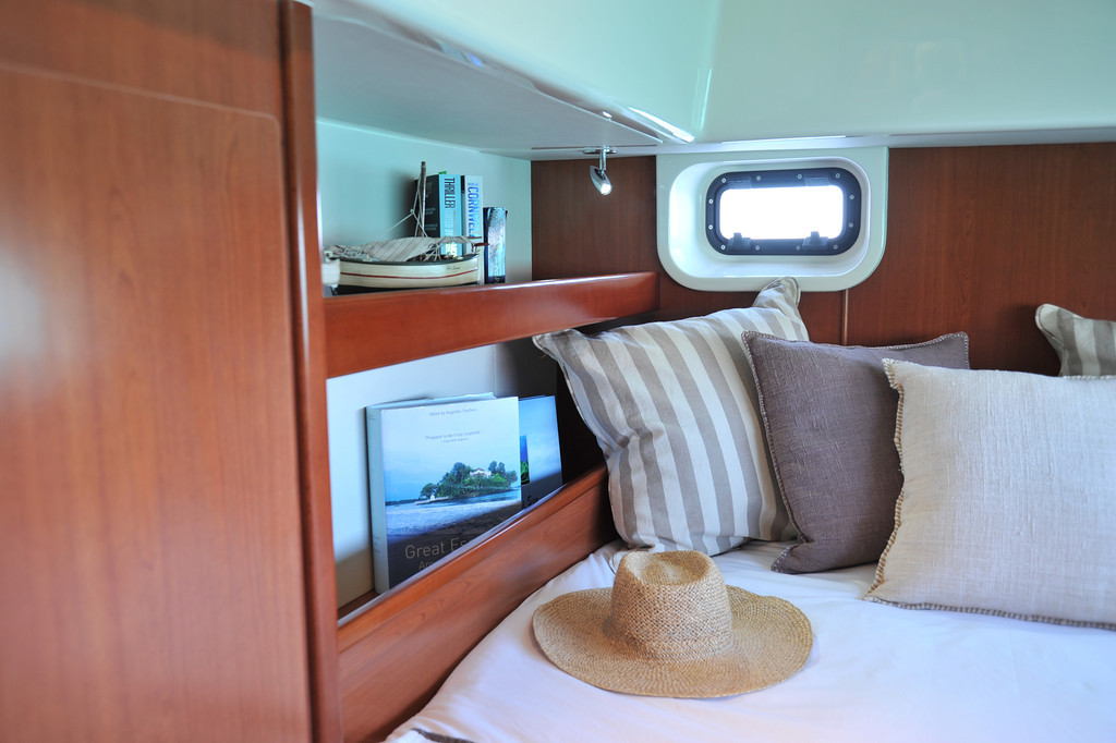 Kabinen in der Vorpiek sind nur über Bugkabinen zu erreichen und bieten lediglich Platz für kleinere Kinder oder Gepäck. Einem gebuchten Skipper muss eine vollwertige Kabine zur Verfügung gestellt werden.