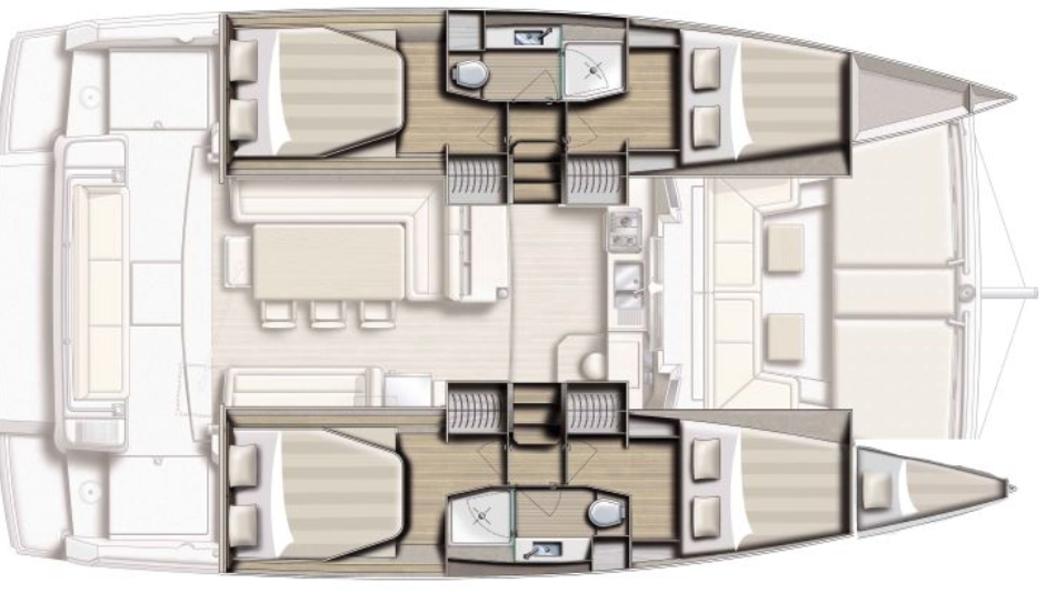 | Outside | Badeleiter, Biminitop, Cockpitdusche, Cockpitlautsprecher, Cockpitpolster, Cockpittisch, Davits, elektr. Ankerwinsch, elektr. Winsch, Grill, Pantry im Cockpit, Selbstholende Winschen, Solaranlage, Unterwasserbeleuchtung |