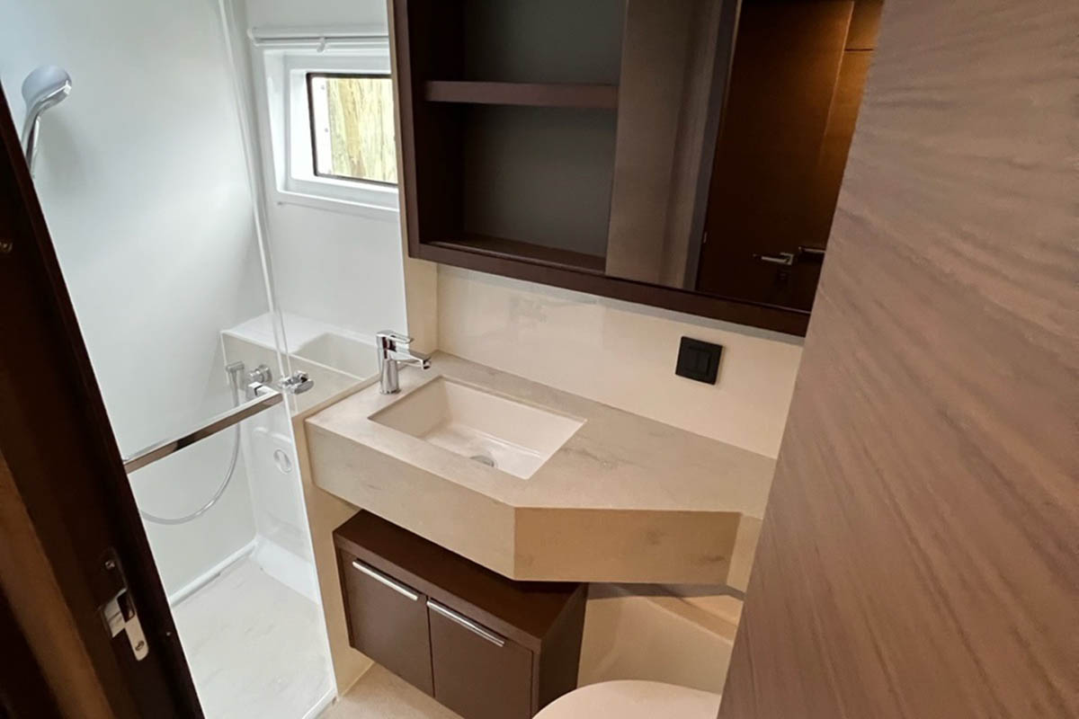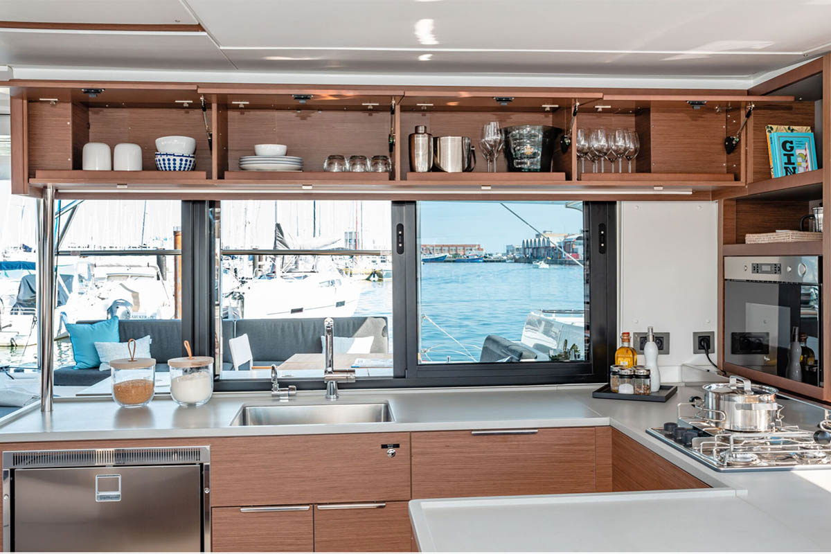 | Inside | Backofen, Eiswürfelmaschine, Elektrische Filterkaffeemaschine, Frischwasserpumpe, FUSION Sound System, Gasherd, Gefrierschrank, Generator, Geschirrspüler, Inverter 12V/220V, Kaffeemaschine, Klimaanlage (ohne Landstrombedarf), Kühlschrank, Ladegerät, Landstromkabel, Mikrowelle, Mixer, Spülbecken, Süßwasser-Aufbereitungsanlage, Toaster, Trockner, USB Steckdose, Ventilatoren in Kabinen, Waschmaschine, Watermaker, WC (elektr.) |