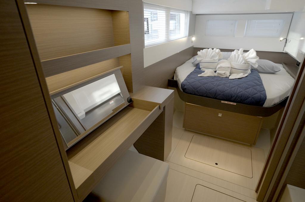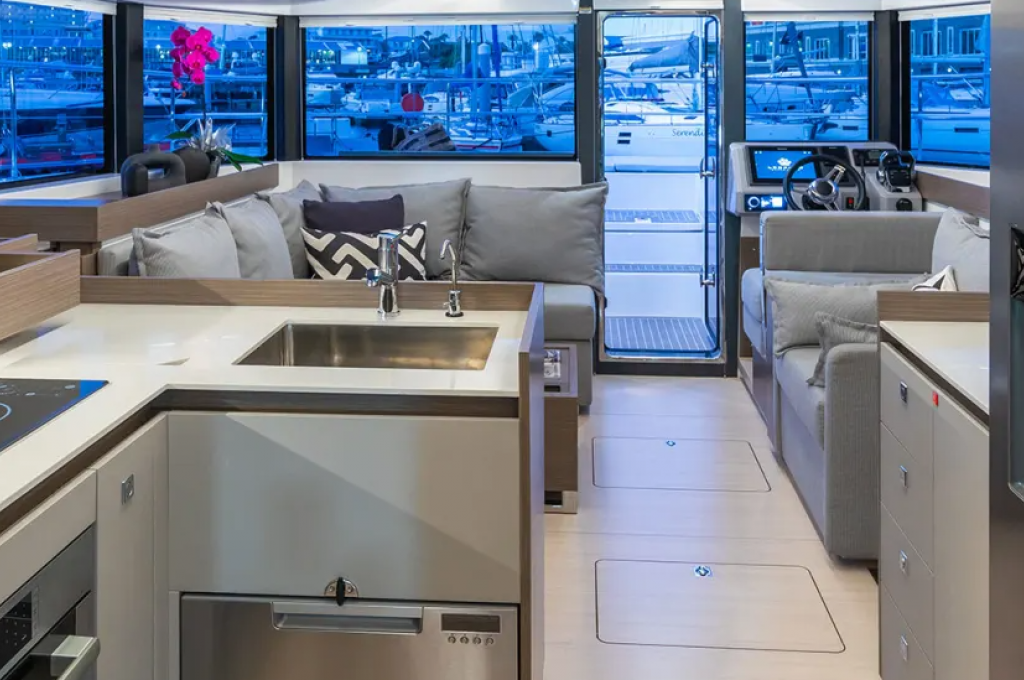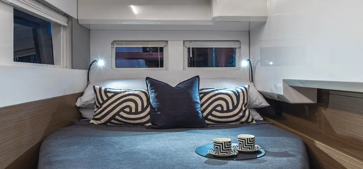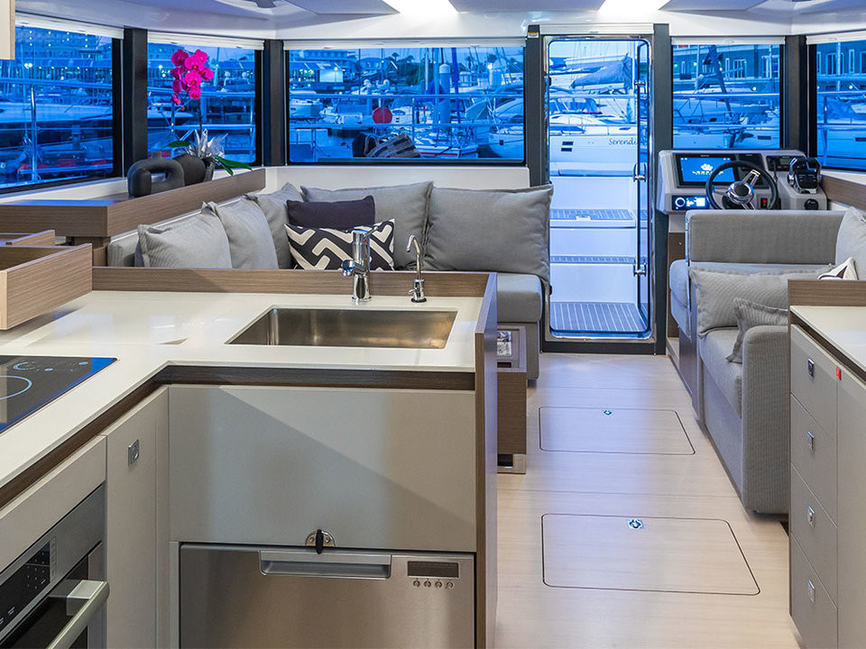 | Inside | DVD-Player, Gasherd, Generator, Klimaanlage (ohne Landstrombedarf), Ladegerät, Landstromkabel, Mikrowelle, Radio mit CD und MP3, TV, USB Steckdose, USB Steckdosen in den Kabinen, Ventilatoren in Kabinen, Warmwasser, Watermaker, WC (elektr.), Wechselrichter |