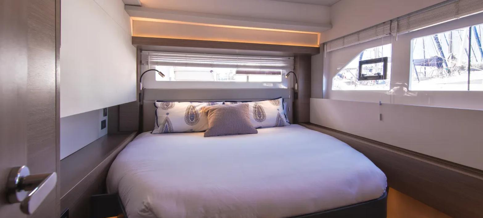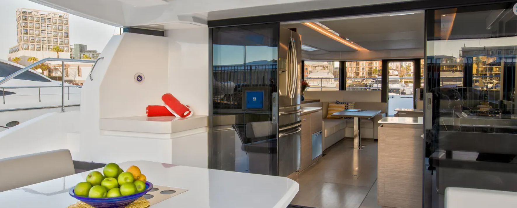 | Inside | DVD-Player, Fäkalientank, FUSION Sound System, Generator, Geschirrspüler, Klimaanlage (ohne Landstrombedarf), Kühlschrank, Ladegerät, Landstromkabel, Lautsprecher in Salon und Cockpit, LED-Innenleuchten, Mikrowelle, Pantryausstattung, Radio mit USB, Bluetooth und AUX-In, TV, USB Steckdose, Warmwasser, Watermaker, WC (elektr.), Wechselrichter |