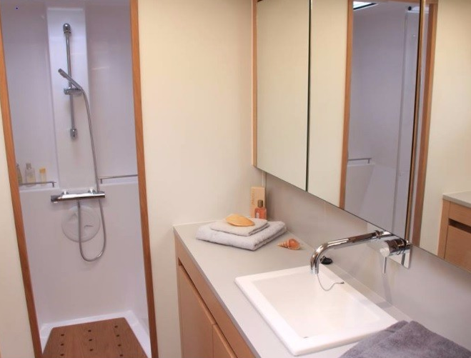 | Inside | Backofen, Bluetooth Player, Gasherd, Generator, Klimaanlage (ohne Landstrombedarf), Kühlschrank, Radio mit USB und Bluetooth, USB Steckdose, Ventilatoren in Kabinen, Watermaker, WC (elektr.) |