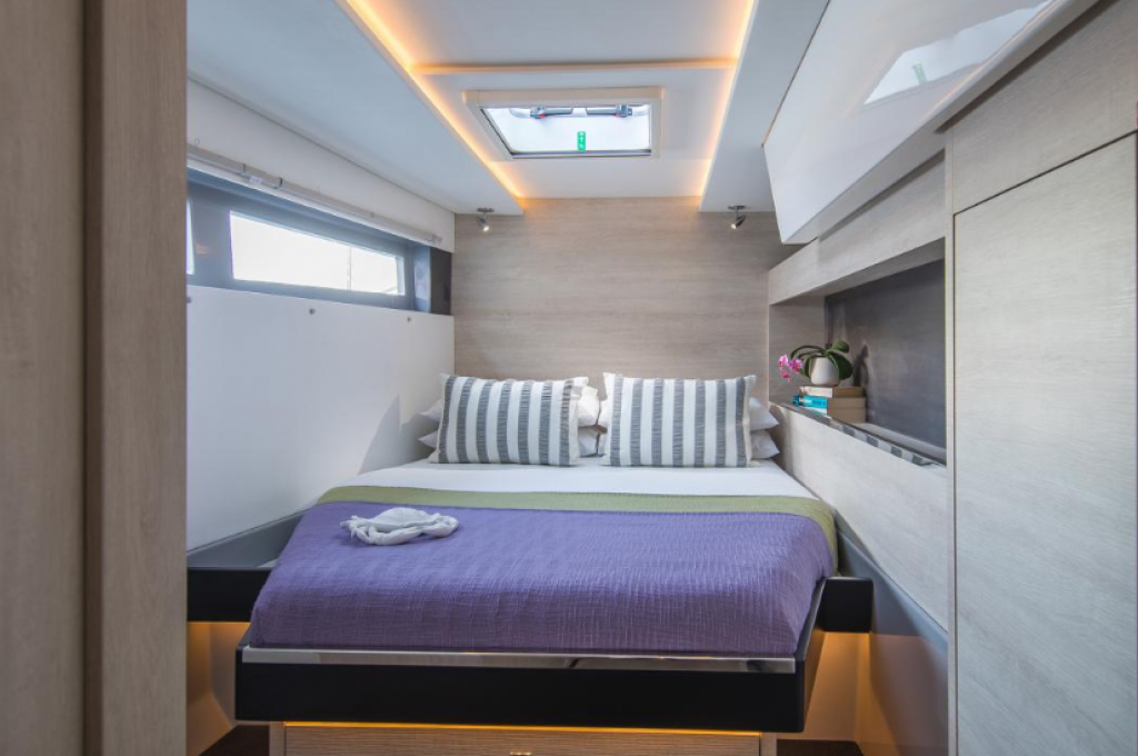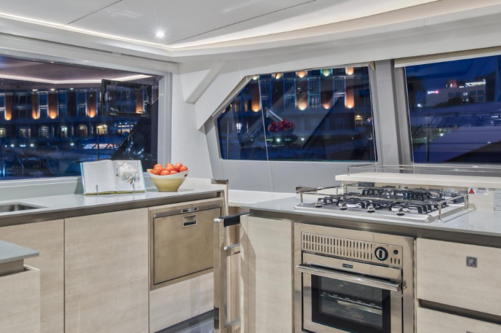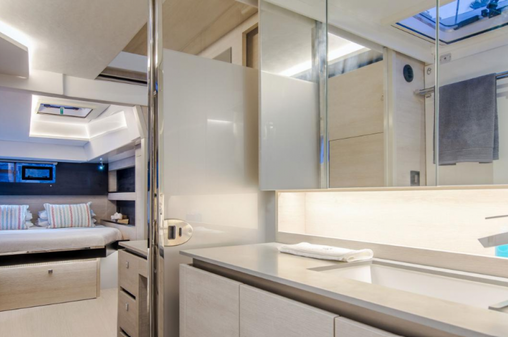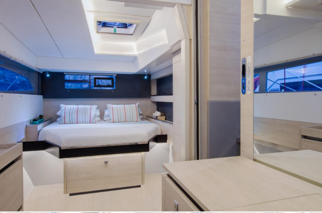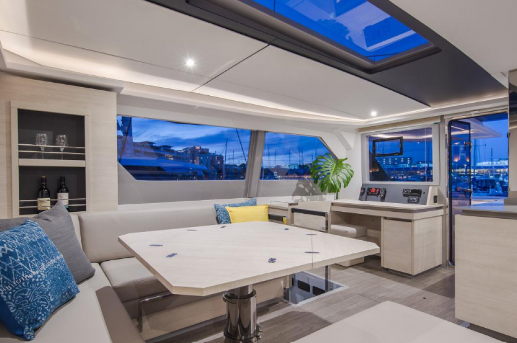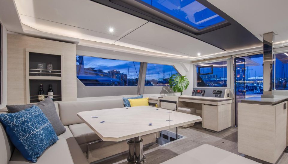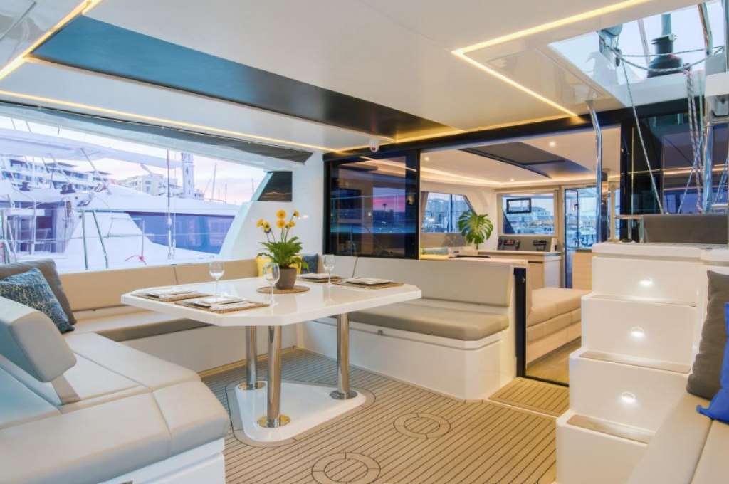Inside 12V Steckdose, 2. Kühlschrank, Gasherd mit Backofen, Generator, Inverter 12V/220V, Klimaanlage (ohne Landstrombedarf), Kühlschrank, Ladegerät, Landstromkabel, LED-Innenleuchten, Mikrowelle, Radio mit CD und MP3, Salontisch absenkbar, TV, USB Steckdose, Ventilatoren in Kabinen, Warmwasser, Watermaker, Wechselrichter