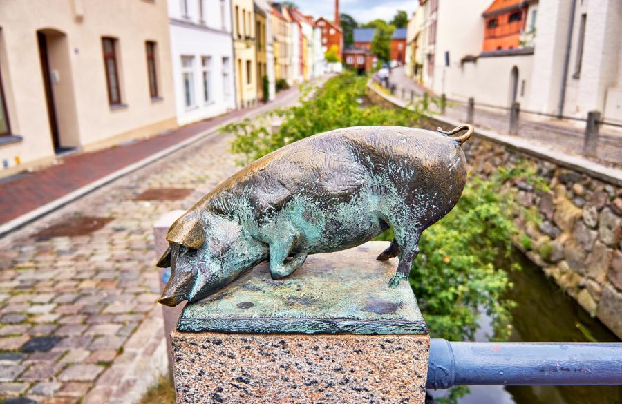 Die Altstadt von Wismar ist Weltkulturerbe. Auch die sogenannte Schweinsbrücke liegt hier. Entdecken Sie selbst die vier Bronzeschweinchen, welche die Brückenköpfe zieren. © DR pics/AdobeStock