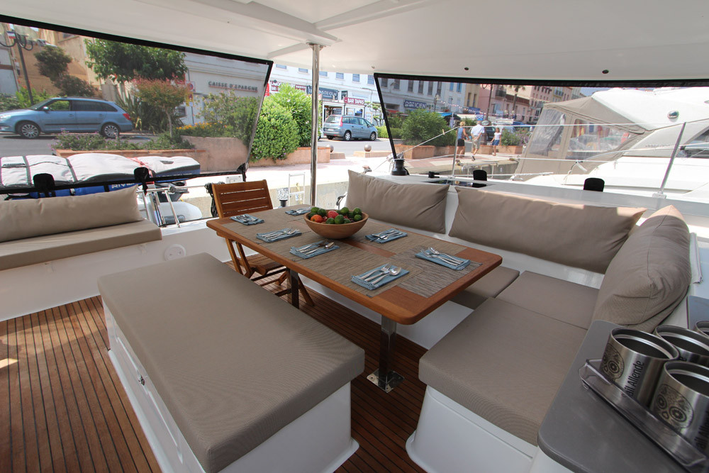 | Outside | 12 V-Anschluss, Badeleiter, Biminitop, Cockpitdusche, Cockpitlautsprecher, Cockpitpolster, Cockpittisch, Davits, elektr. Ankerwinsch, elektr. Großwinsch, Faltpropeller, Schnorchelausrüstung, Selbstholende Winschen |