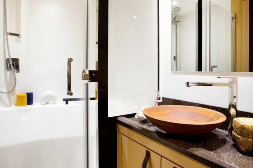 Inside 220V Steckdosen, CD-Player, Dusche, Eiswürfelmaschine, Generator, Geschirrspüler, Heizung, Herd, Inverter 12V/220V, Klimaanlage, Kühlschrank, Mikrowelle, Radio mit Bluetooth, Safe für Wertsachen, Ventilatoren in Kabinen, Warmwasser, Waschmaschine, Watermaker, WC, WC (elektr.)