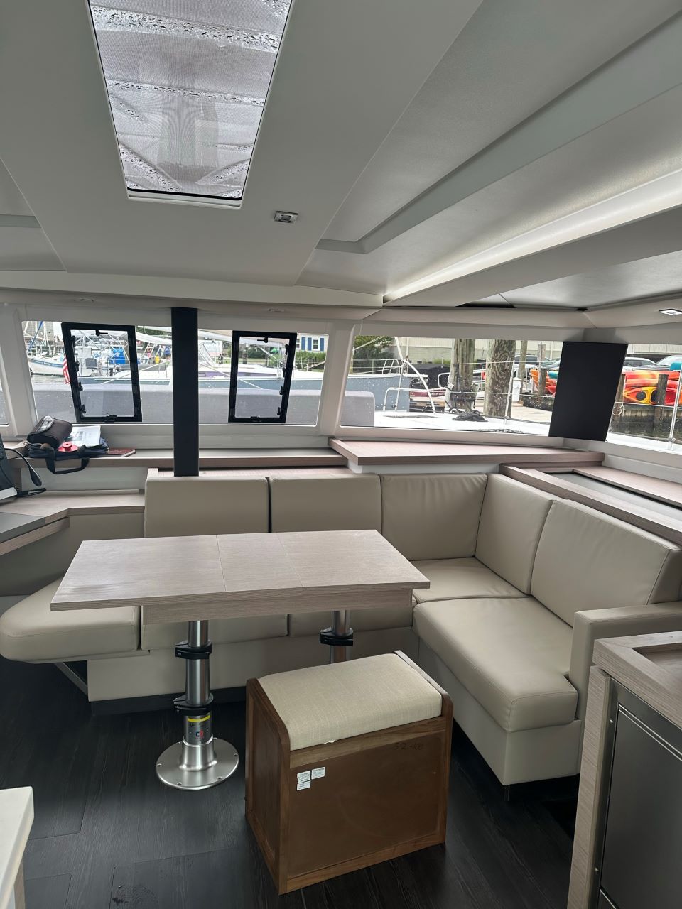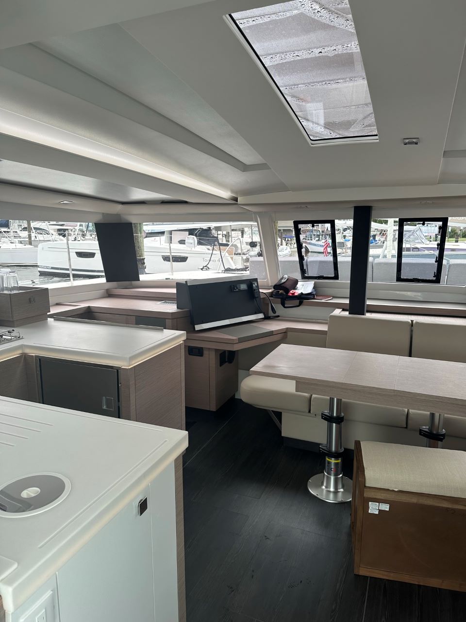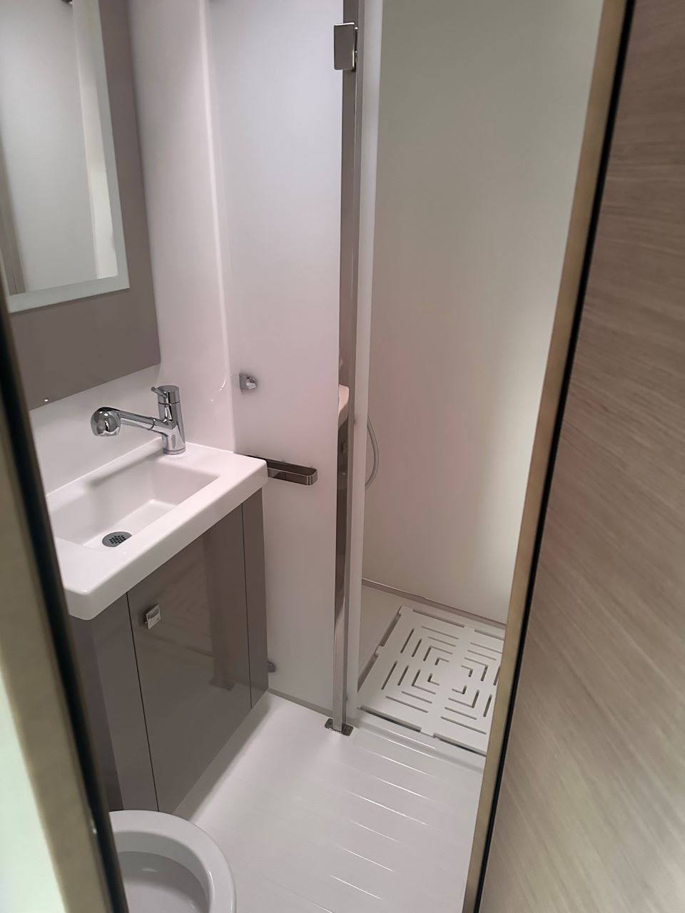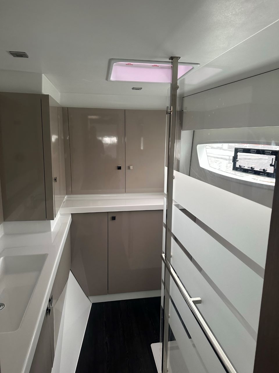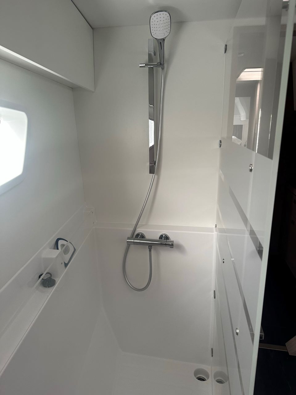 | Inside | 110 V Steckdose, Eisbox, Fäkalientank, Gasherd, Gefrierschrank, Generator, Inverter 12V/220V, Klimaanlage (ohne Landstrombedarf), Kühlbox, Kühlschrank, Lautsprecher im Salon, Mikrowelle, Pantryausstattung, Radio, Salontisch absenkbar, TV, USB Steckdose, Watermaker, WC (elektr.) |