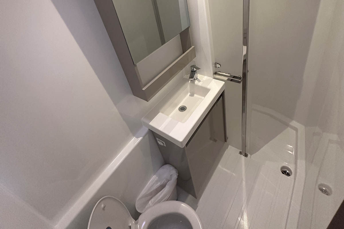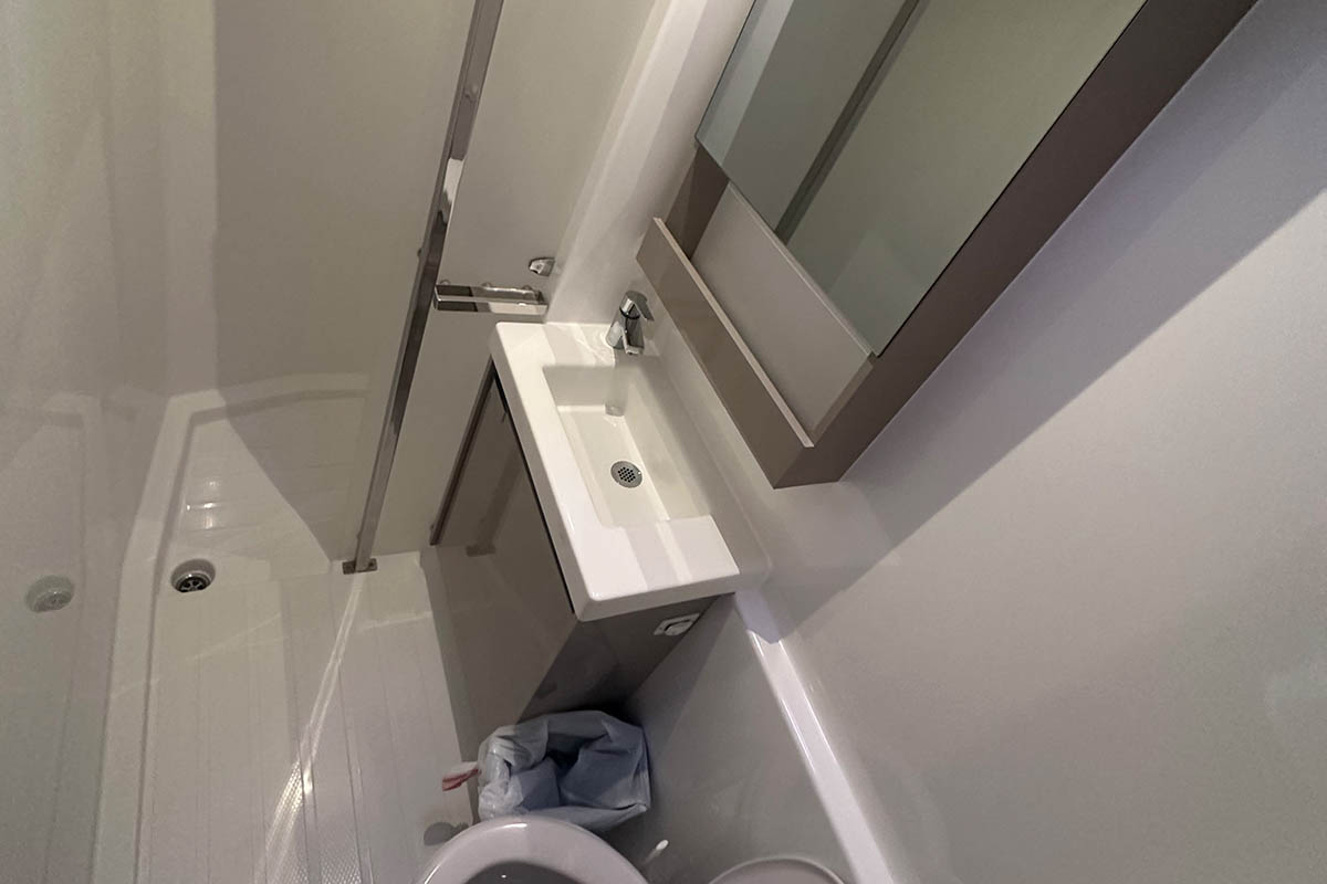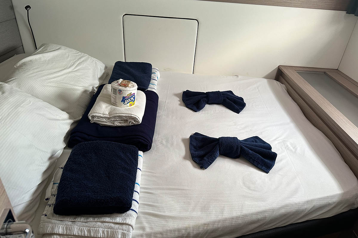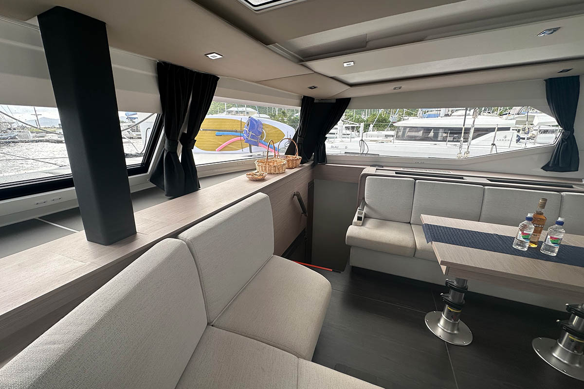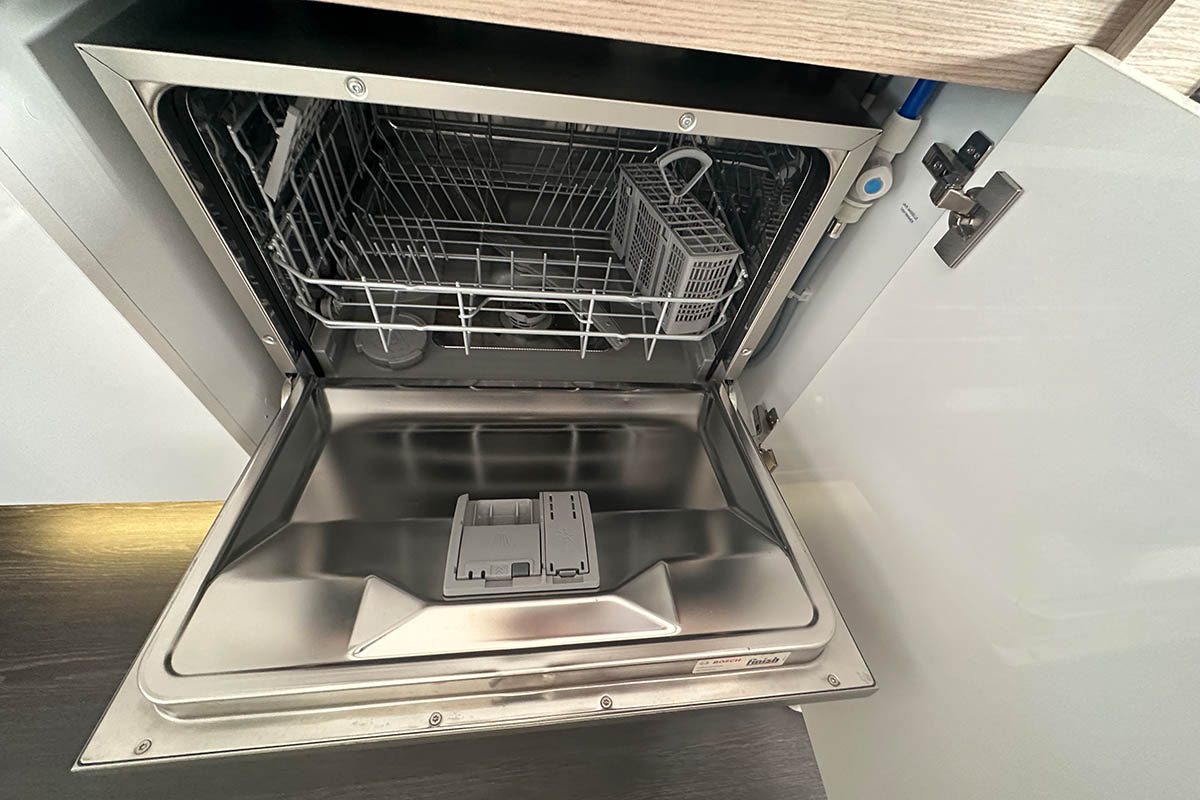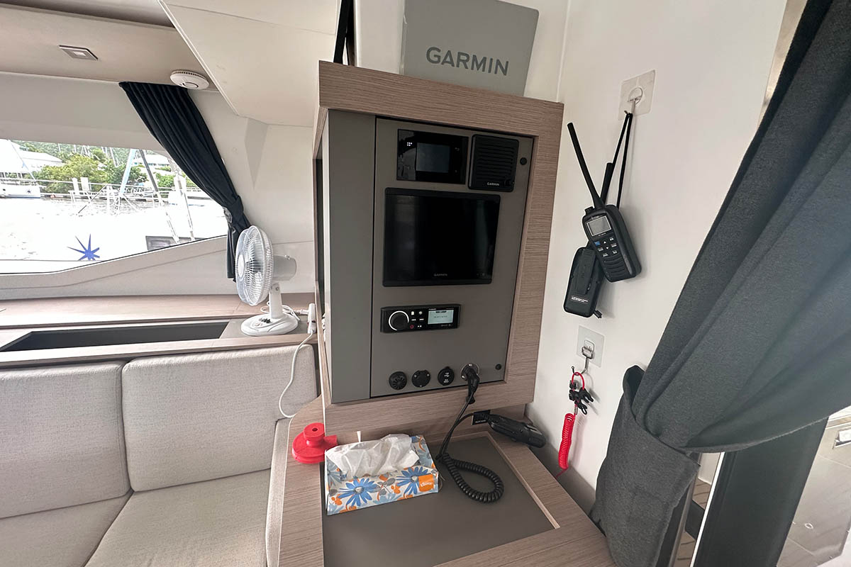 | Inside | 110 V Steckdose, Backofen, Elektrische Filterkaffeemaschine, Fäkalientank, Frischwasserpumpe, FUSION Sound System, Gasherd, Gefrierschrank, Generator, Geschirrspüler, Inverter 12V/220V, Kleiderbügel, Klimaanlage (ohne Landstrombedarf), Klobürste, Kühlschrank, Landstromkabel, Mikrowelle, Mixer, Pantryausstattung, Radio, Toaster, USB Steckdose, Ventilatoren in Kabinen, Wasserkocher, Watermaker, WC (elektr.), WC-Pumpe |