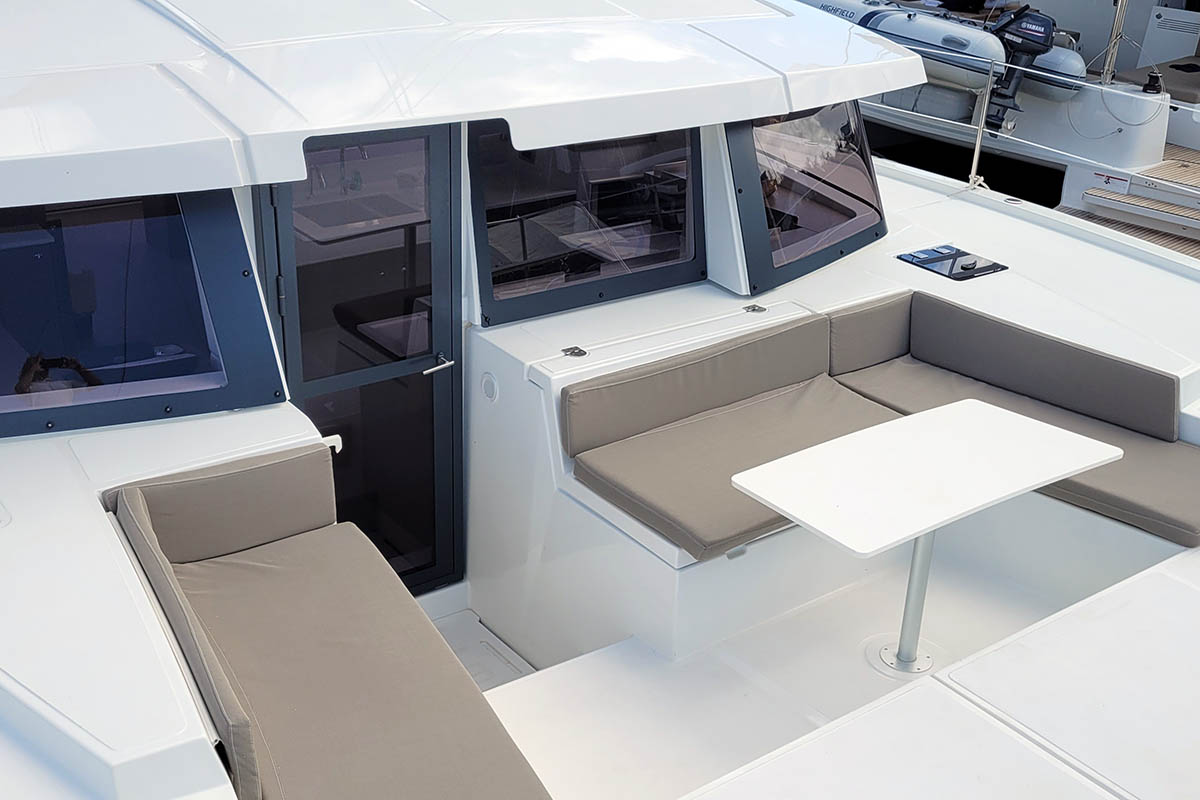 | Outside | Biminitop, Cockpitkühlschrank, Cockpitpolster, elektr. Winsch, Teak im Cockpit |