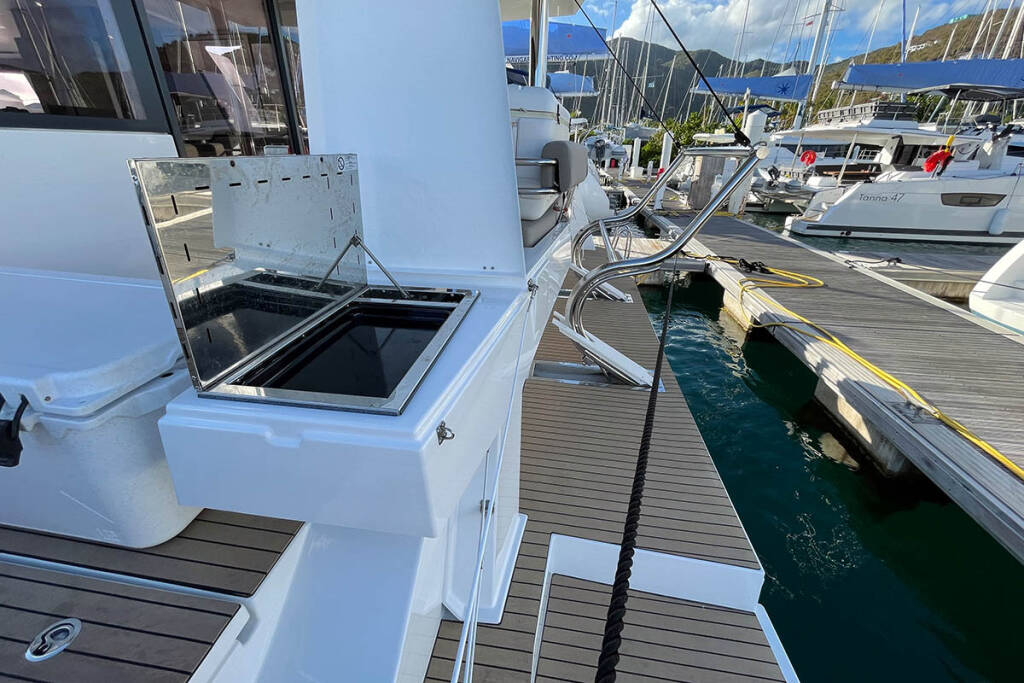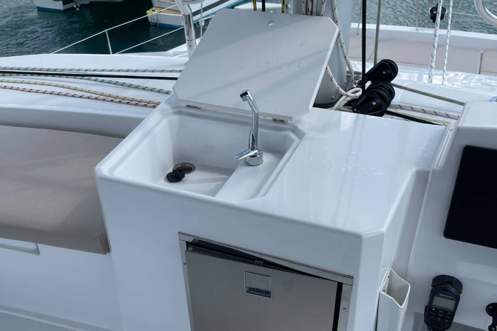 | Outside | Anker mit Kette, Badeleiter, Benzinkanister, Biminitop, Bootshaken, Cockpitdusche, Cockpitpolster, Cockpittisch, Deckbürste, elektr. Ankerwinsch, elektr. Winsch, Fender, Festmacherleinen, Gangway, Grill, Kugelfender, Kunststoff-Eimer (Pütz), Schnorchelausrüstung, Teak im Cockpit, Wantenschneider, Wasserschlauch, Windex, Winschen |