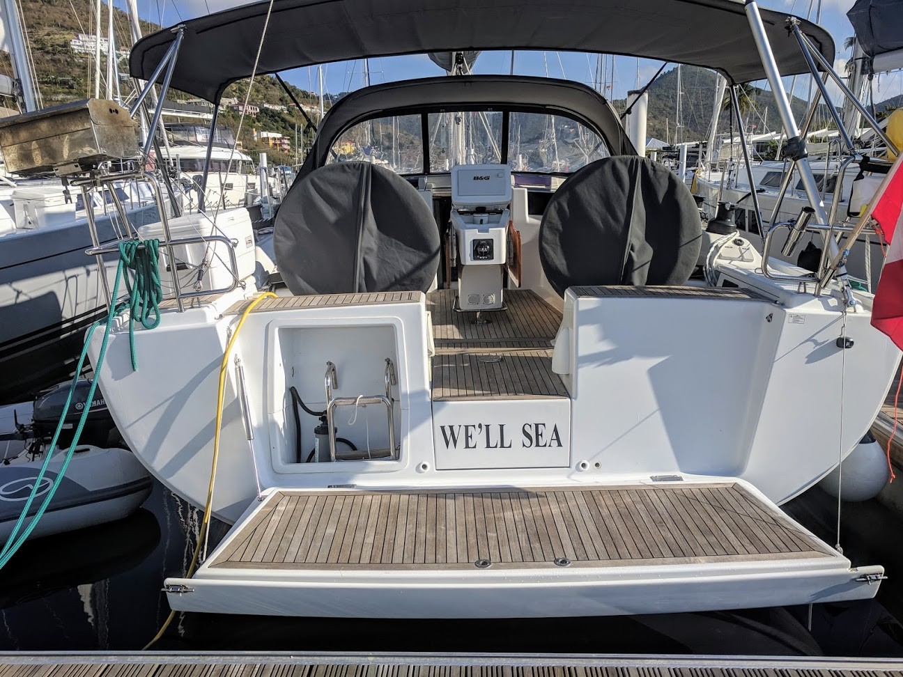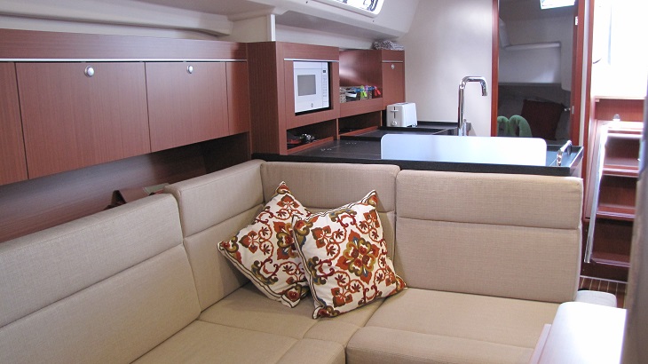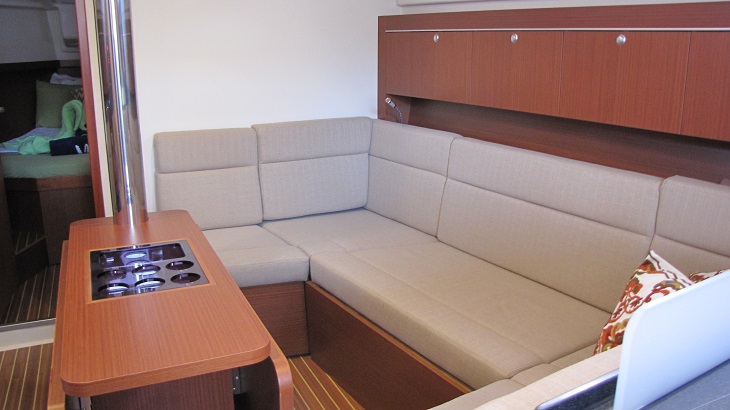 | Outside | 12 V-Anschluss, 220 V-Landanschluss, Badeleiter, Badeplattform, Biminitop, Cockpitdusche, Cockpitlautsprecher, Cockpitpolster, Cockpittisch, Cockpittisch mit Eisbox, elektr. Ankerwinsch, elektr. Winsch, Grill, Schnorchelausrüstung, Selbstholende Winschen, Windex |