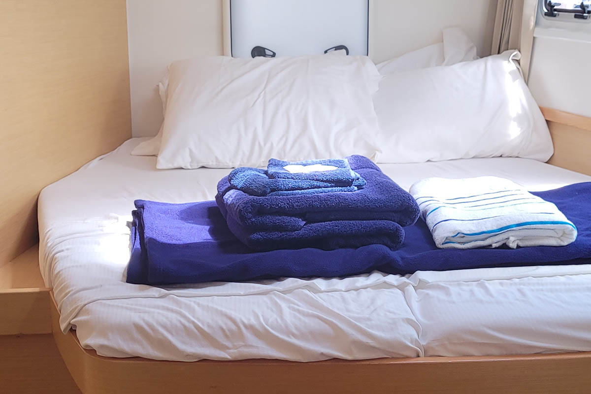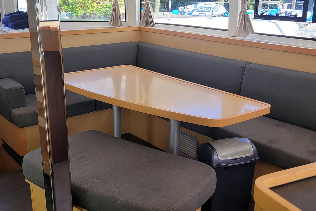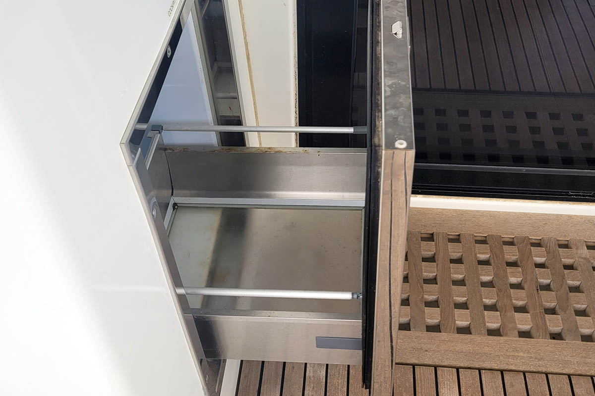 | Outside | Badeleiter, Bootshaken, Cockpitdusche, Cockpitpolster, Cockpittisch, Deckbürste, Deckpolster, Delta-Anker, elektr. Ankerwinsch, elektr. Winsch, Fender, Festmacherleinen, Gangway, Grill, Kugelfender, Schnorchelausrüstung, Wantenschneider, Wasserschlauch, Windex, Winschen |