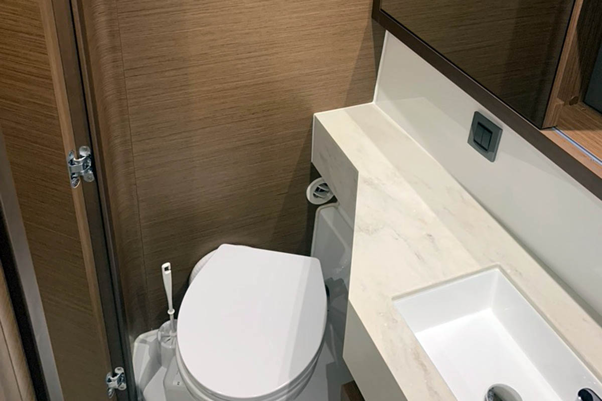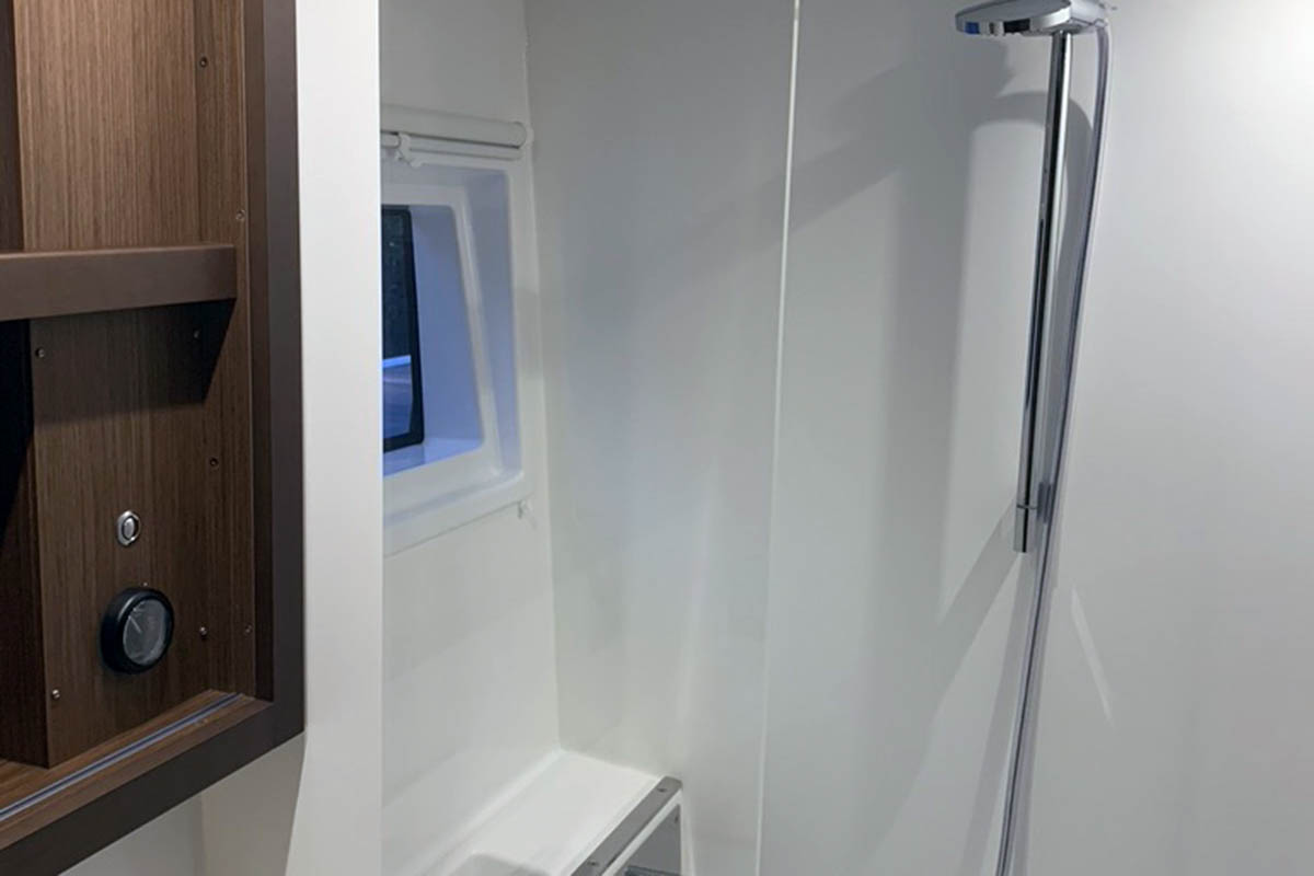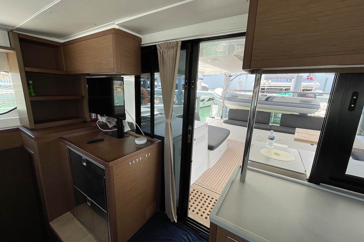 Inside 12V/220V-Steckdosen, Backofen, Fäkalientank, Gasherd, Generator, Geschirrspüler, Inverter 12V/220V, Klimaanlage (ohne Landstrombedarf), Kühlschrank, Ladegerät, Lautsprecher im Salon, LED-Innenleuchten, Mikrowelle, Mokkakanne, Pantryausstattung, Radio mit CD, USB Steckdose, Ventilatoren in Kabinen, Warmwasser, Wasserkocher, Watermaker, WC (elektr.)