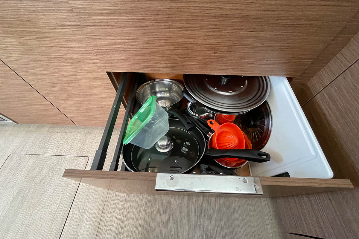 | Inside | 110 V Steckdose, Backofen, Elektrische Filterkaffeemaschine, Fäkalientank, Frischwasserpumpe, Gasherd, Generator, Kleiderbügel, Klimaanlage (ohne Landstrombedarf), Klobürste, Kühlschrank, Ladegerät, Landstromkabel, Pantryausstattung, Radio mit CD/MP3/USB, USB Steckdose, Ventilatoren in Kabinen, Wasserkocher, Watermaker, WC (elektr.), WC-Pumpe |