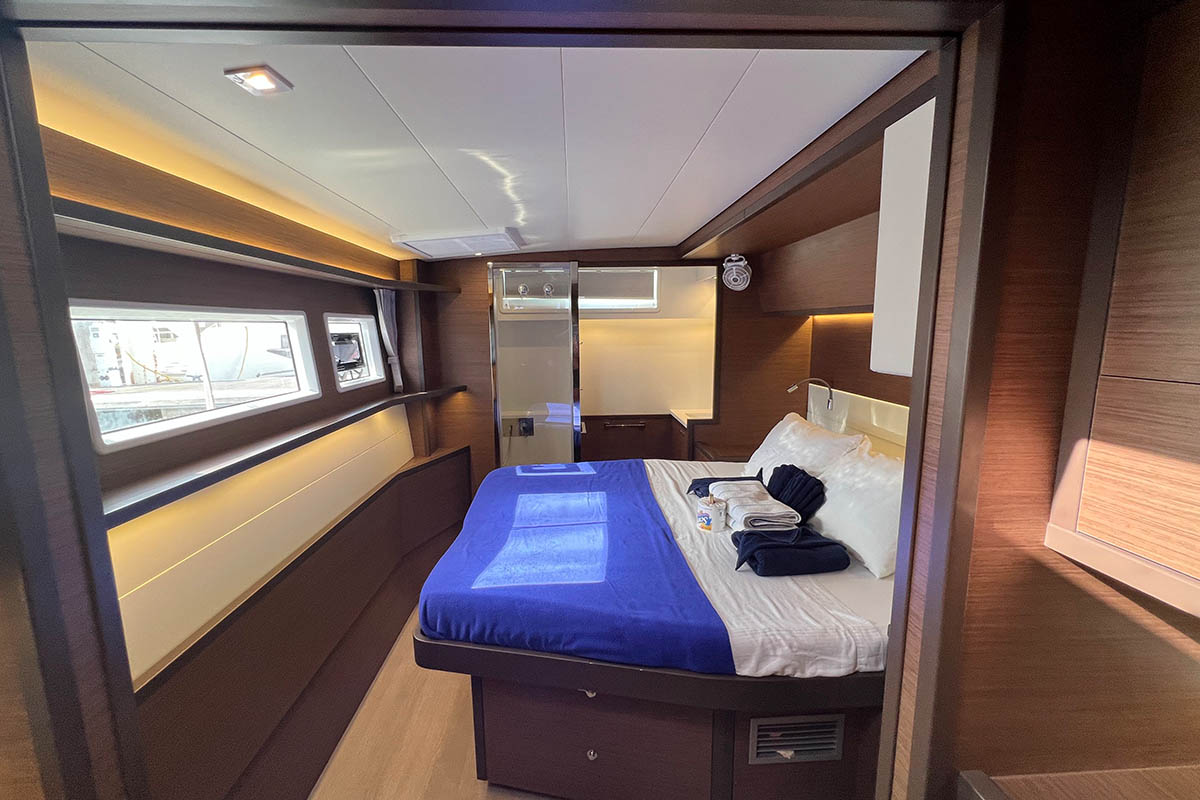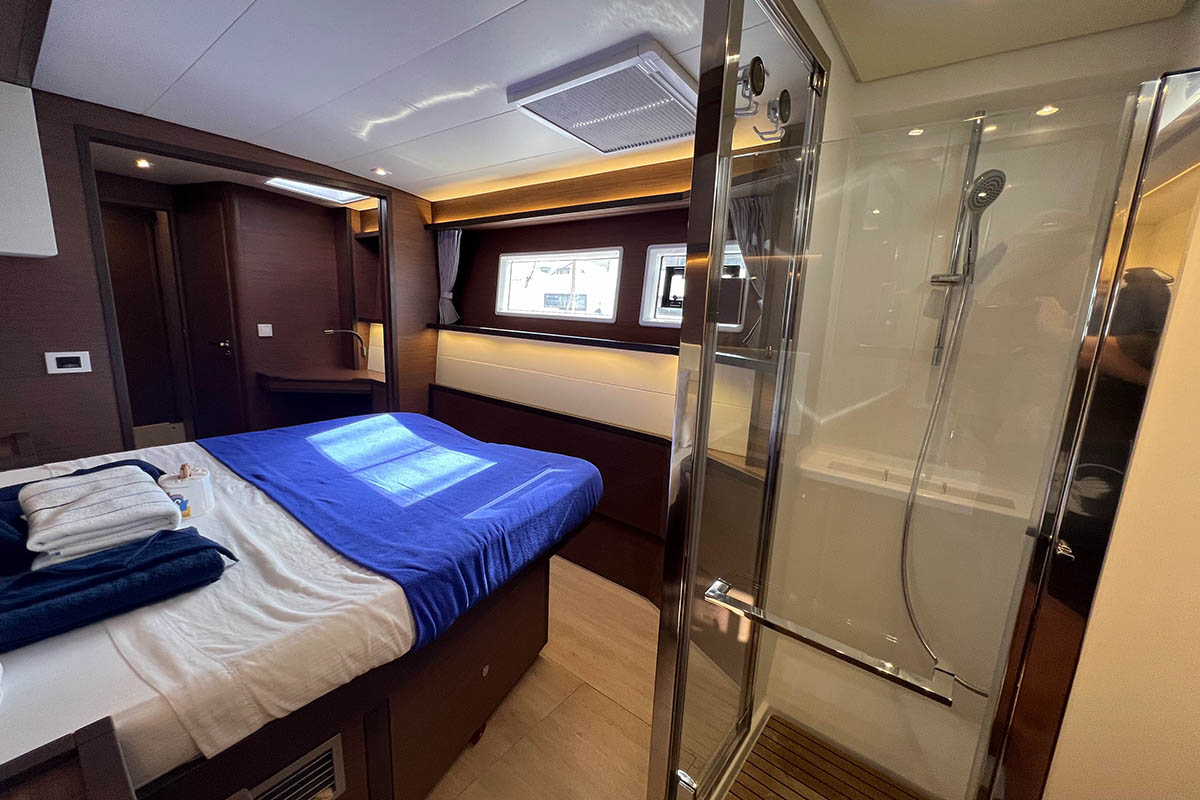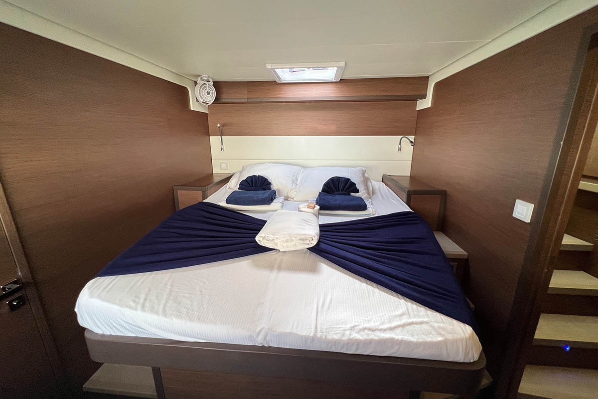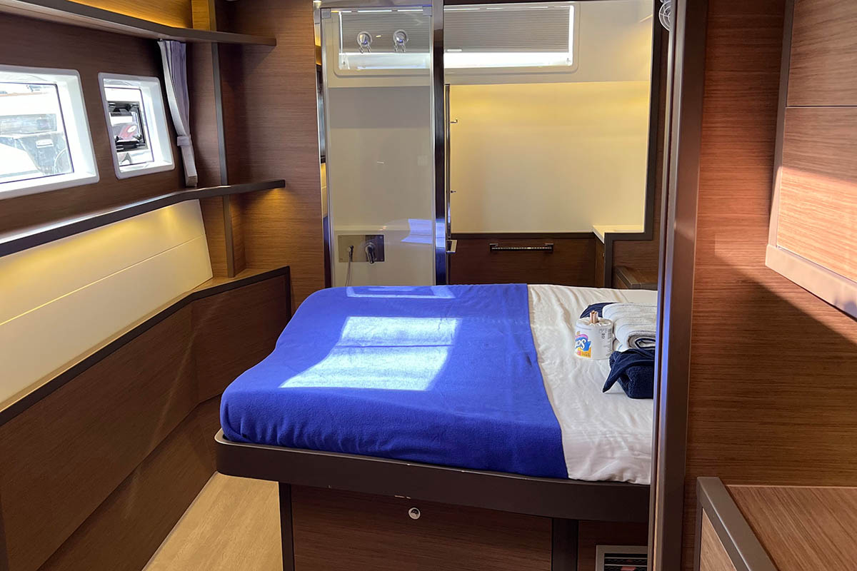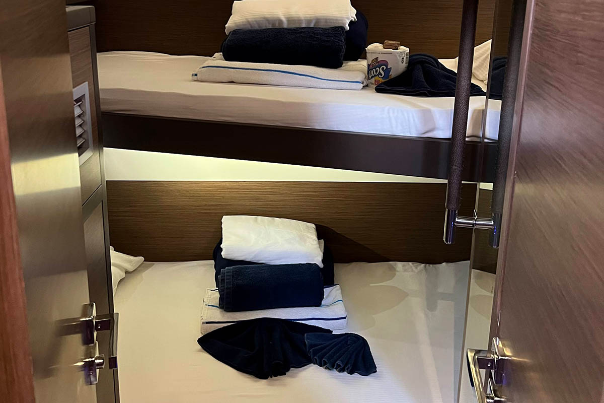 | Outside | Anker mit Kette, Badeleiter, Bootshaken, Cockpitdusche, Cockpitpolster, Cockpittisch, Deckbürste, elektr. Ankerwinsch, elektr. Winsch, Fender, Festmacherleinen, Gangway, Grill, Kugelfender, Kunststoff-Eimer (Pütz), Schnorchelausrüstung, Wantenschneider, Wasserschlauch, Windex, Winschen |
