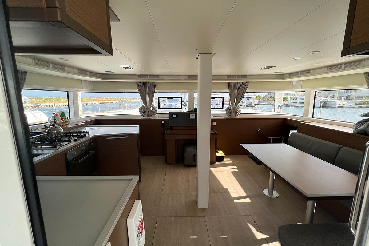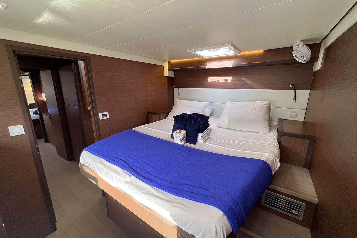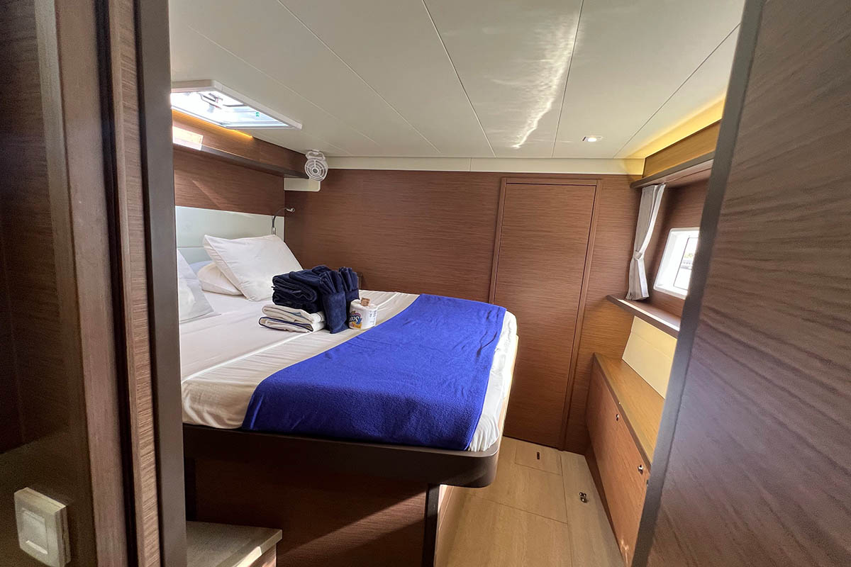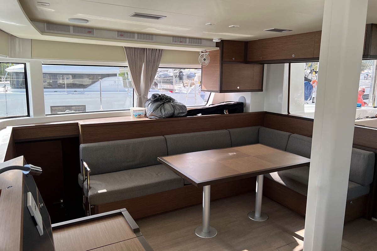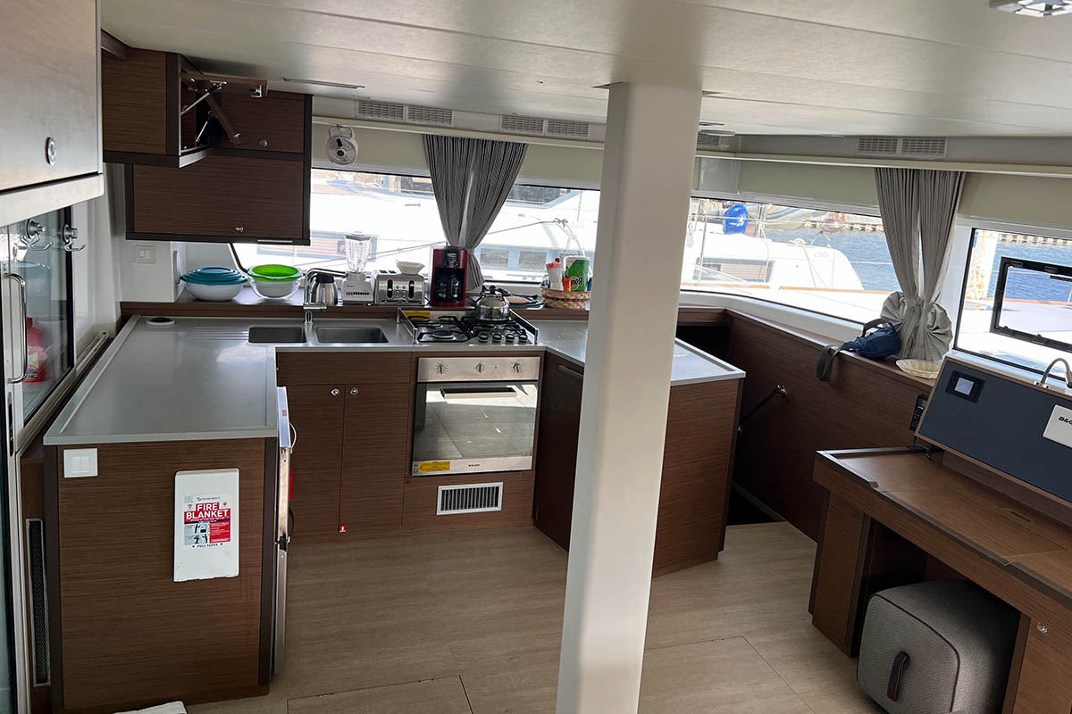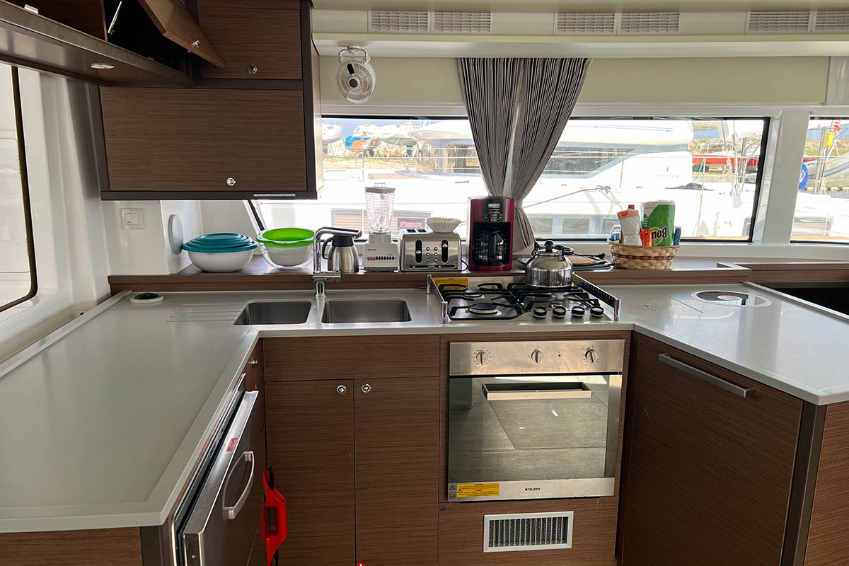 | Outside | Anker mit Kette, Badeleiter, Bootshaken, Cockpitdusche, Cockpitpolster, Cockpittisch, Deckbürste, elektr. Ankerwinsch, elektr. Winsch, Fender, Festmacherleinen, Gangway, Grill, Kugelfender, Kunststoff-Eimer (Pütz), Schnorchelausrüstung, Wantenschneider, Wasserschlauch, Windex, Winschen |