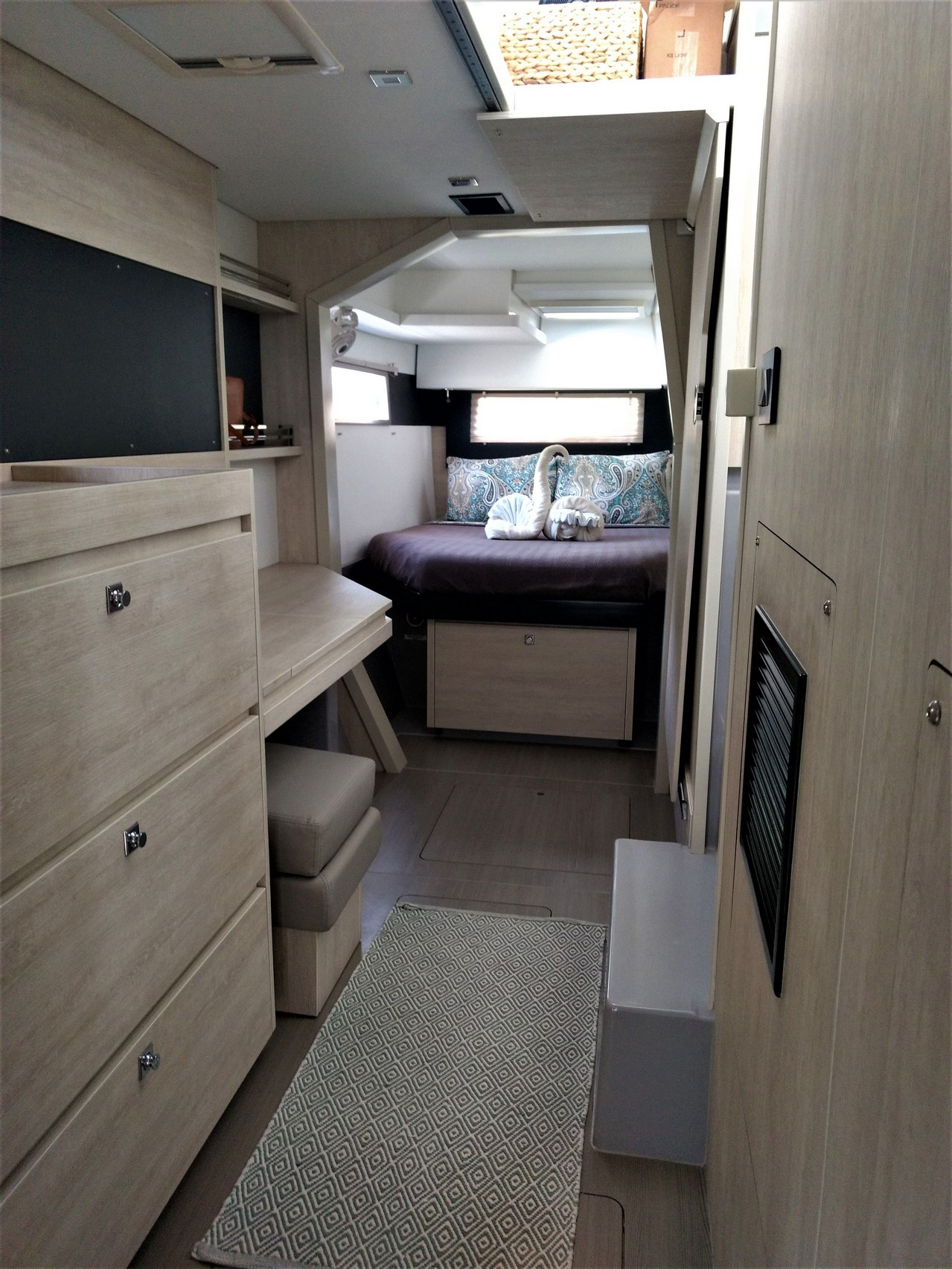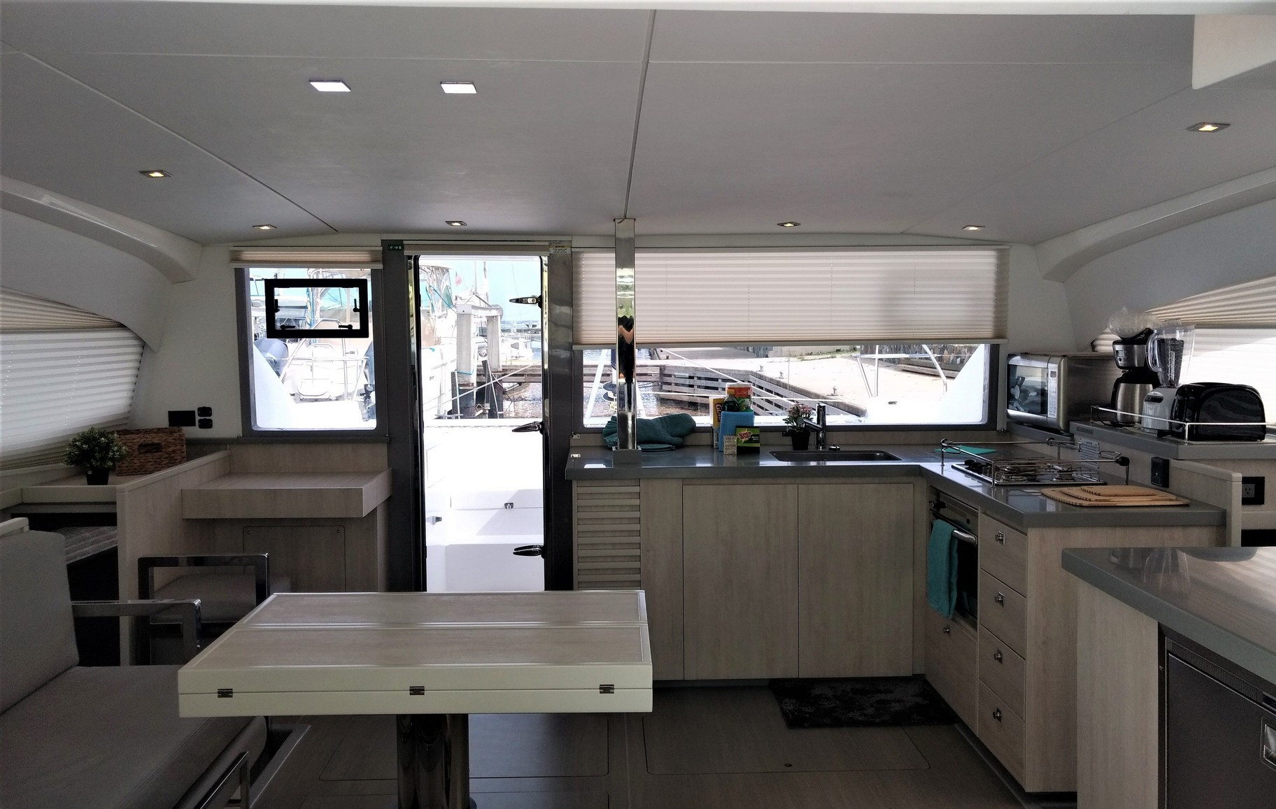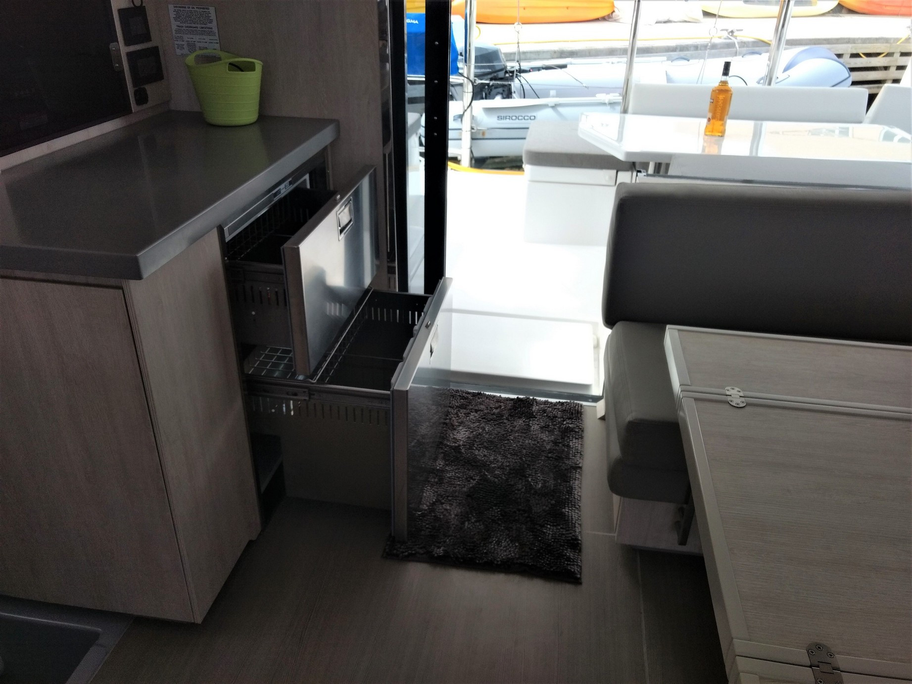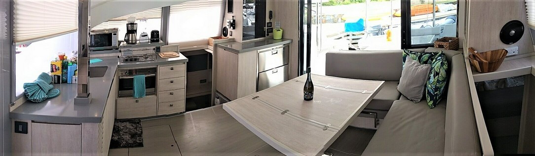 | Inside | Druckwasser, Dusche, Gasherd, Gasherd mit Backofen, Gefrierschrank, Generator, Inverter 12V/220V, Kaffeemaschine, Klimaanlage (ohne Landstrombedarf), Kühlschrank, Mikrowelle, Mixer, Radio mit CD und Bluetooth, Salontisch absenkbar, Ventilatoren in Kabinen, Warmwasser, WC (elektr.) |