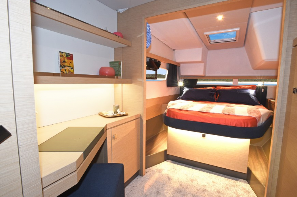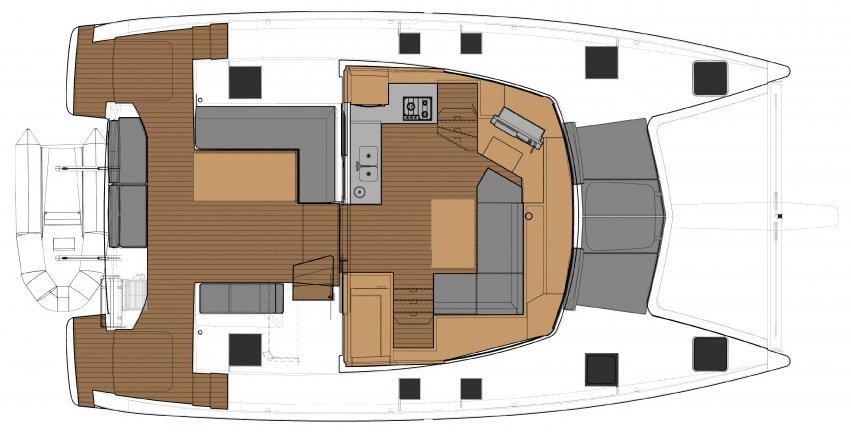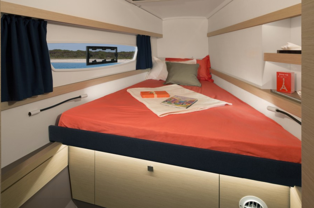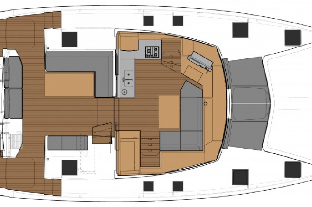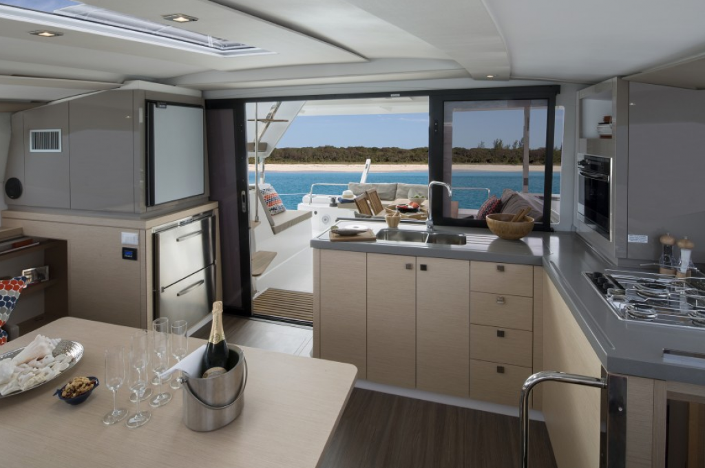 Inside Dusche, Gasherd mit Backofen, Gefrierschrank, Generator, Inverter 12V/220V, Klimaanlage, Kühlschrank, Radio mit Bluetooth, Salontisch absenkbar, Ventilatoren in Kabinen, Watermaker, WC (elektr.)