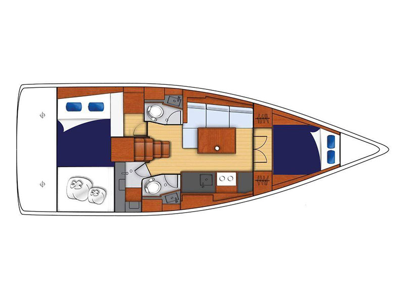 | Safety | Autopilot, elektr. Bilgepumpe, Feststoffschwimmwesten, Handbilgepumpe, Navigationslichter, Notpinne, Notsignale, Rettungskragen, Sicherheitsgurt, UKW-Funk, Zweitanker |