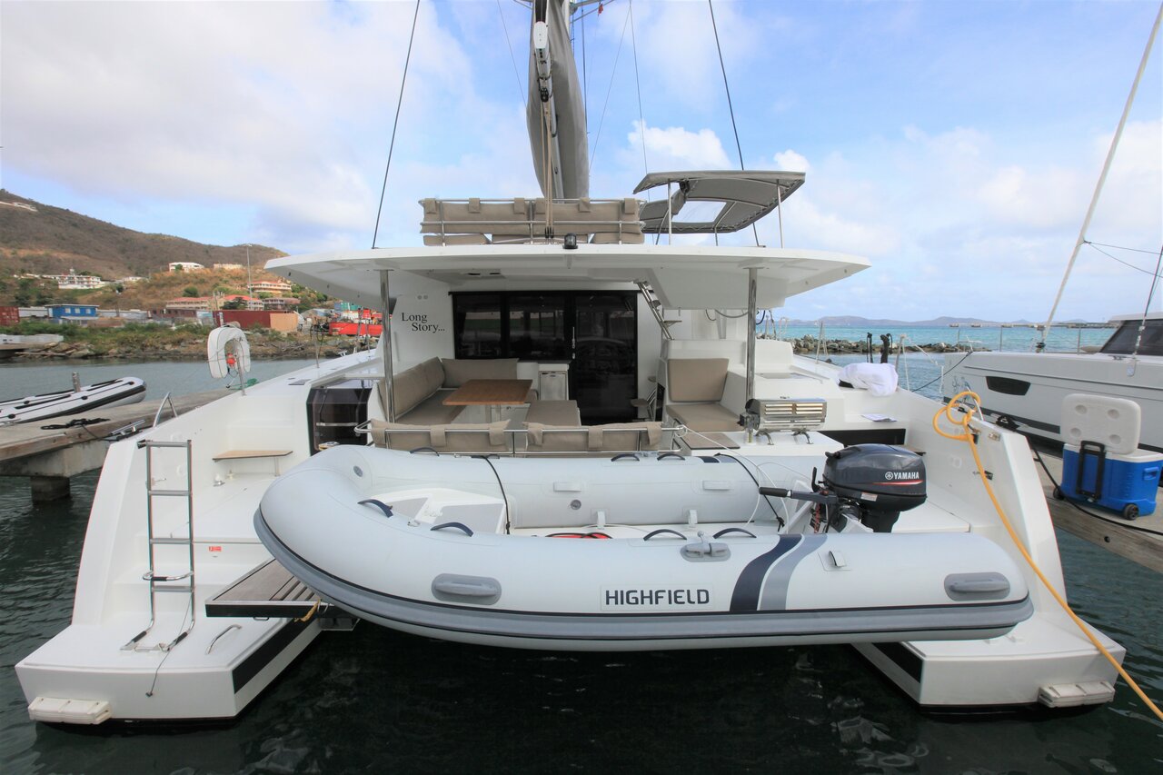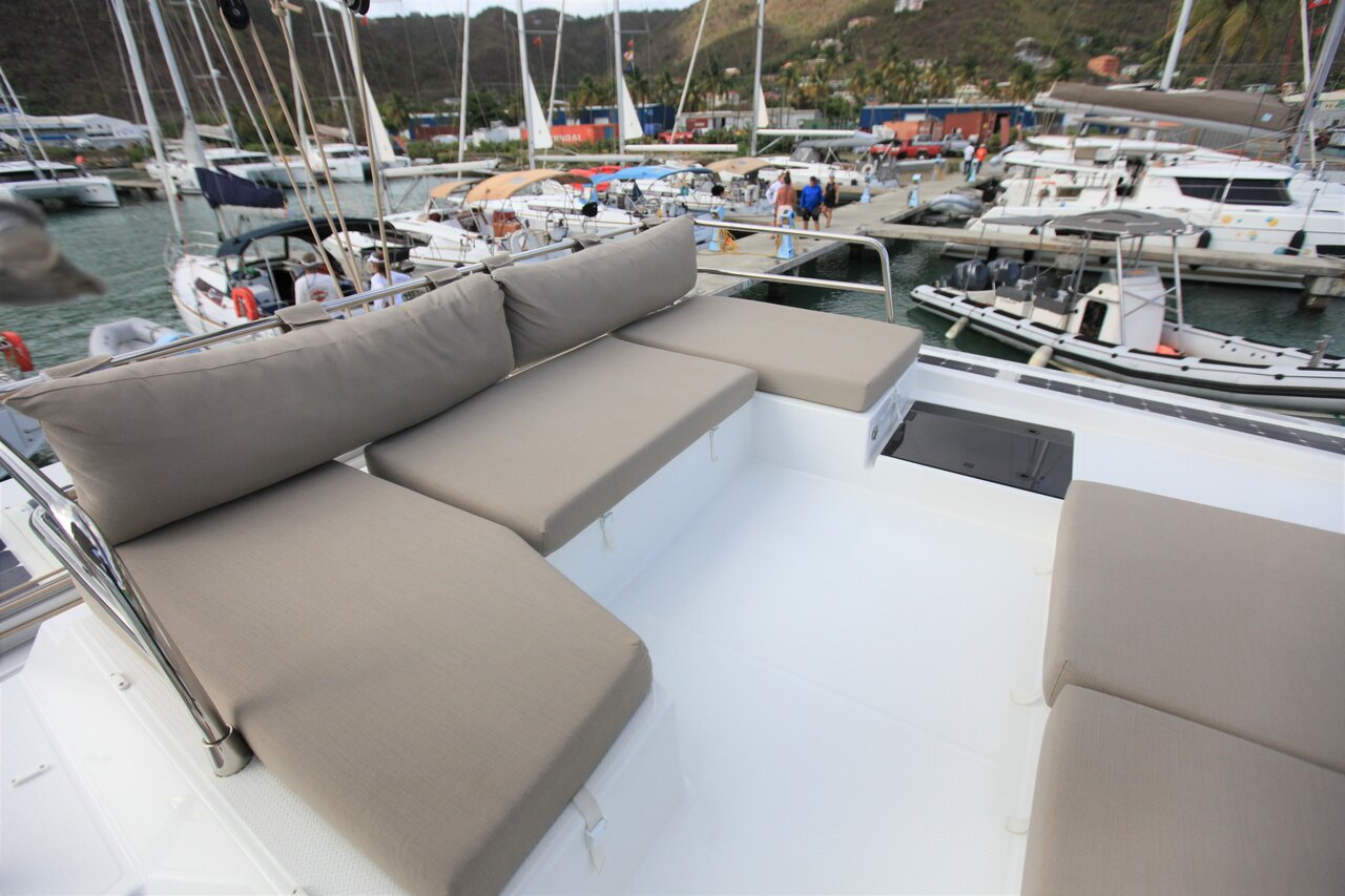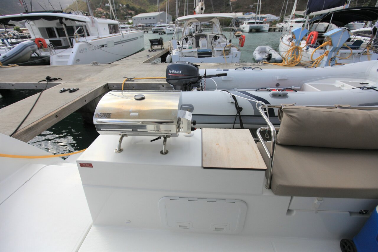 | Outside | Anker mit Kette, Badeplattform (hydr.), Biminitop, Bootshaken, Cockpitkühlschrank, Cockpitleuchte, Cockpitpolster, Deckbürste, elektr. Ankerwinsch, elektr. Großwinsch, elektr. Winsch, Fender, Festmacherleinen, Grill, Kunststoff-Eimer (Pütz), Winschen |