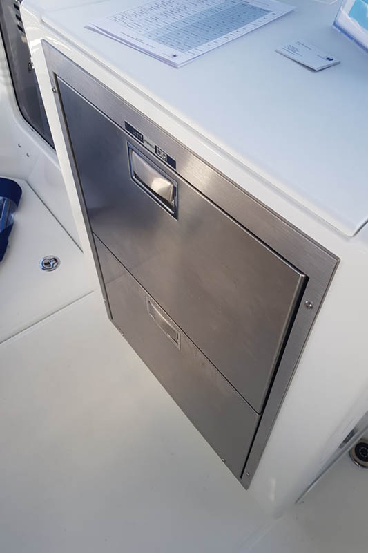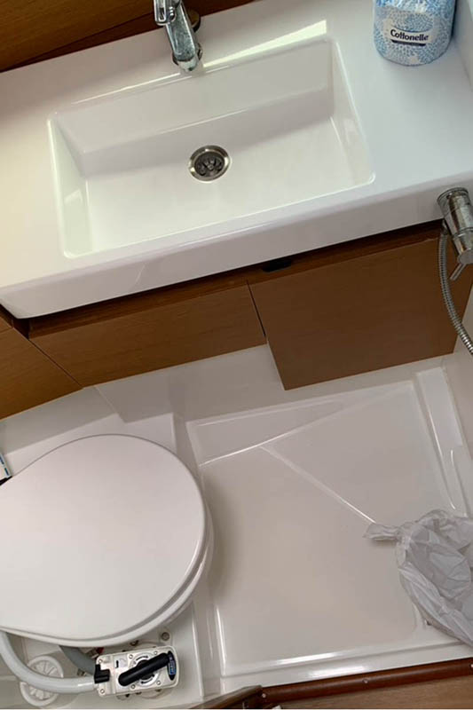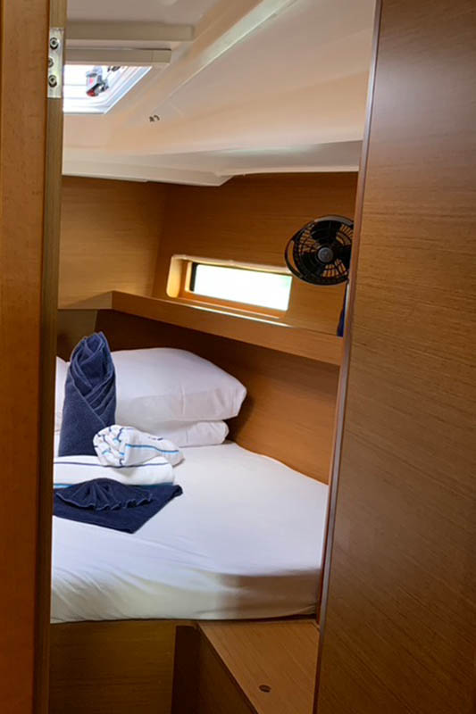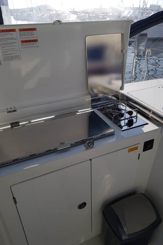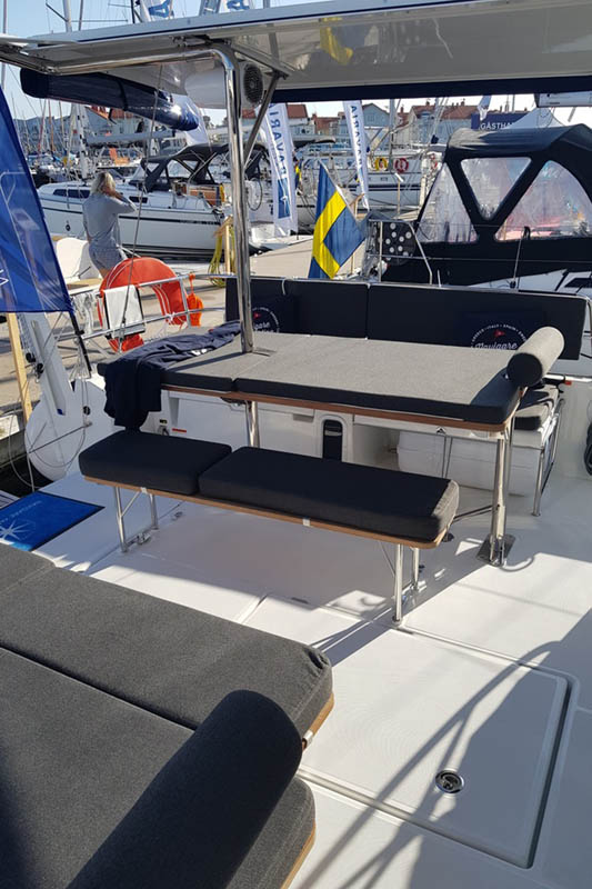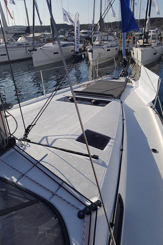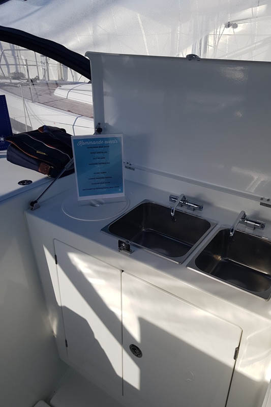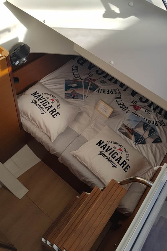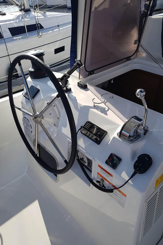 | Outside | Anker mit Kette, Badeleiter, Benzinkanister, Biminitop, Bootshaken, Cockpitdusche, Cockpitkühlschrank, Cockpitpolster, Cockpittisch, Deckbeleuchtung, Deckbürste, Deckpolster, Fender, Gangway, Grill, Kuchenbude, Kugelfender, Kunststoff-Eimer (Pütz), Pantry im Cockpit, Schnorchelausrüstung, Sprayhood, Wantenschneider, Wasserschlauch, Windex, Winschen |