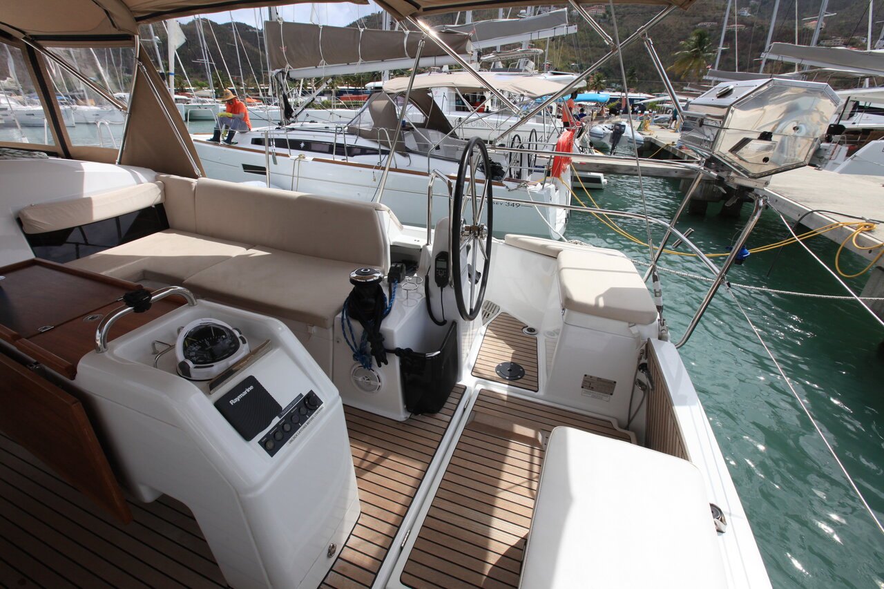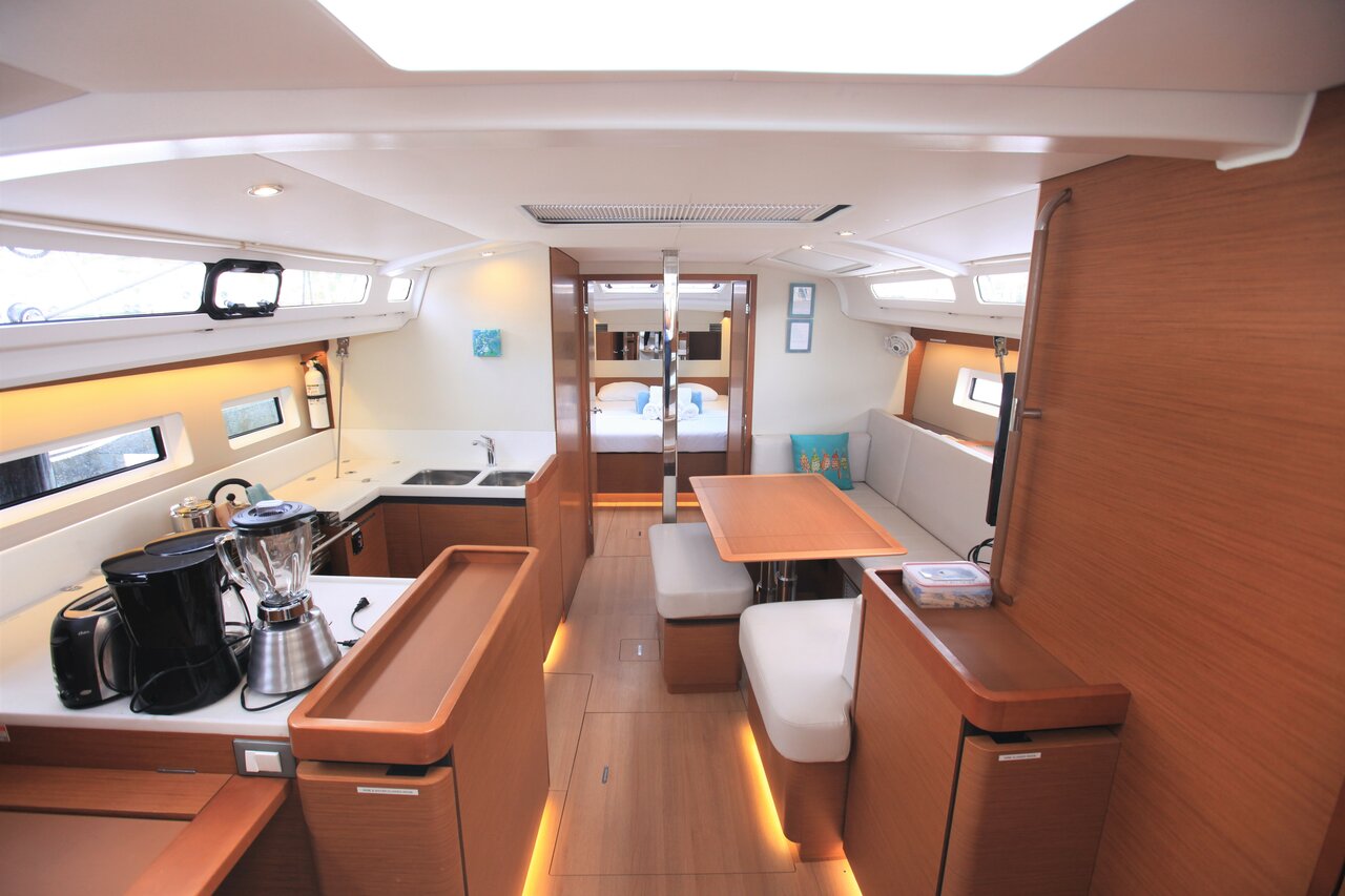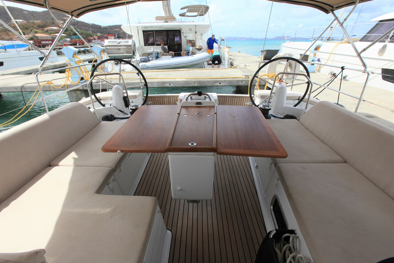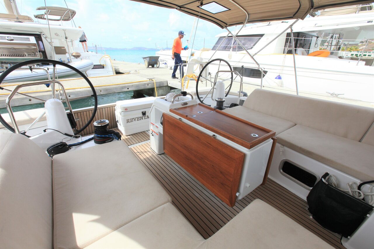 | Outside | Anker mit Kette, Biminitop, Bootshaken, Cockpitdusche, Cockpitkühlschrank, Cockpitleuchte, Cockpitpolster, Cockpittisch, Deckbürste, elektr. Ankerwinsch, Fender, Grill, Teak im Cockpit, Winschen |