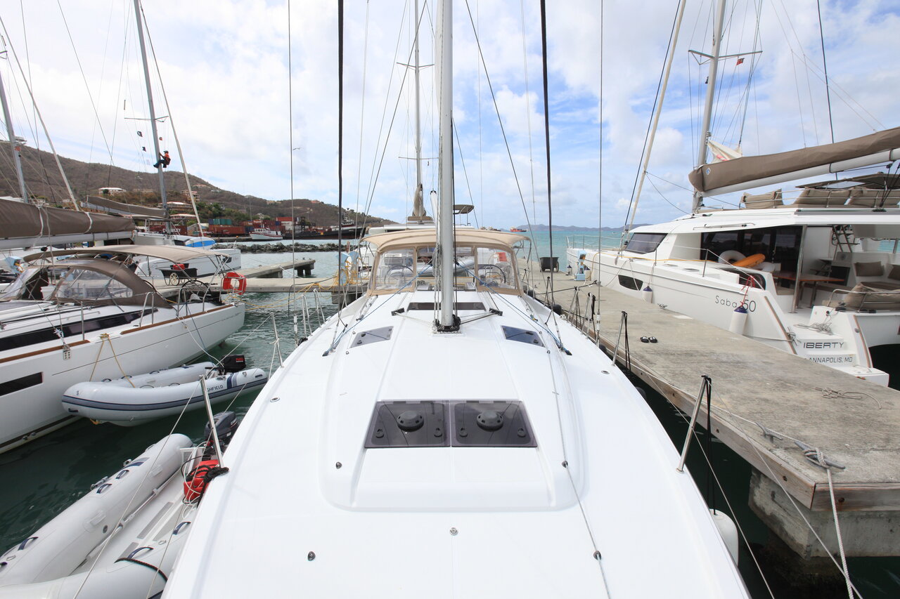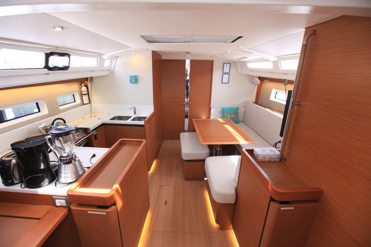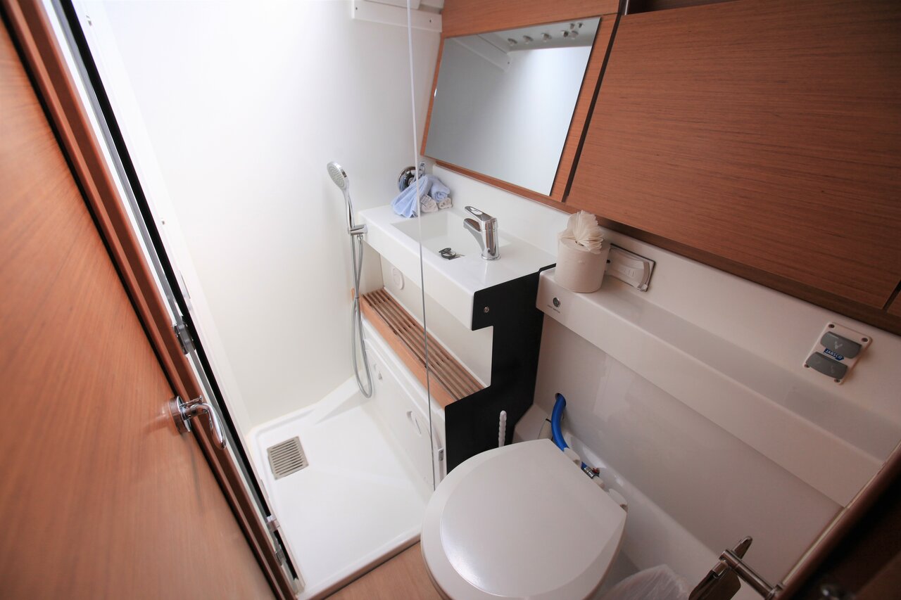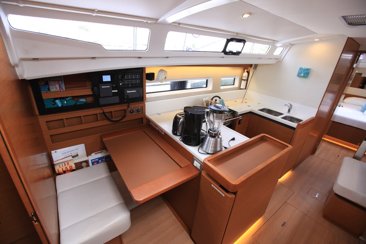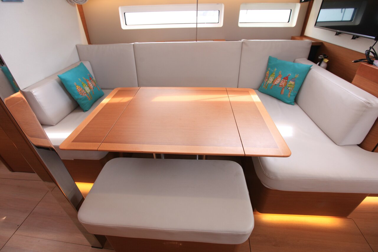 | Outside | Anker mit Kette, Biminitop, Bootshaken, Cockpitdusche, Cockpitkühlschrank, Cockpitleuchte, Cockpitpolster, Cockpittisch, Deckbürste, elektr. Ankerwinsch, Fender, Grill, Teak im Cockpit, Winschen |