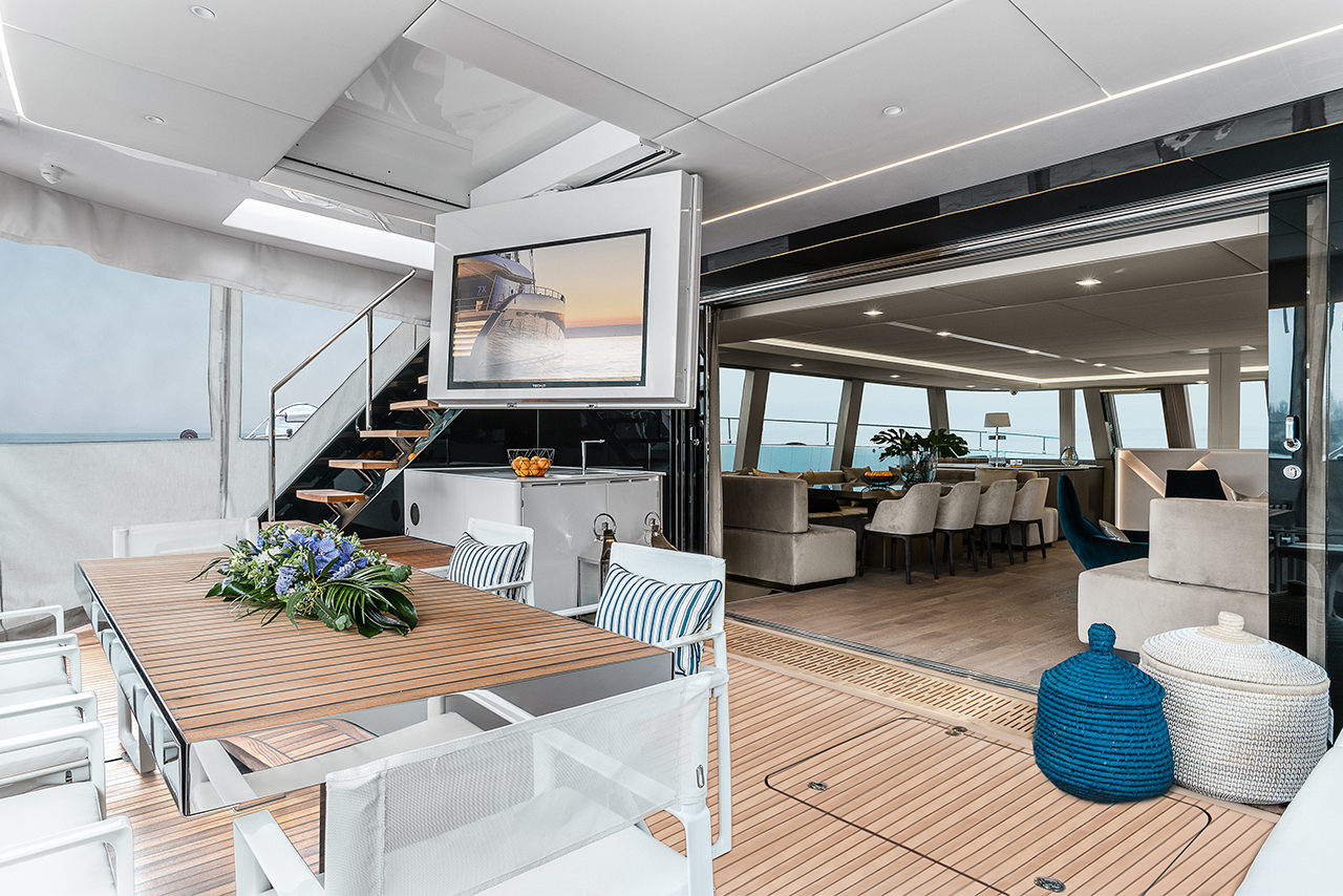 | Inside | Fön, Generator, Inverter 12V/220V, Klimaanlage (ohne Landstrombedarf), Pantryausstattung, Sound System, TV, Watermaker, WC (elektr.) |