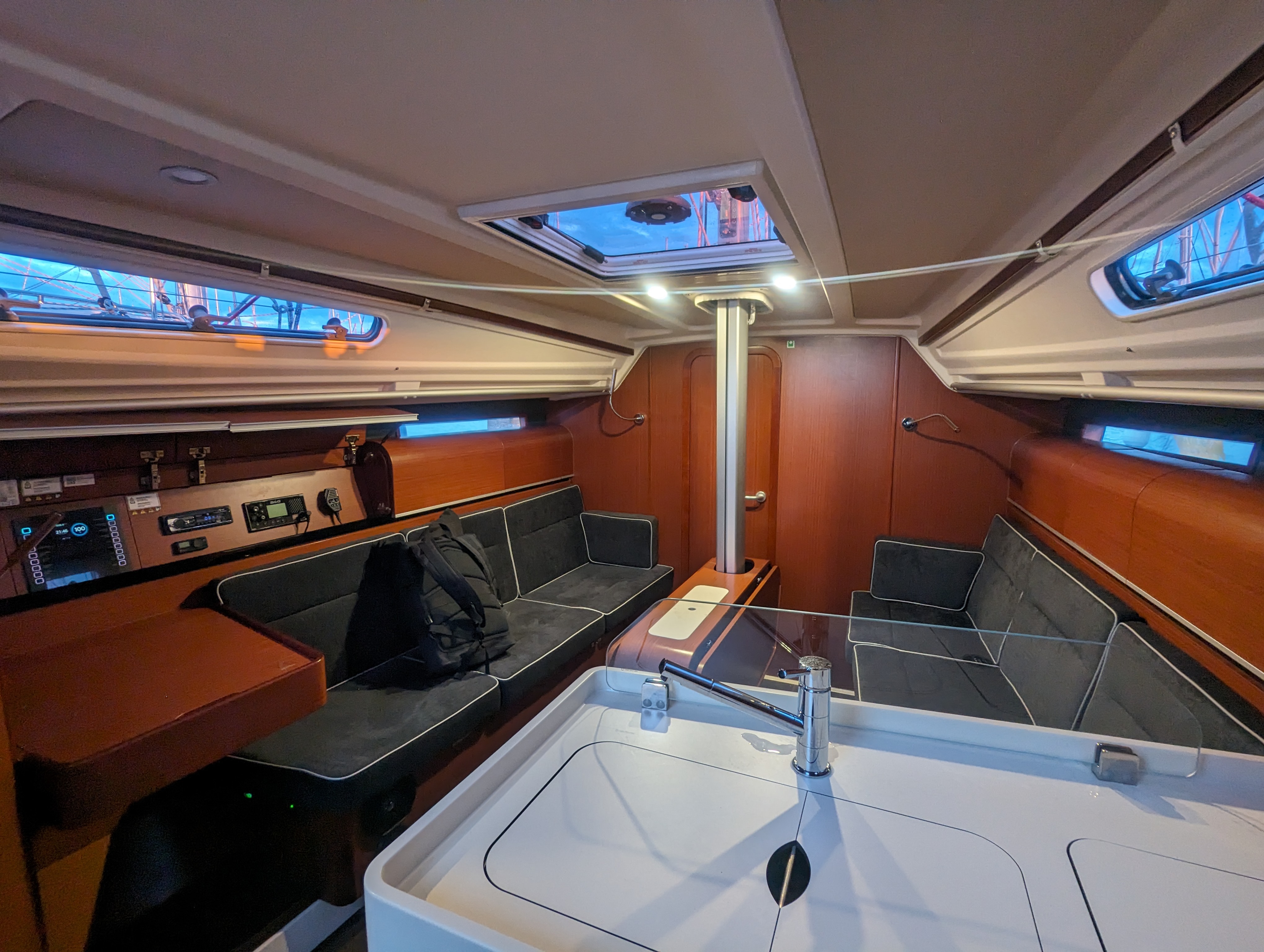 | Safety | Automatikwesten, Autopilot, Bootsmannstuhl, elektr. Bilgepumpe, Feuerlöscher, Handbilgepumpe, Lifebelts, Nebelhorn, Notsignale, Rettungsinsel, Rettungsring, Taschenlampe, UKW-Funk m. DSC |