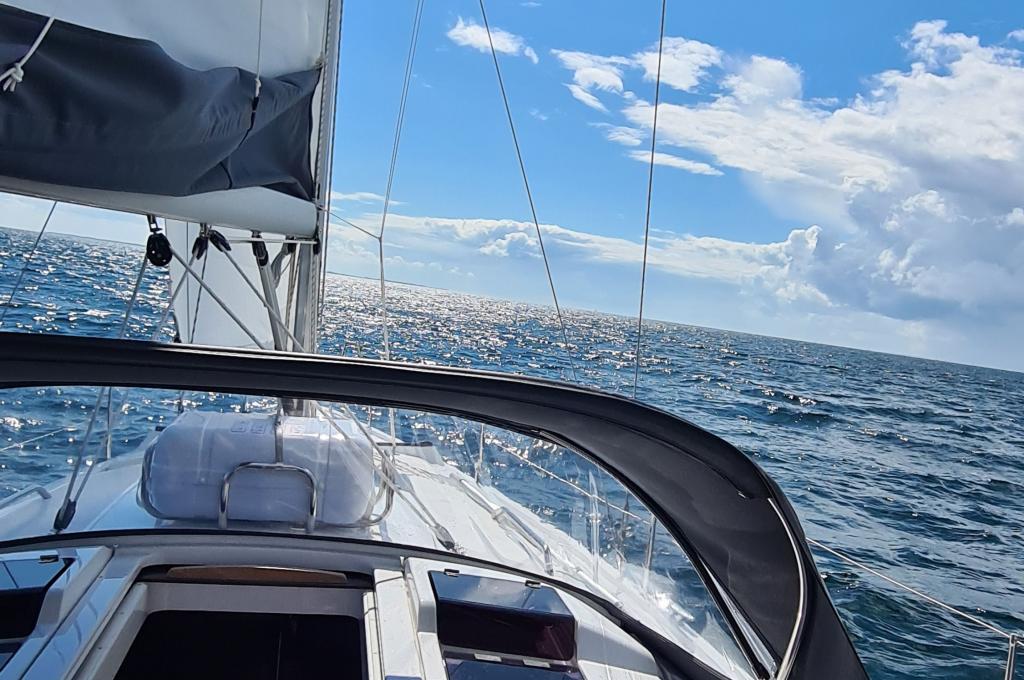 Outside 220 V-Landanschluss, Bootshaken, Delta-Anker, Fallwinschen, Fender, Festmacherleinen, Genuawinschen, selbstholend, Heckanker, Sprayhood, Windex