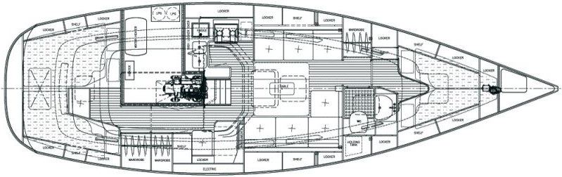 | Safety | Ankerball, Automatikwesten, Autopilot, Bordapotheke, Bugstrahlruder, elektr. Bilgepumpe, Feuerlöscher, Flaggen, Handbilgepumpe, Leuchtboje, Lifebelts, Nebelhorn, Notpinne, Notsignale, Radarreflektor, Rettungsinsel, Rettungsring, Sicherheitsgurt, UKW-Funk |