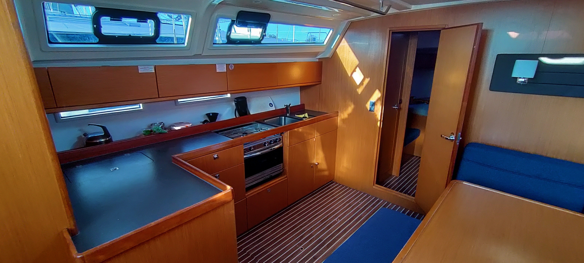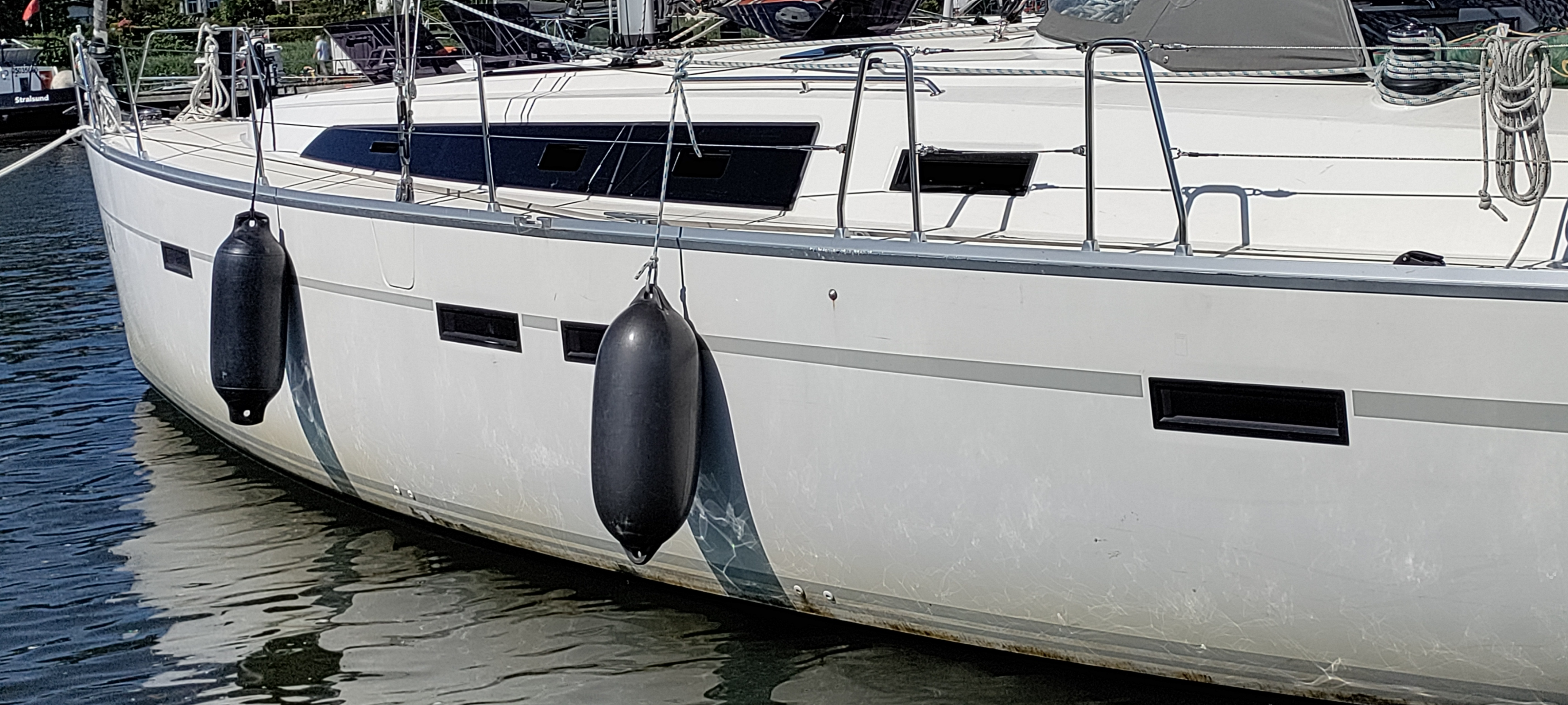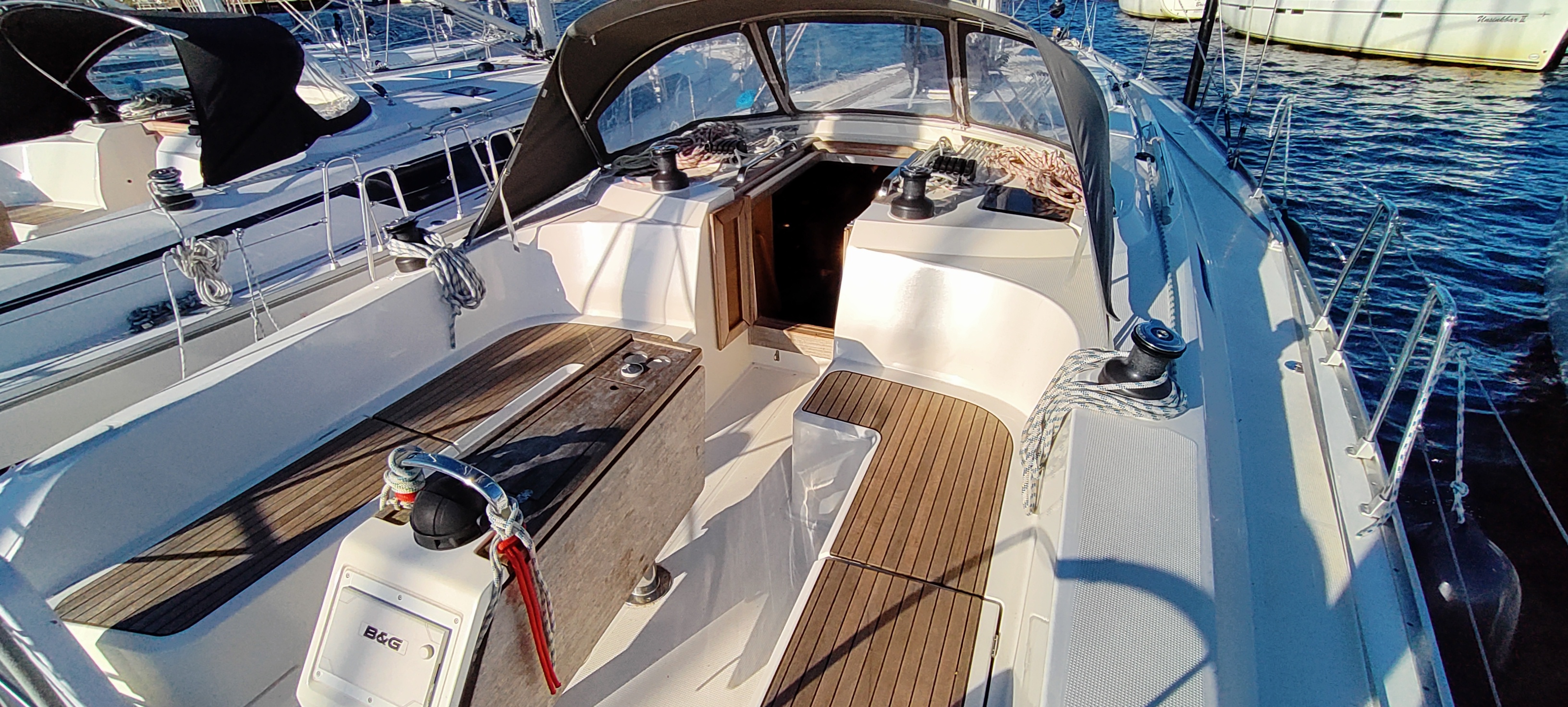 | Outside | 220 V-Landanschluss, Anker mit Kette, Außendusche, Badeleiter, Bootshaken, CQR-Anker, elektr. Ankerwinsch, Fallwinschen, selbstholend, Fender, Festmacherleinen, Genuawinschen, selbstholend, Heckanker, Sprayhood, Windex |