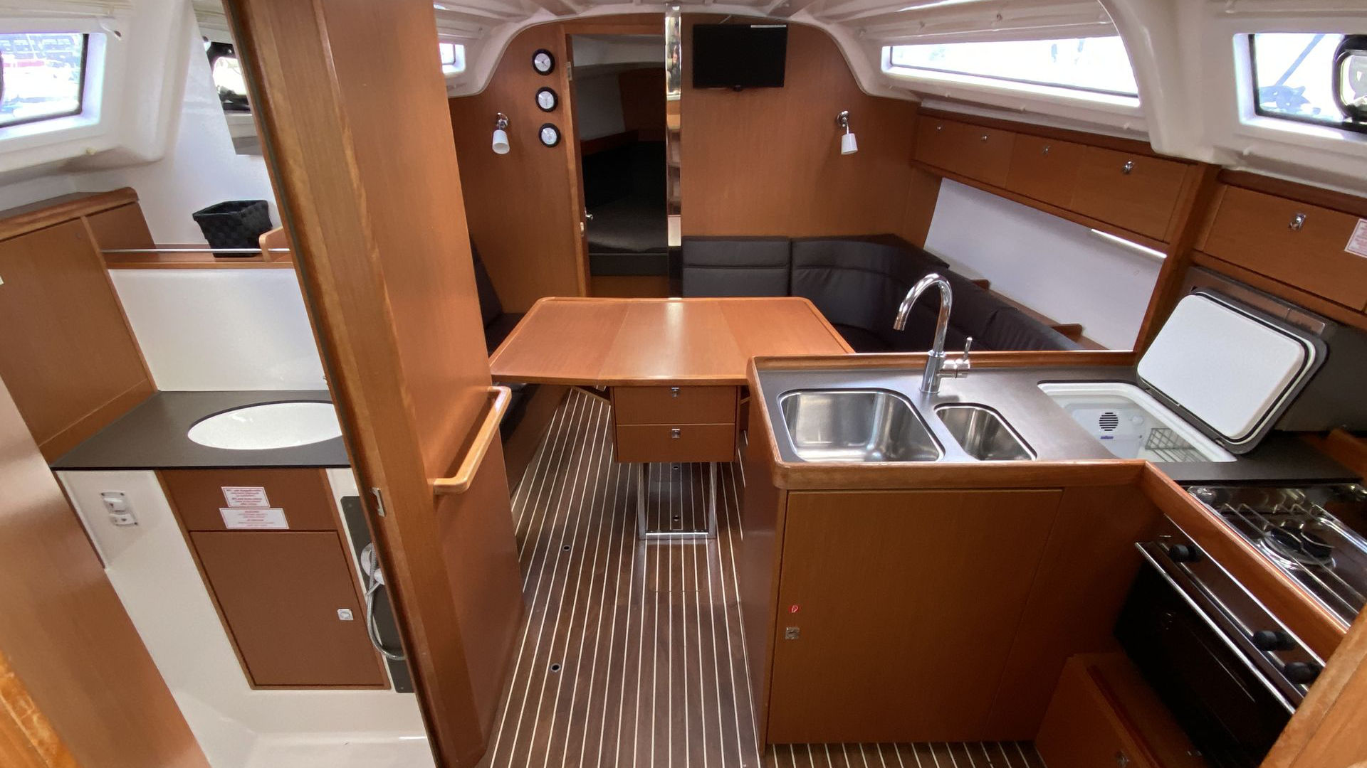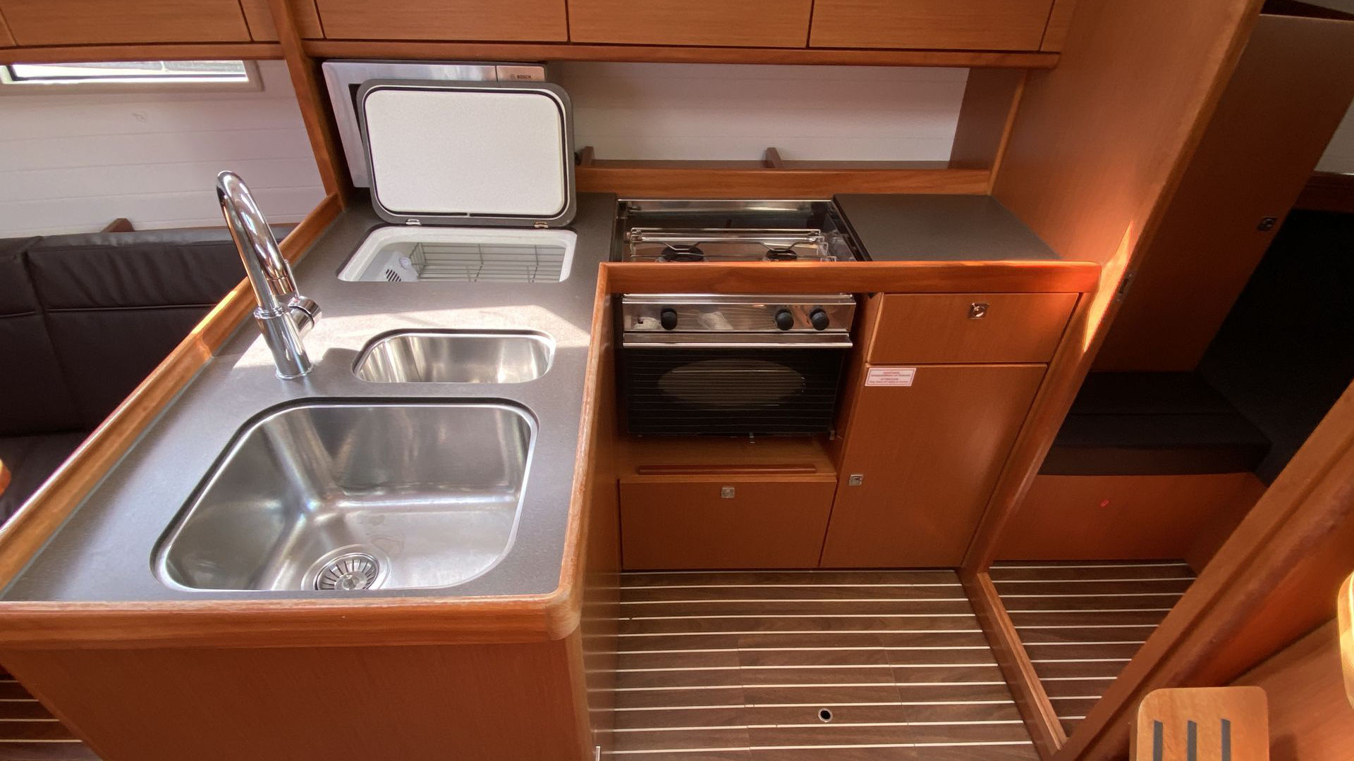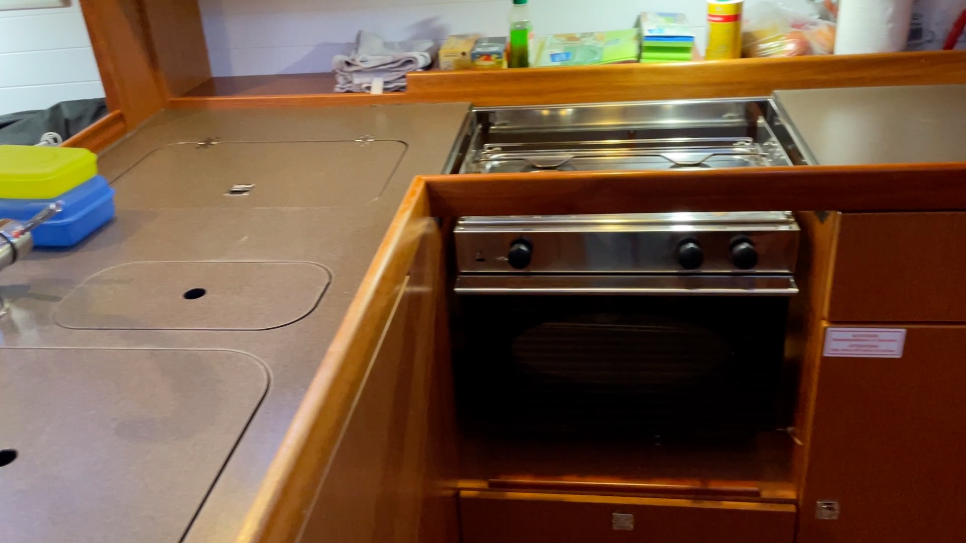Inside 2-flammiger Gasherd, 220V Steckdosen, Backofen, Borduhr, Diesel-Heizung, Druckwasser, elektrische Kühlbox, Ladegerät, Landstromkabel, LCD Fernseher + DVD, Pantryausstattung, Spülbecken, Warmwasser