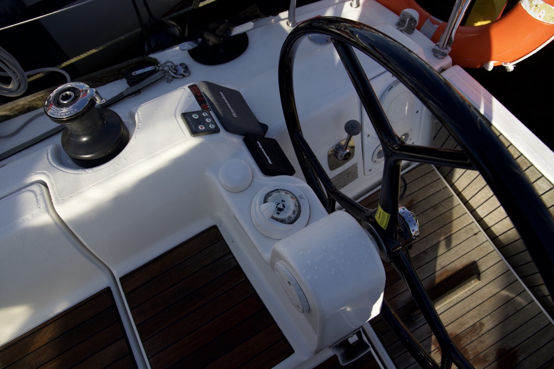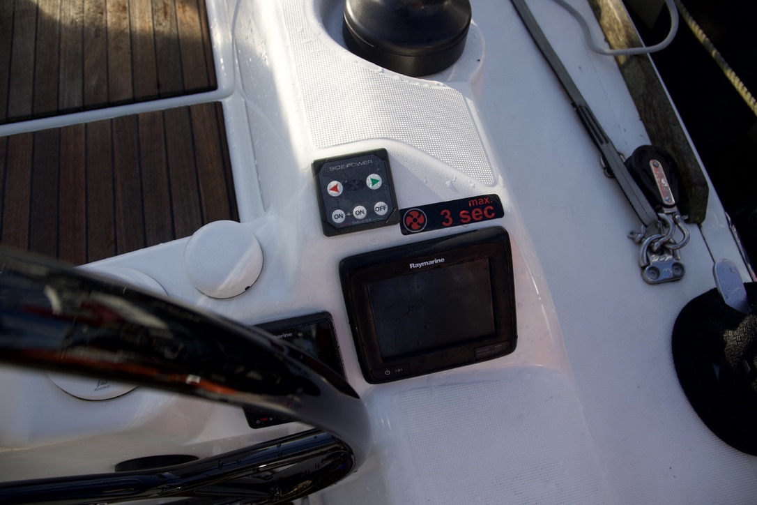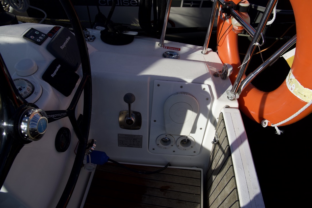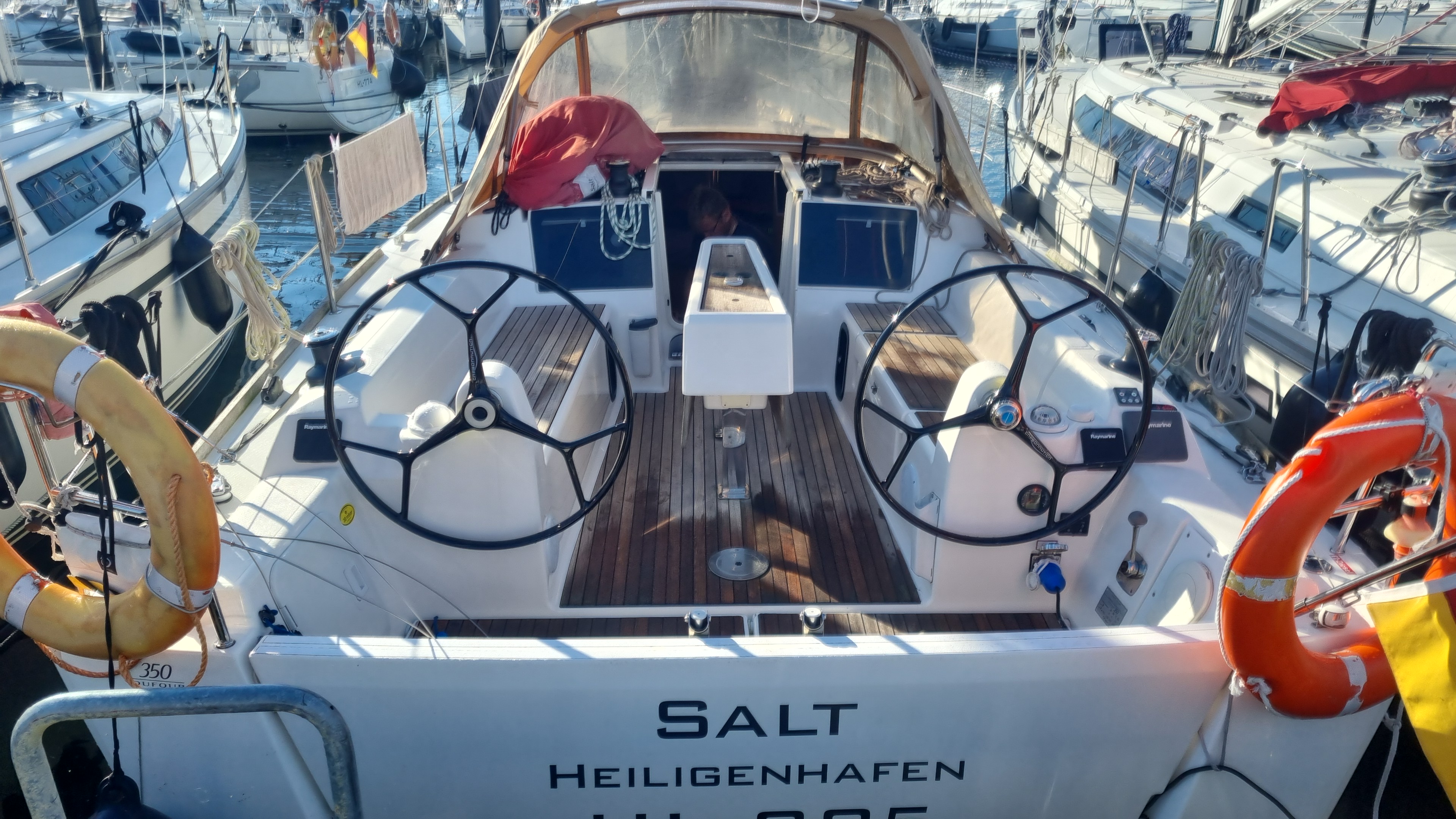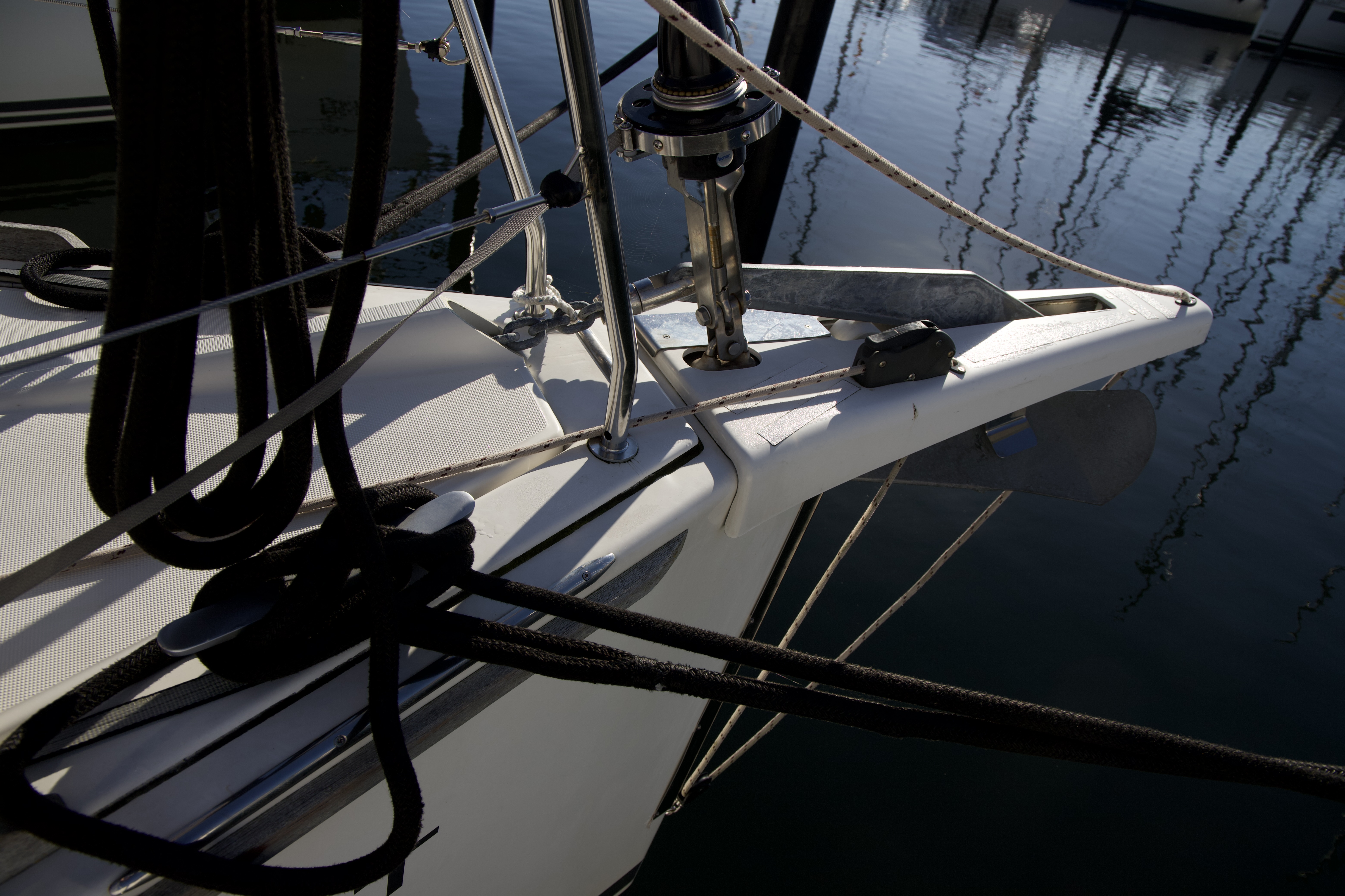 Outside Badeplattform, Bootshaken, Bugspriet, Cockpitlautsprecher, Cockpittisch, Deckbürste, elektr. Ankerwinsch, Fender, Festmacherleinen, Seereling, Sprayhood, Teak auf Badeplattform, Teak im Cockpit, Wantenschneider