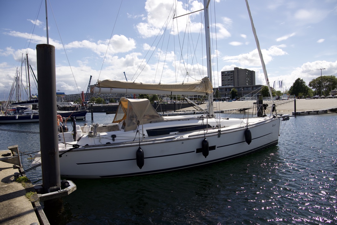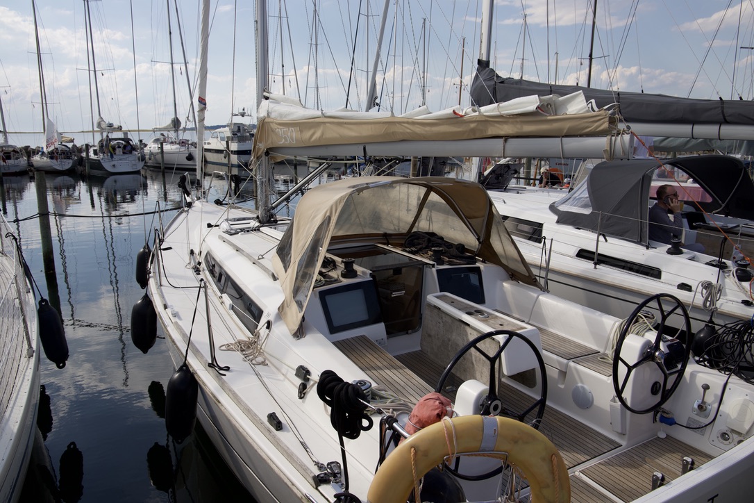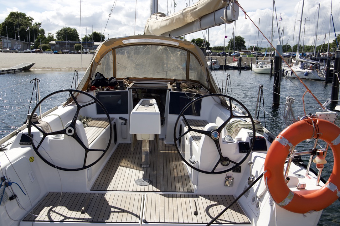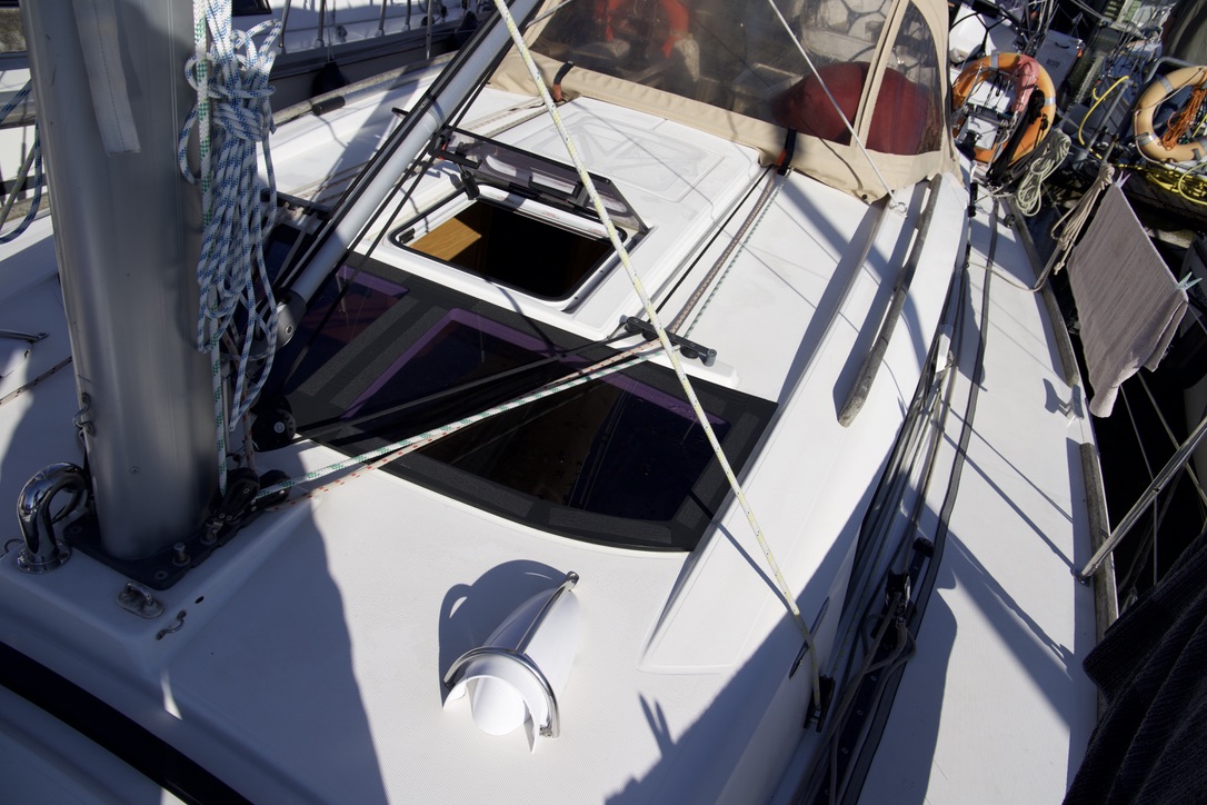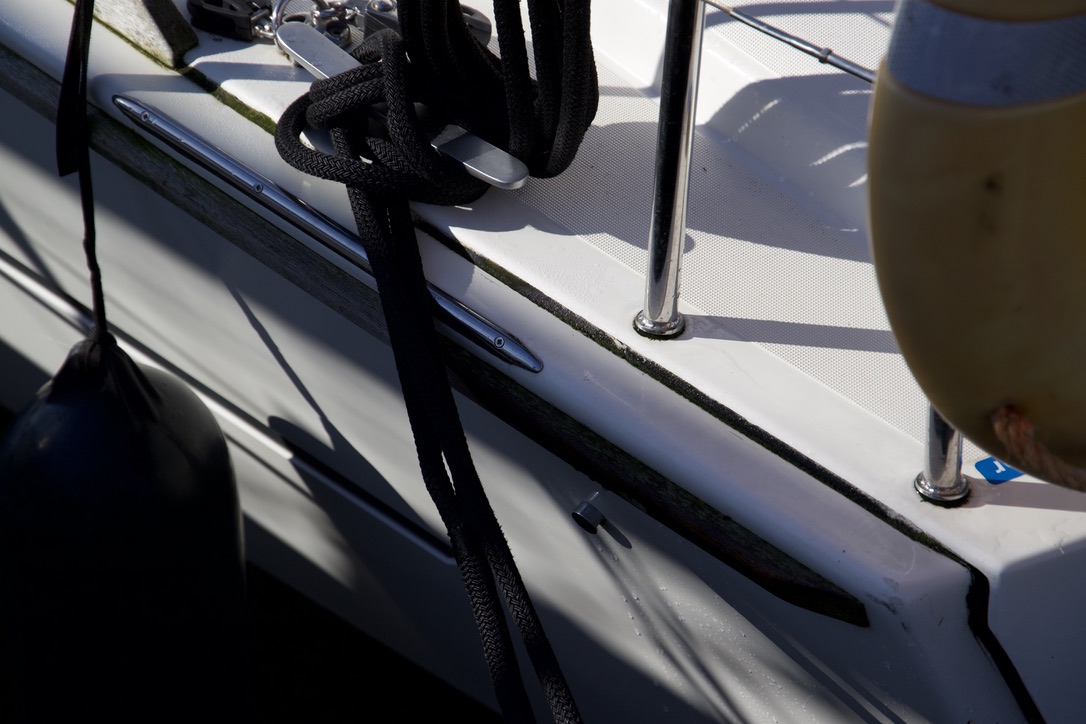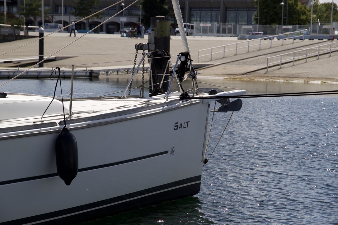 Outside Badeplattform, Bootshaken, Bugspriet, Cockpitlautsprecher, Cockpittisch, Deckbürste, elektr. Ankerwinsch, Fender, Festmacherleinen, Seereling, Sprayhood, Teak auf Badeplattform, Teak im Cockpit, Wantenschneider