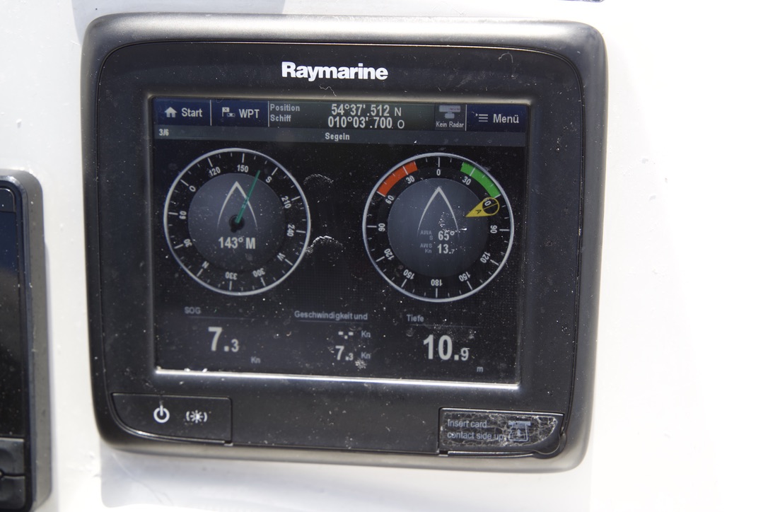 Navigation Echolot, Fernglas, GPS mit Farbkartenplotter im Cockpit, Handpeilkompass, Navigationsbesteck, Steuerkompass, Sumlog, Tablet-PC am Kartentisch, Windmesser