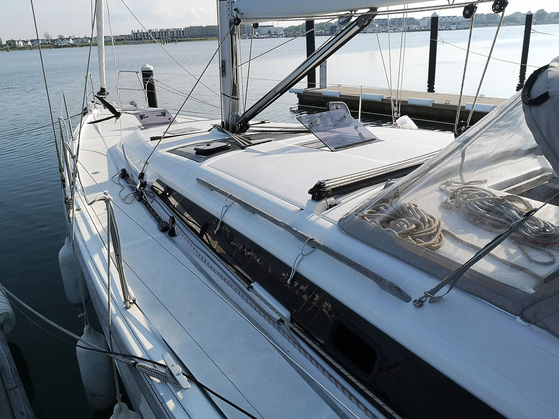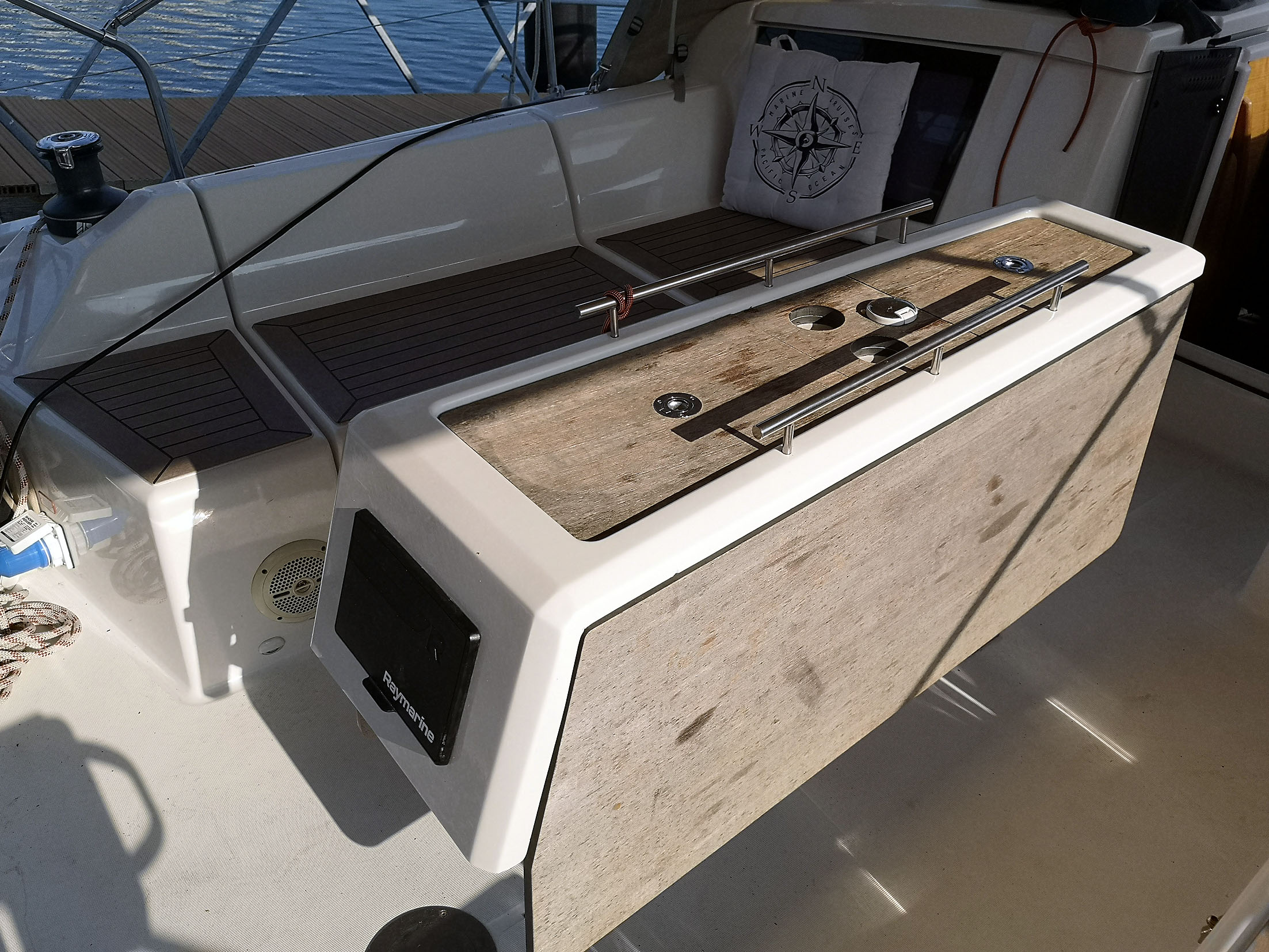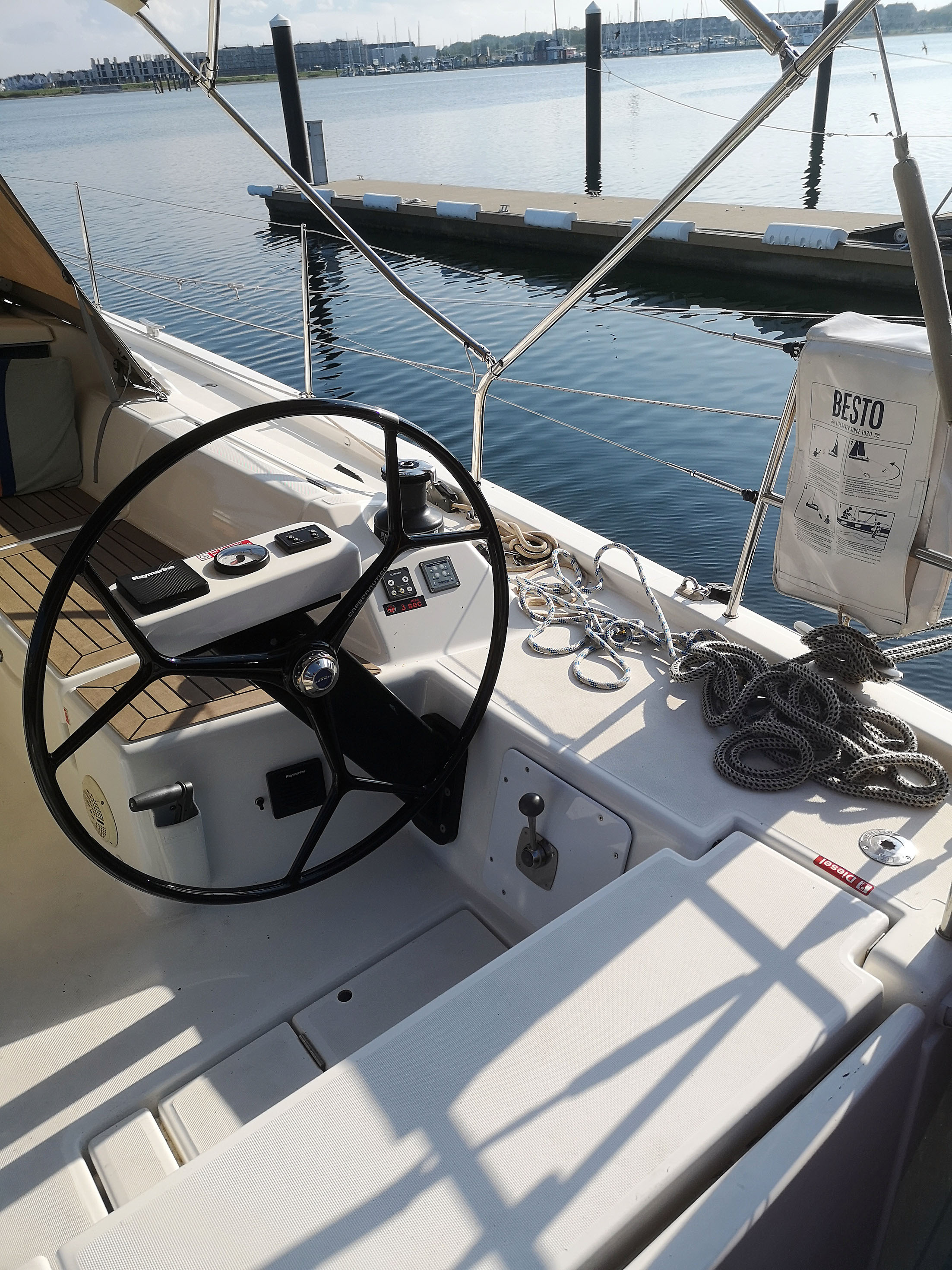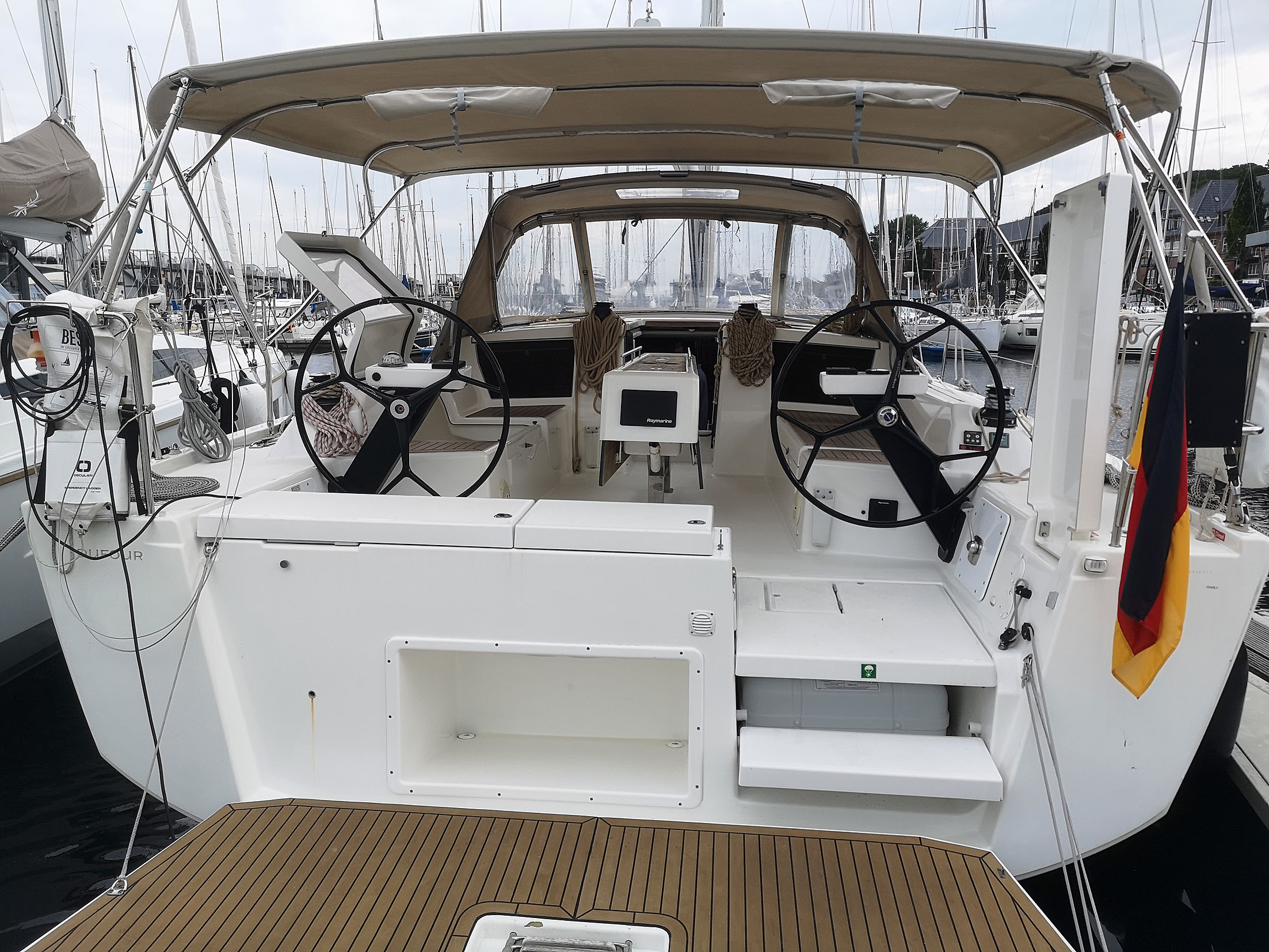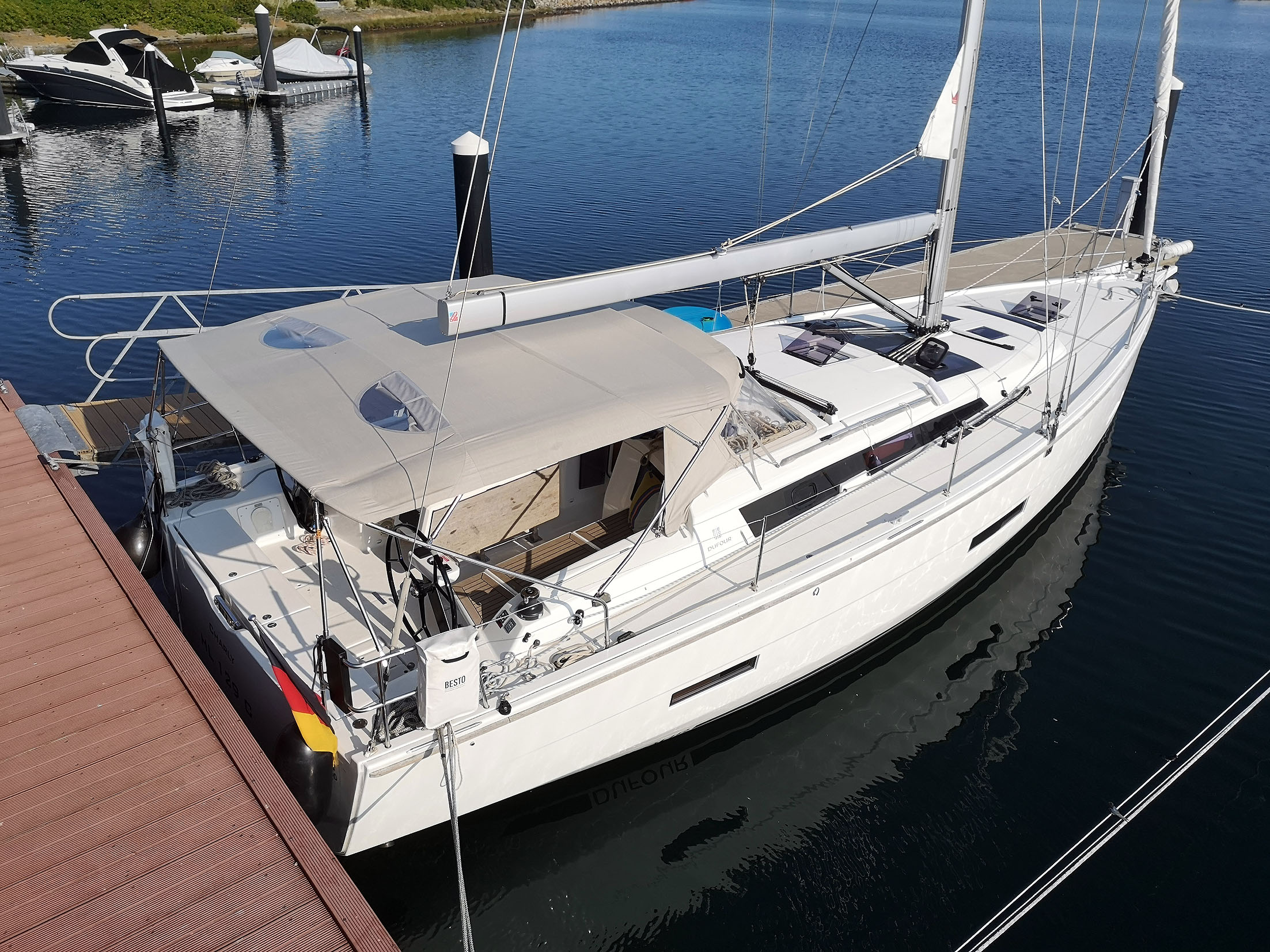 | Outside | Anker mit Kette, Biminitop, Bootshaken, Bugspriet, Cockpitlautsprecher, Cockpittisch, Deckbürste, elektr. Ankerwinsch, Fender, Fernsteuerung für elektr. Ankerwinsch, Festmacherleinen, Grill, Sprayhood, Teak im Cockpit, Wantenschneider |