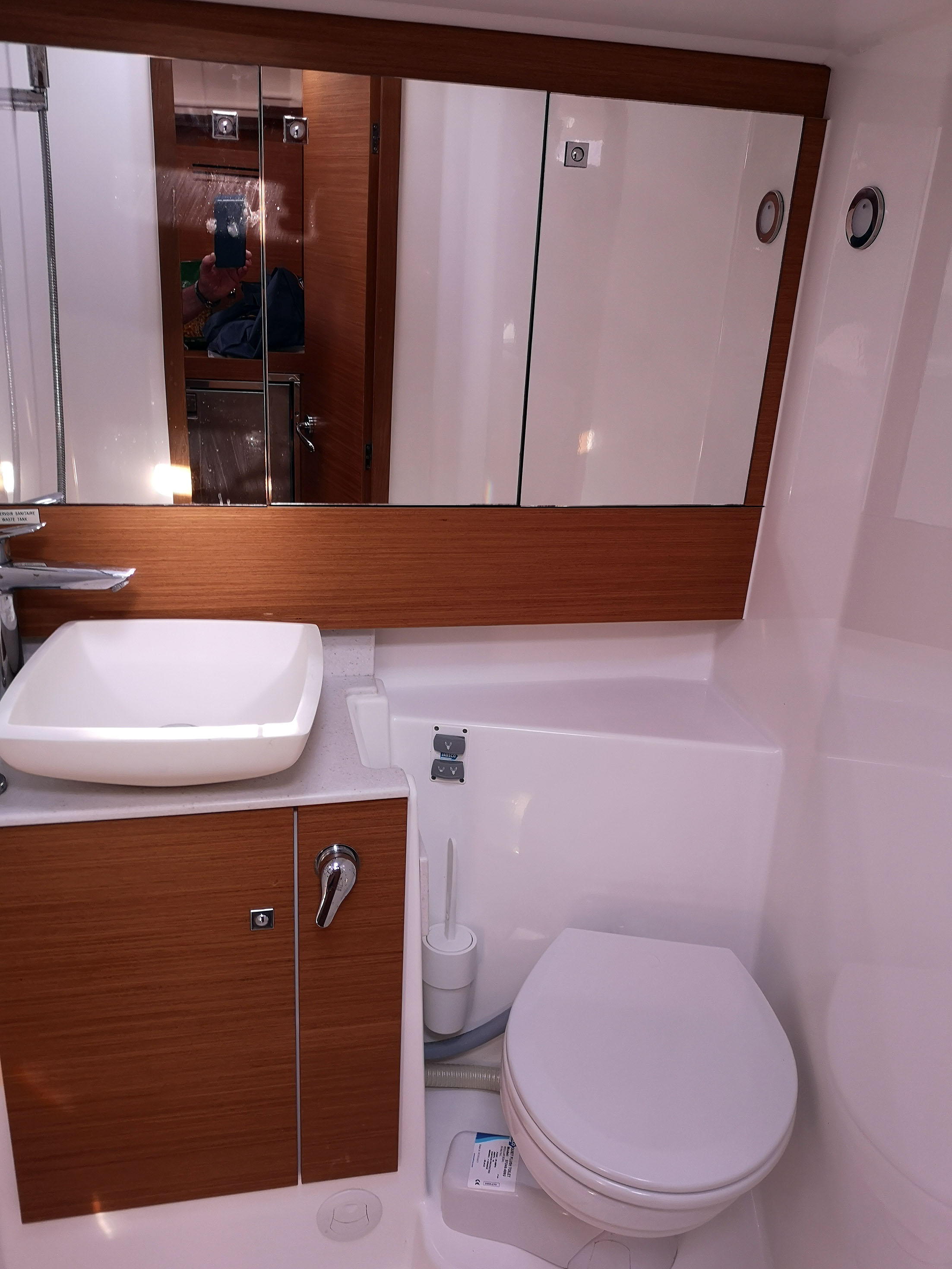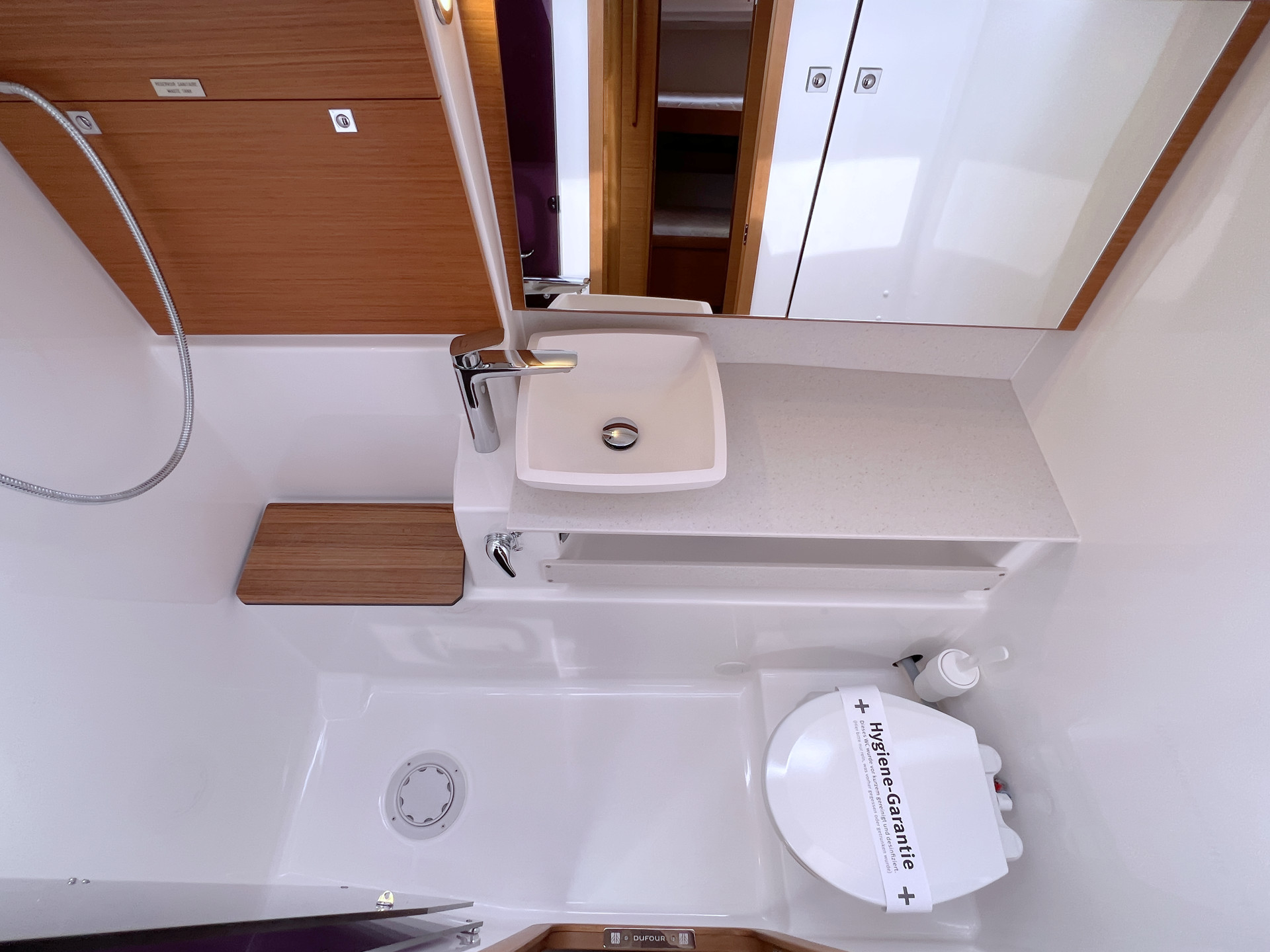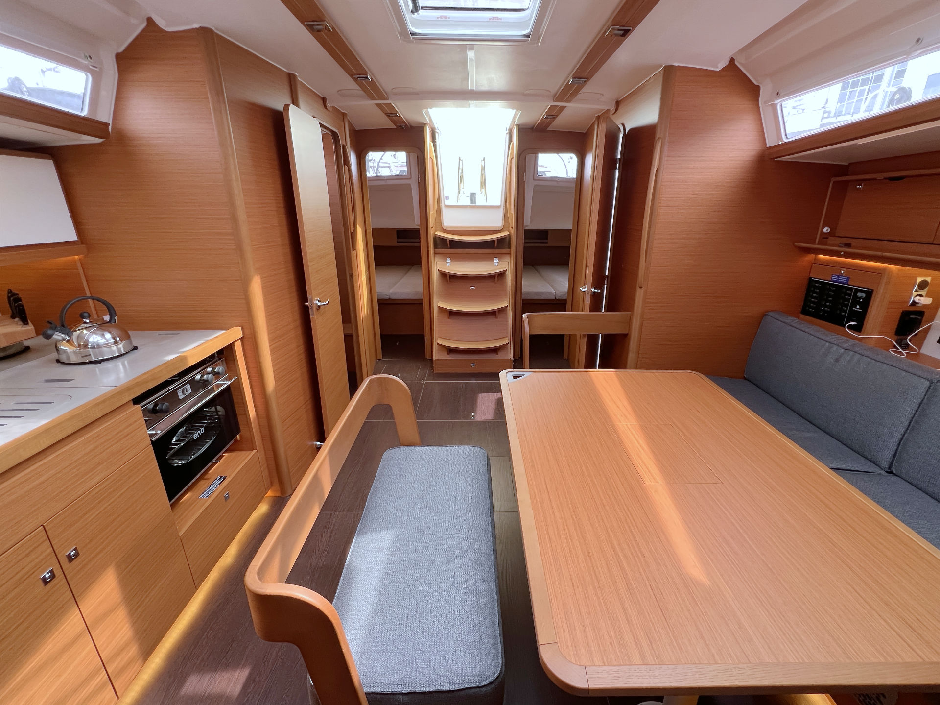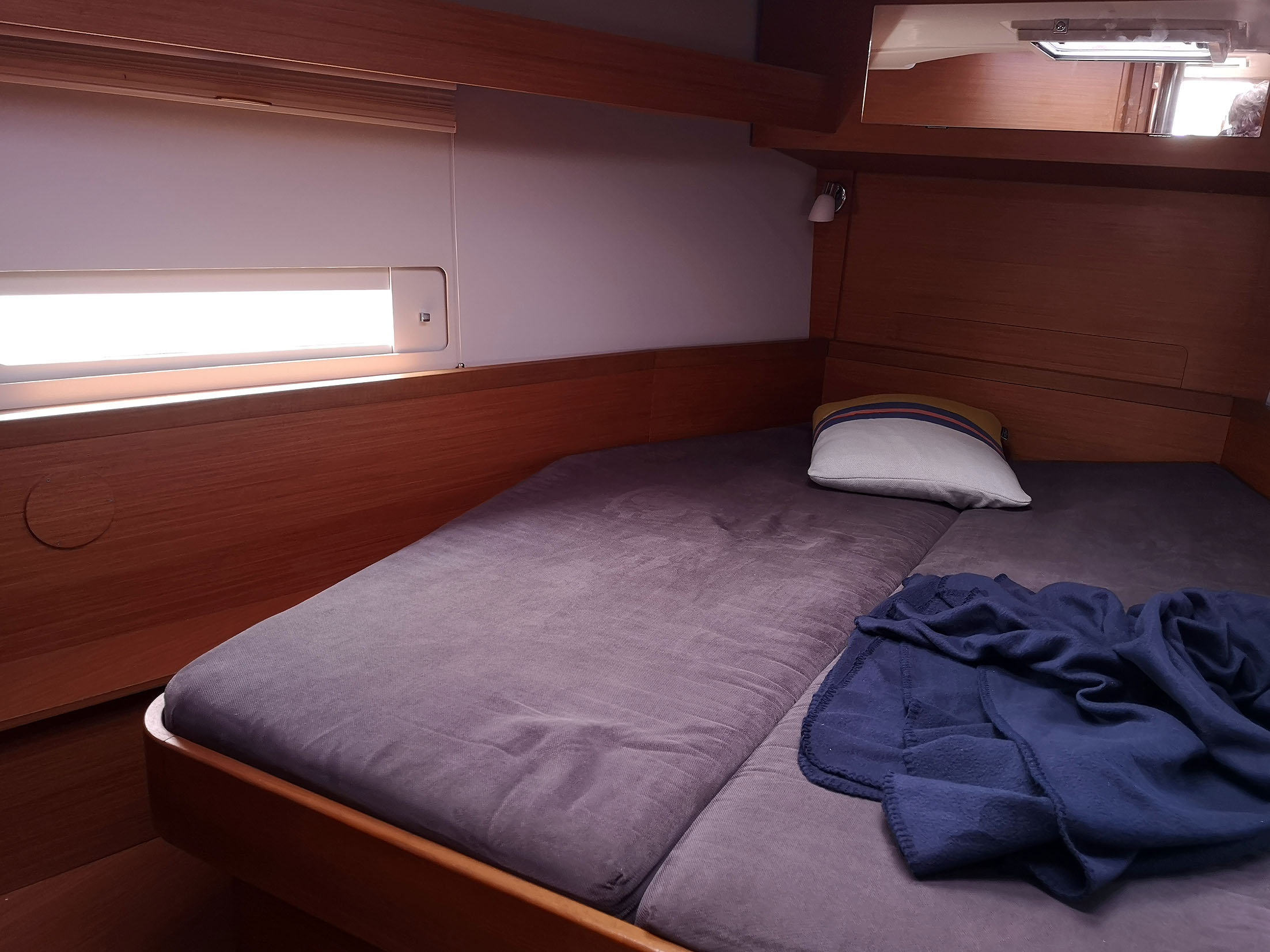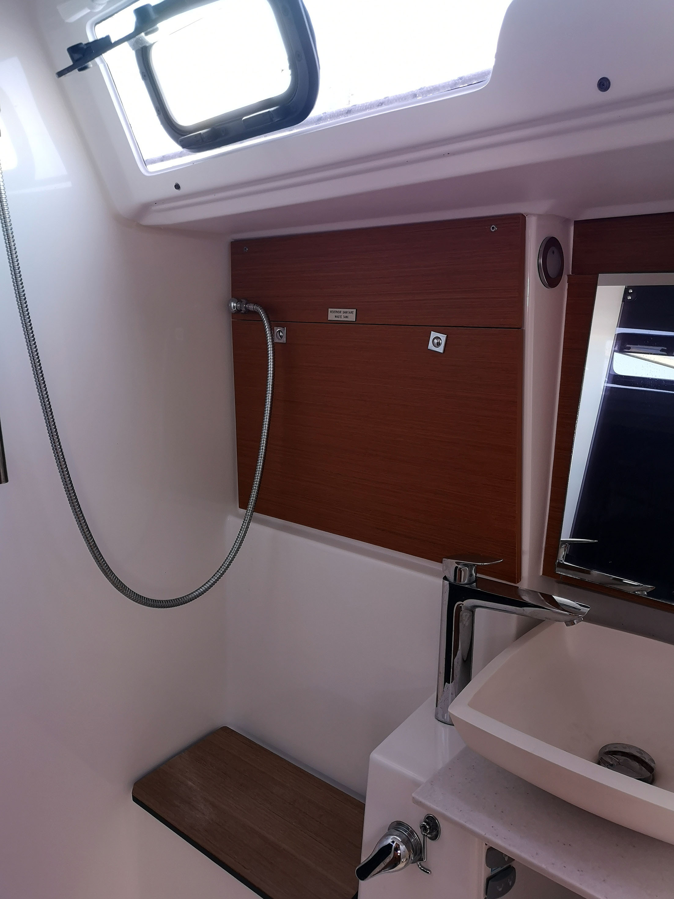 | Outside | Anker mit Kette, Biminitop, Bootshaken, Bugspriet, Cockpitlautsprecher, Cockpittisch, Deckbürste, elektr. Ankerwinsch, Fender, Fernsteuerung für elektr. Ankerwinsch, Festmacherleinen, Grill, Sprayhood, Teak im Cockpit, Wantenschneider |