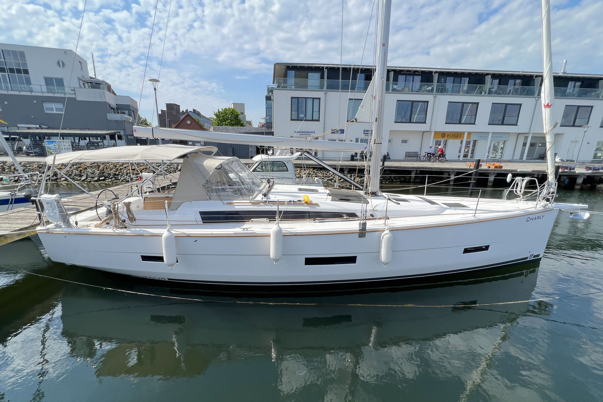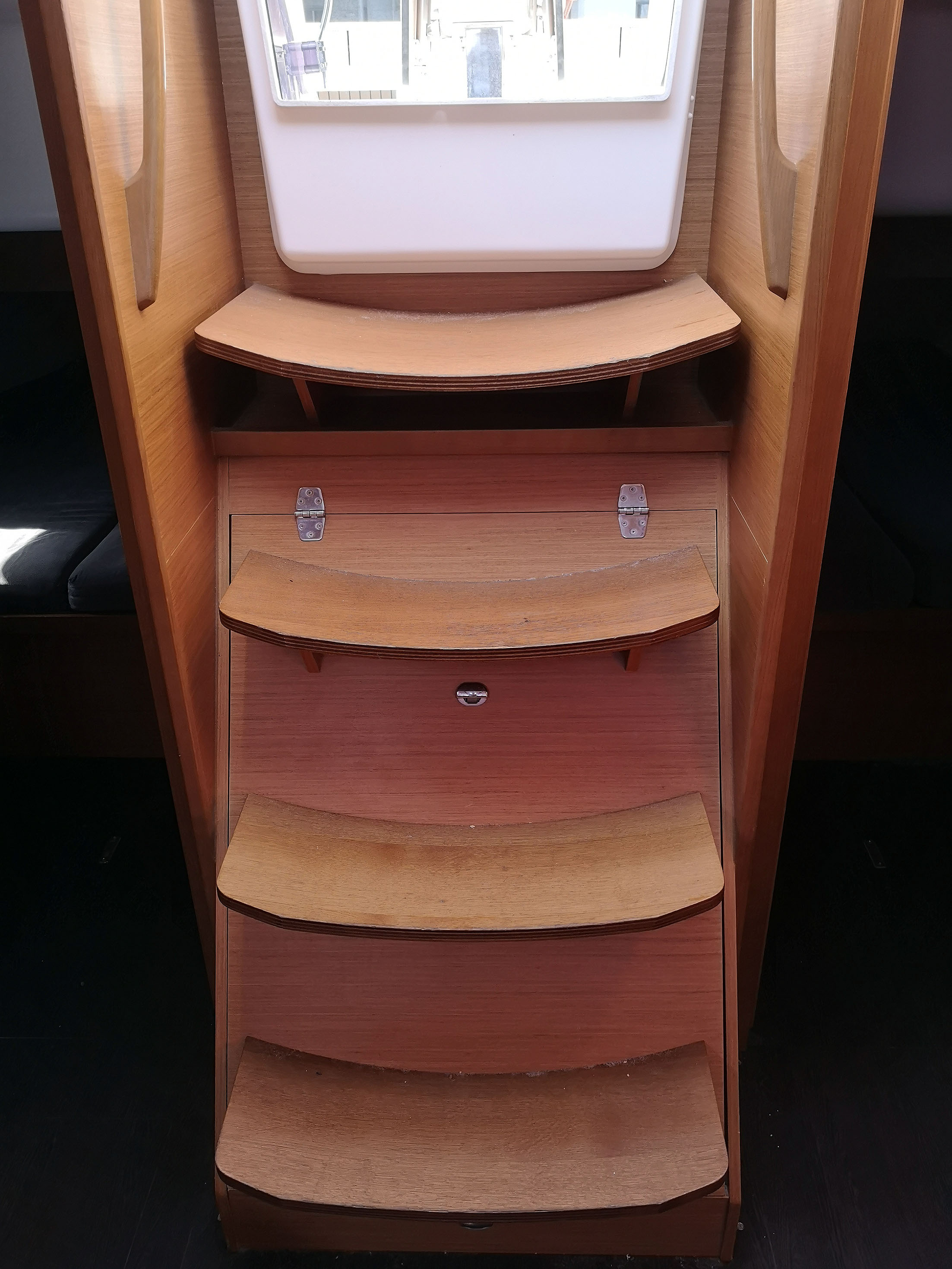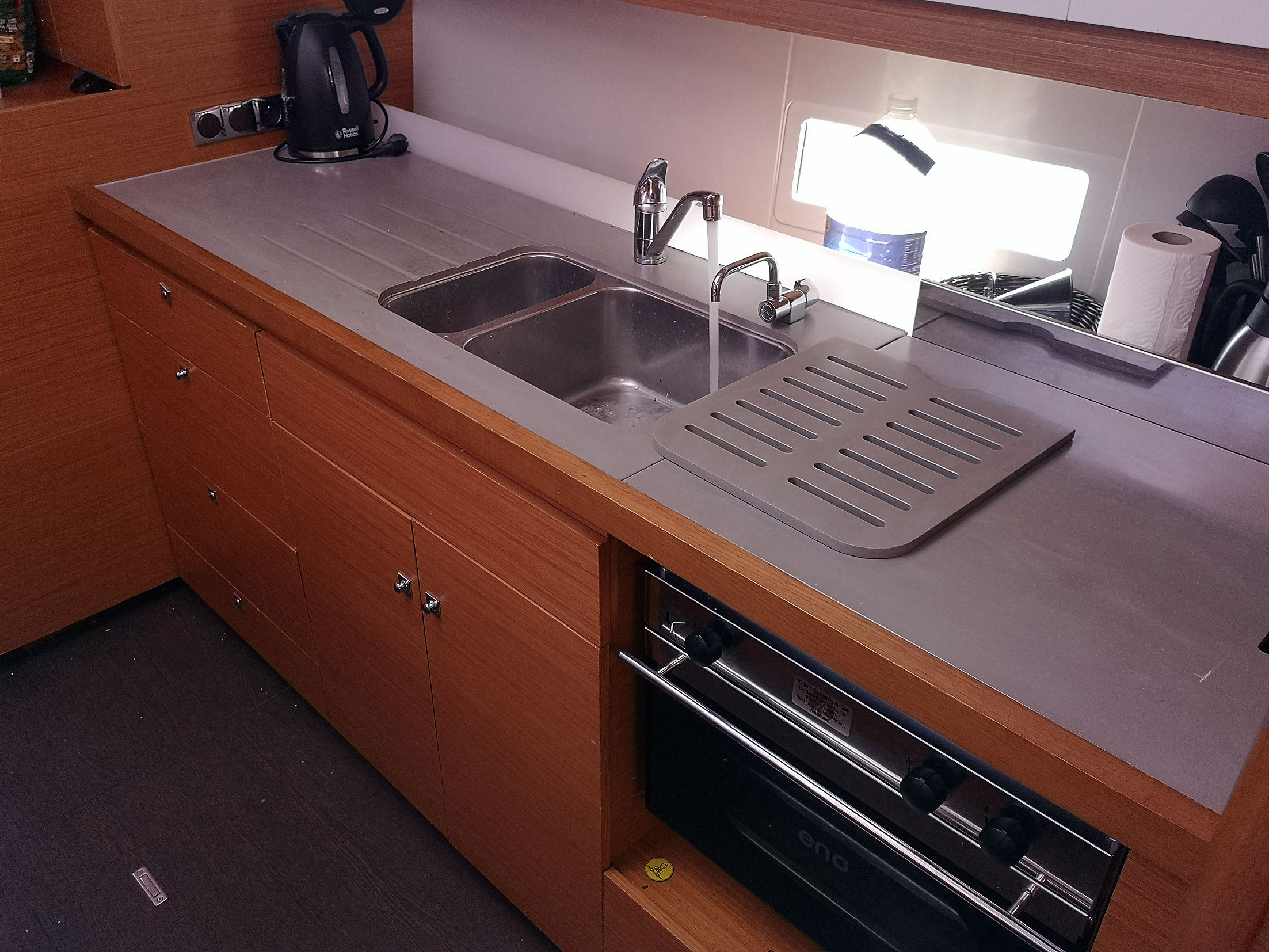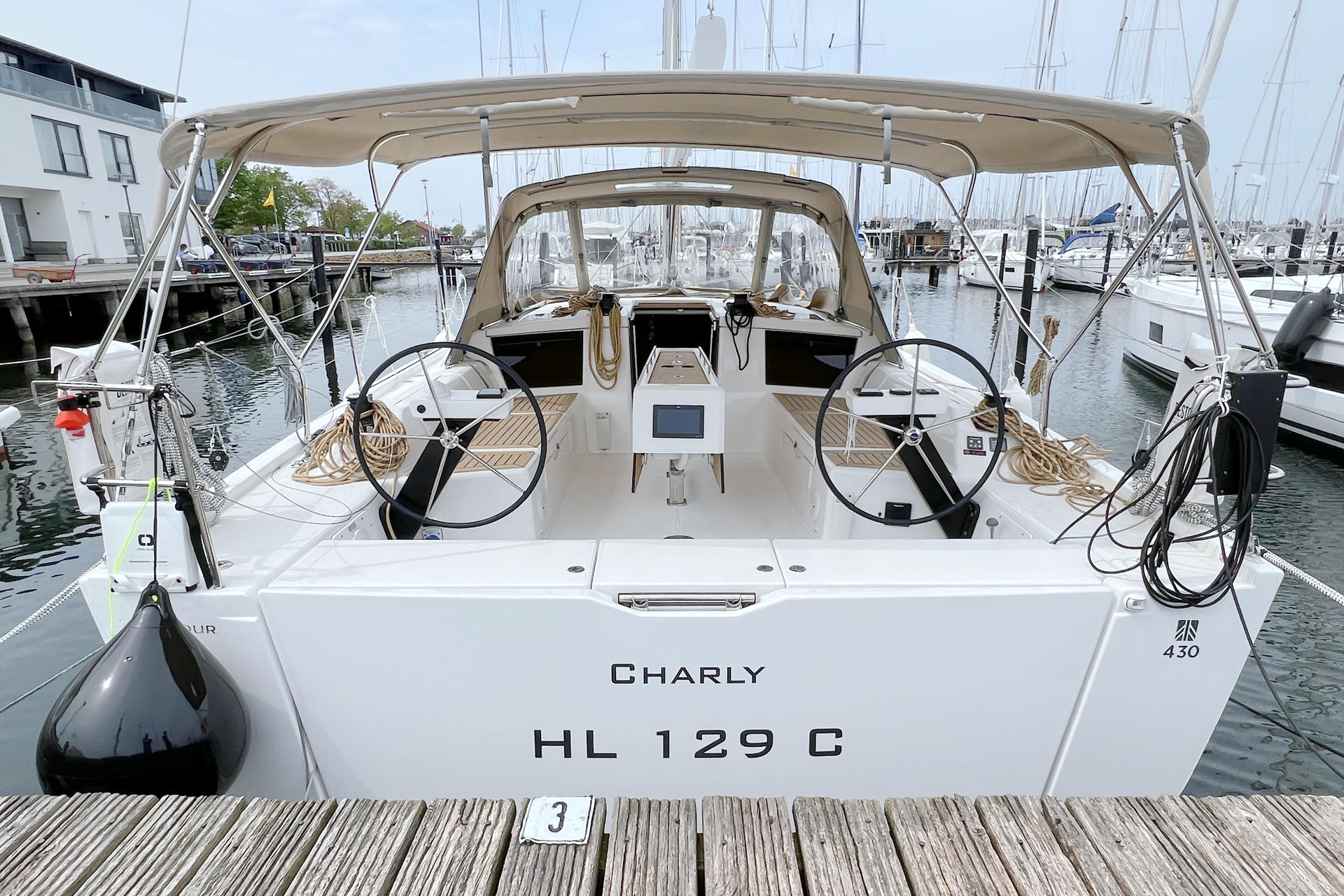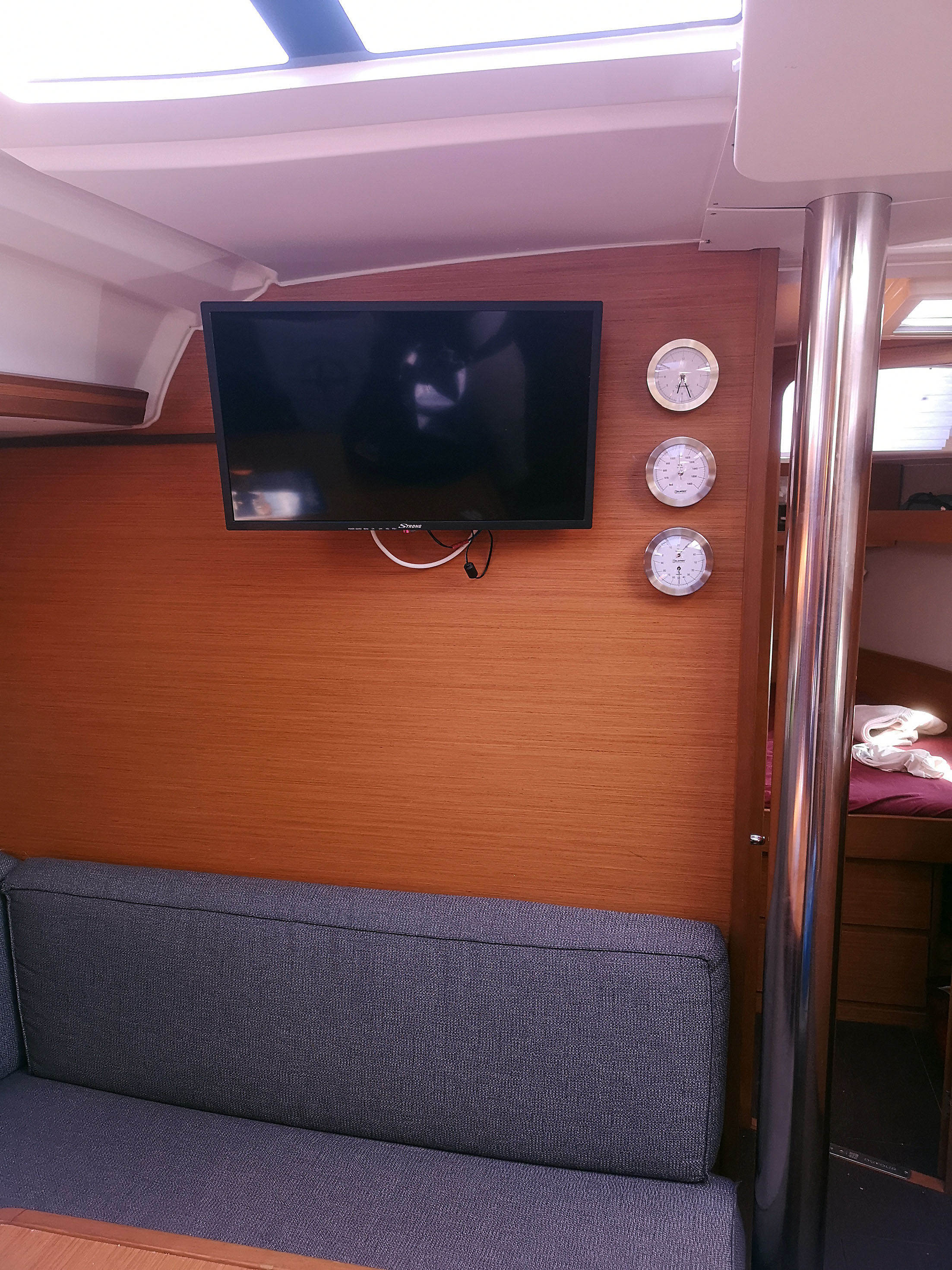 | Outside | Anker mit Kette, Biminitop, Bootshaken, Bugspriet, Cockpitlautsprecher, Cockpittisch, Deckbürste, elektr. Ankerwinsch, Fender, Fernsteuerung für elektr. Ankerwinsch, Festmacherleinen, Grill, Sprayhood, Teak im Cockpit, Wantenschneider |