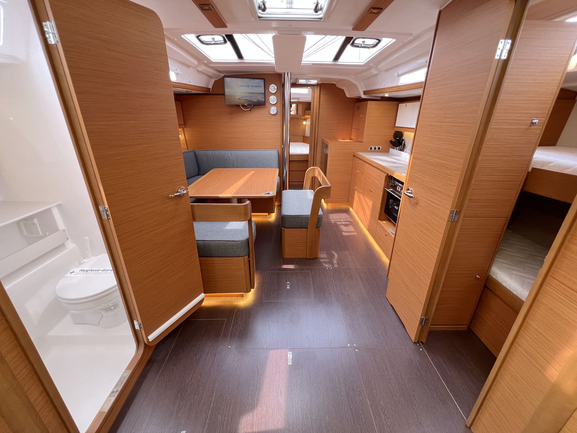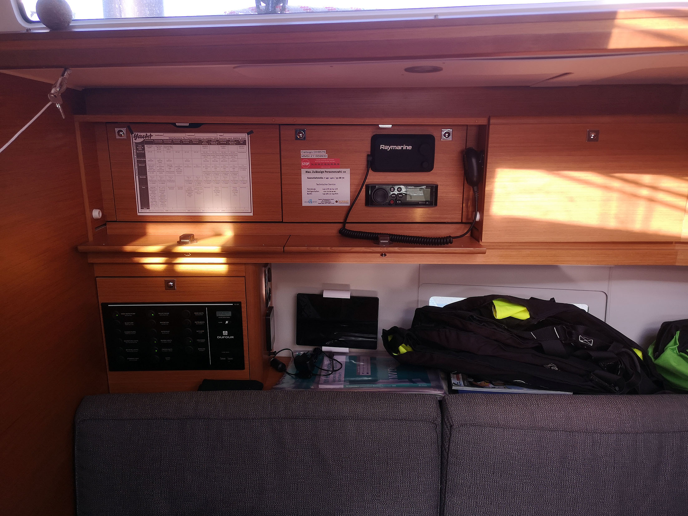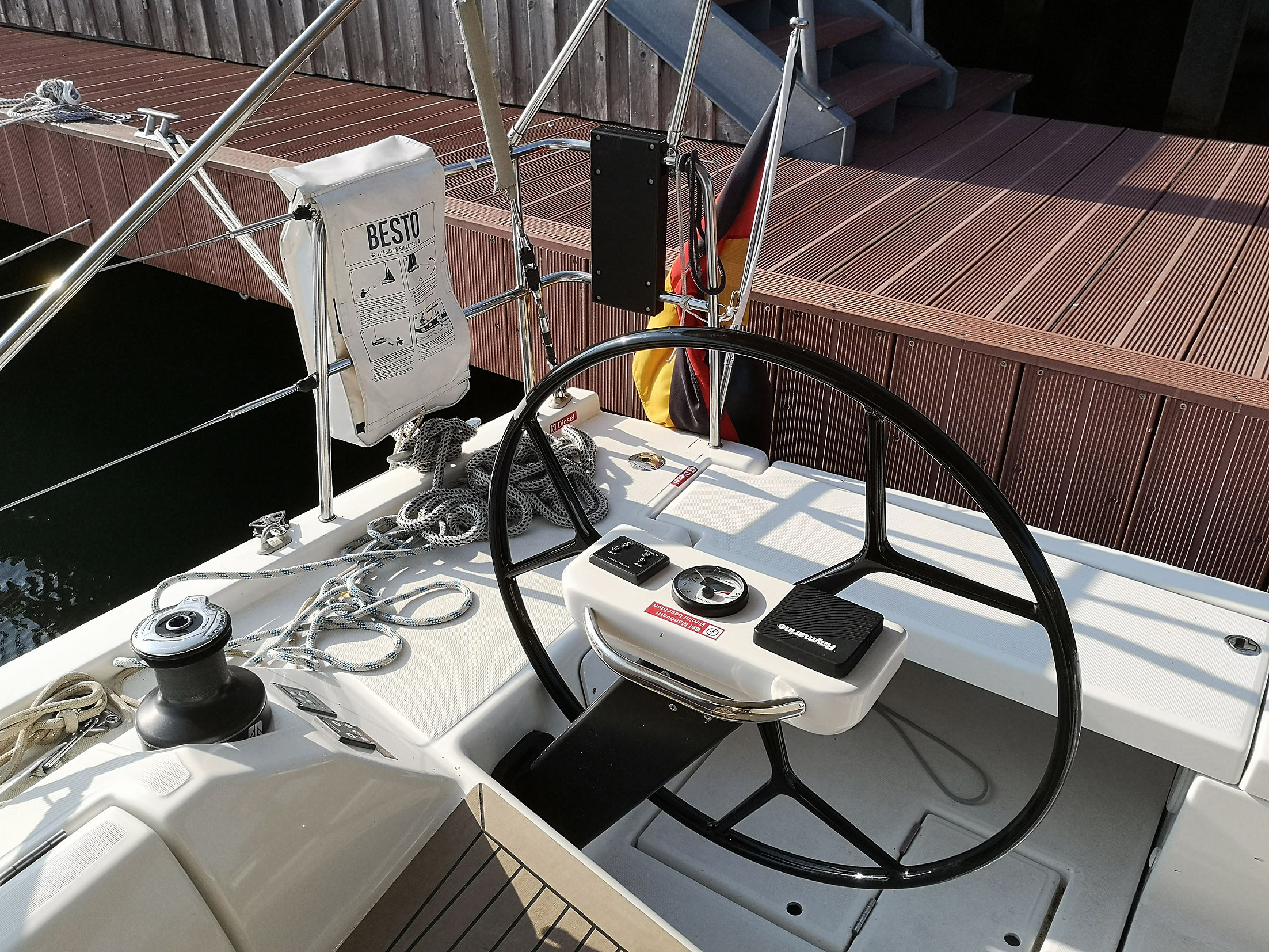 | Safety | AIS Empfänger, Ankerball, Ankerlicht, Automatikwesten, Autopilot, Bilgepumpe, Bootsmannstuhl, Bordapotheke, Bordwerkzeug, Bugstrahlruder, Feuerlöscher, Flaggen, Lifebelts, Navigationslichter, Nebelhorn, Notsignale, Rettungsinsel, Rettungsring, UKW-Funk, Zweitanker |