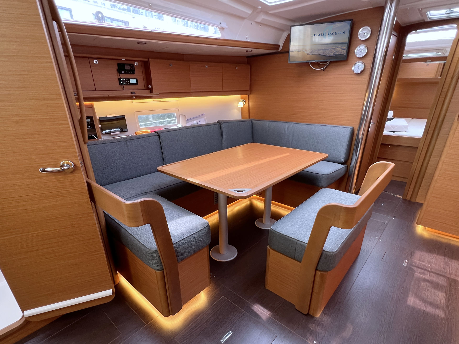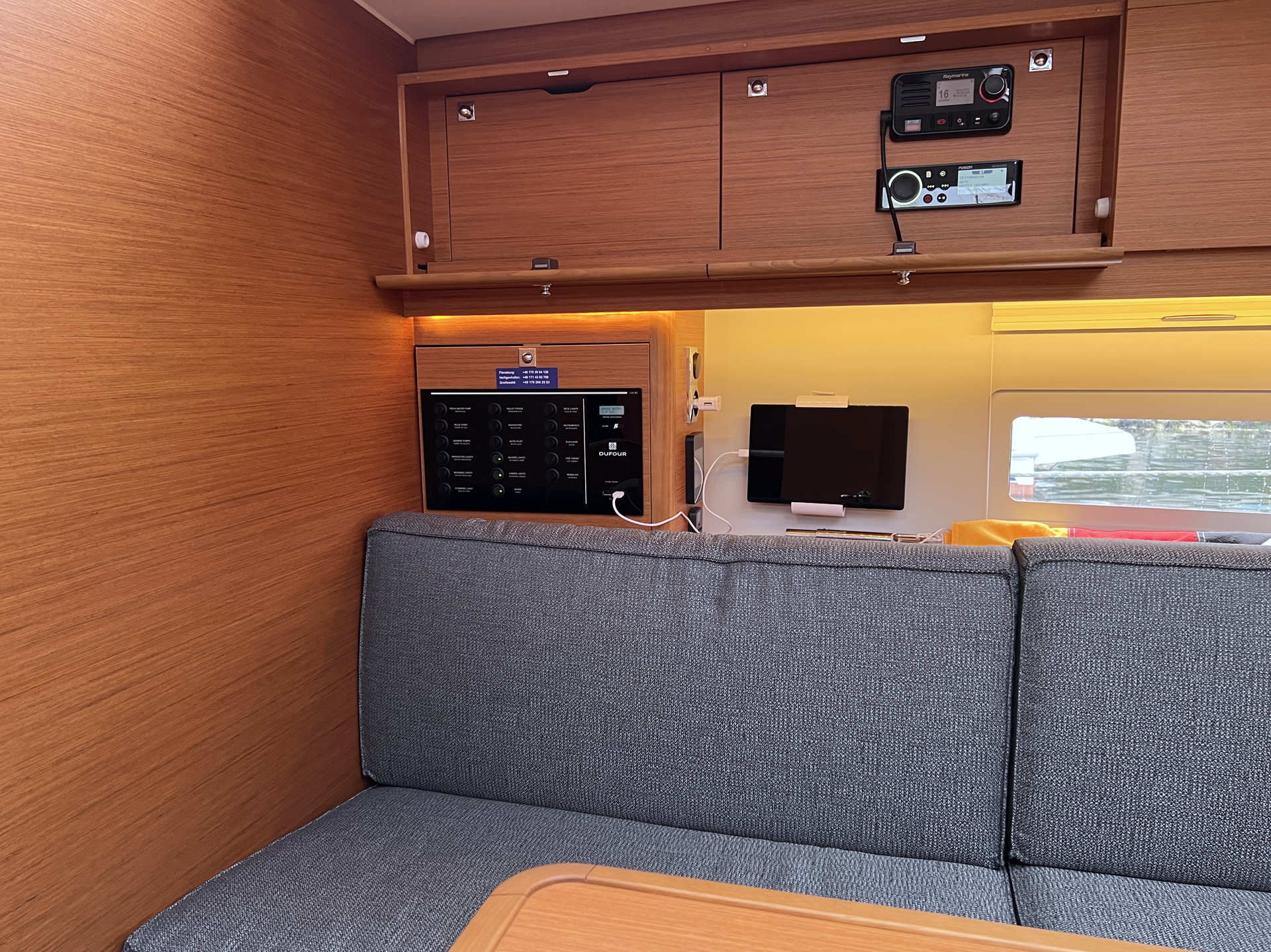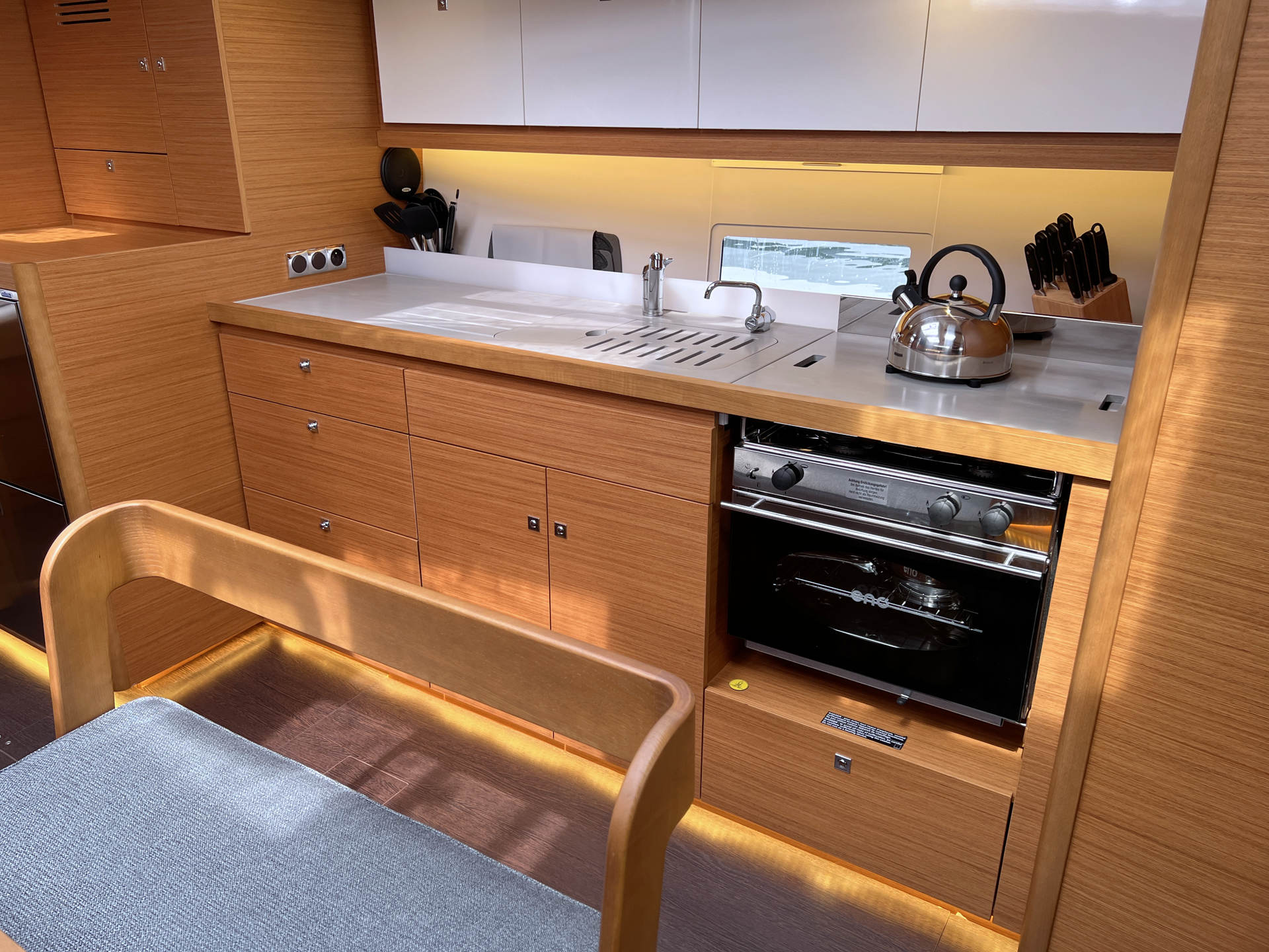 | Inside | 12V/220V-Steckdosen, Backofen, Borduhr, Diesel-Heizung, elektr. Druckwasserpumpe, elektrische Kühlbox, FUSION Sound System, Gasherd, Ladegerät, Landstromkabel, Pantryausstattung, Salontisch absenkbar, Spülbecken, Tablet PC, TV mit DVBT, Warmwasser, WC (elektr.), Weinschrank |