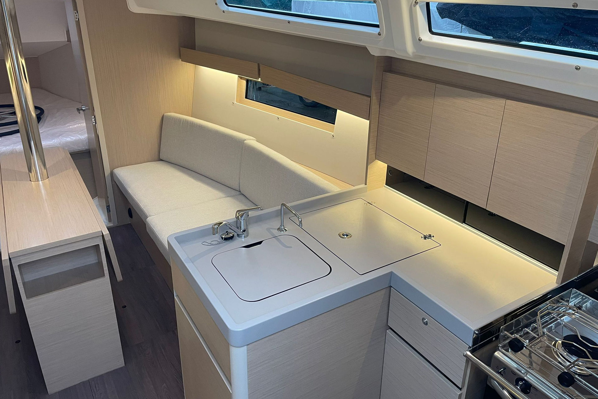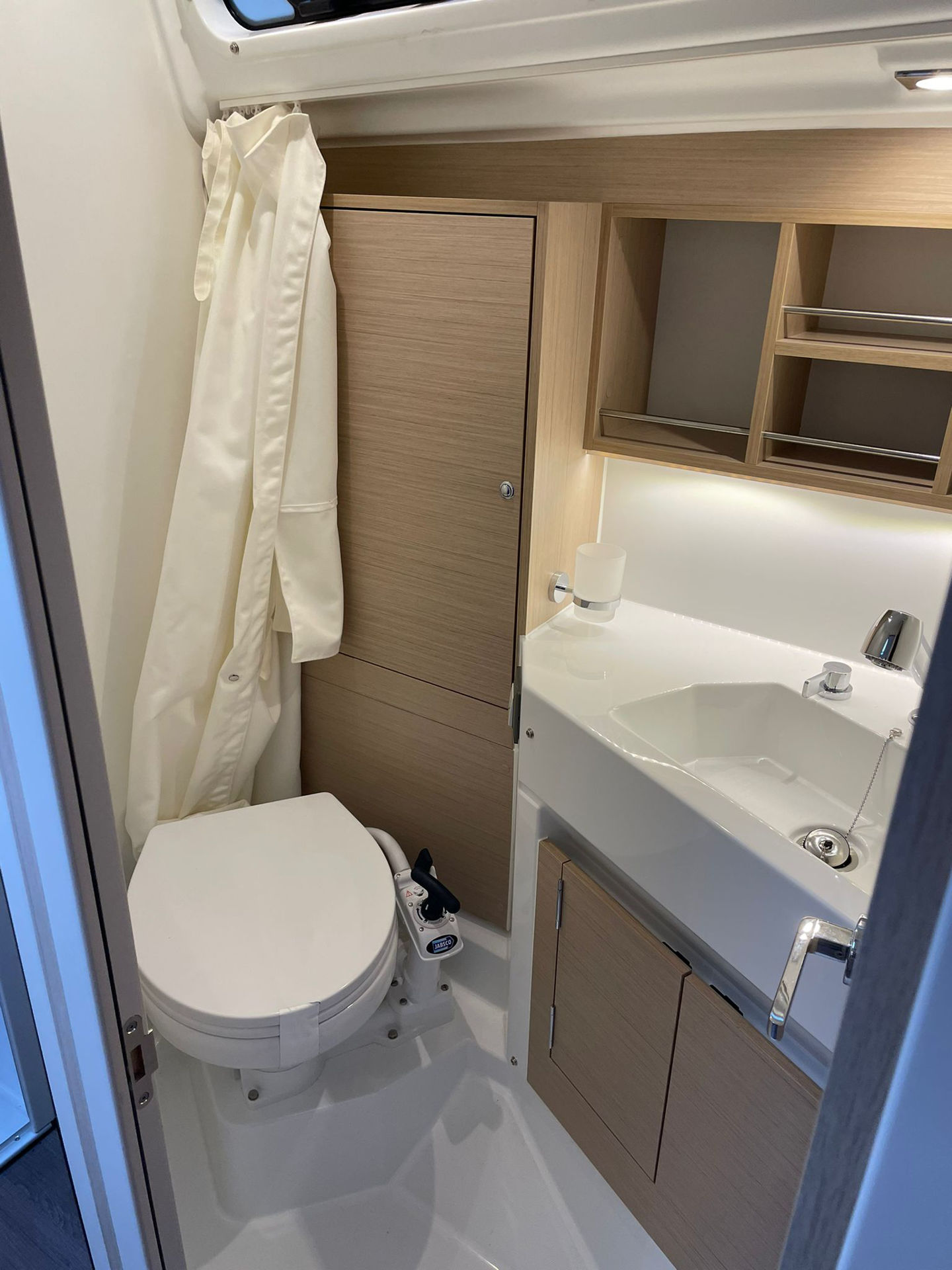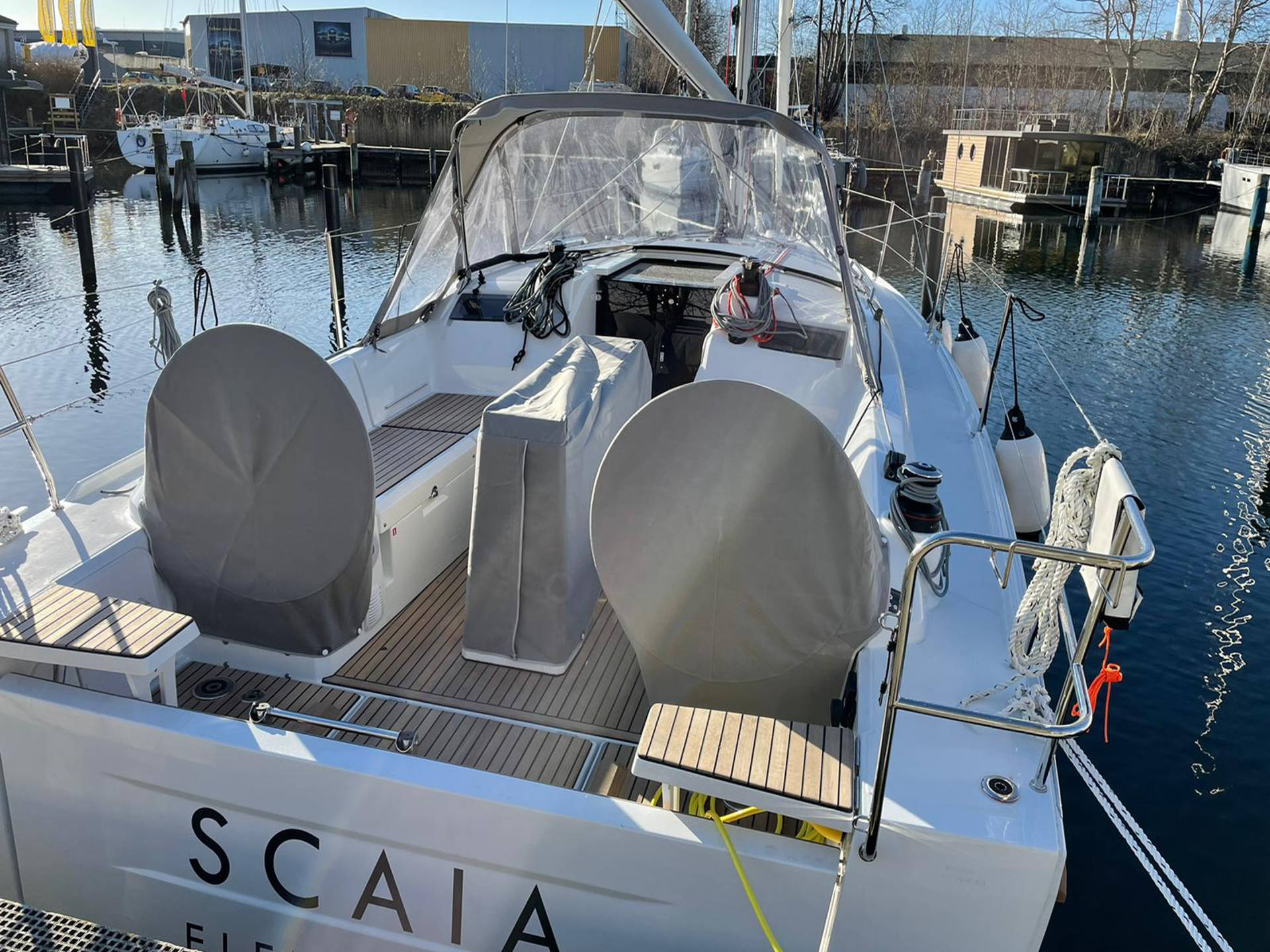 | Outside | 12 V-Anschluss, Bootshaken, Bugkorb, Cockpitdusche, Cockpittisch, Deckbürste, elektr. Ankerwinsch, Faltpropeller, Fender, Festmacherleinen, Sprayhood, Teak auf Badeplattform, Wantenschneider |