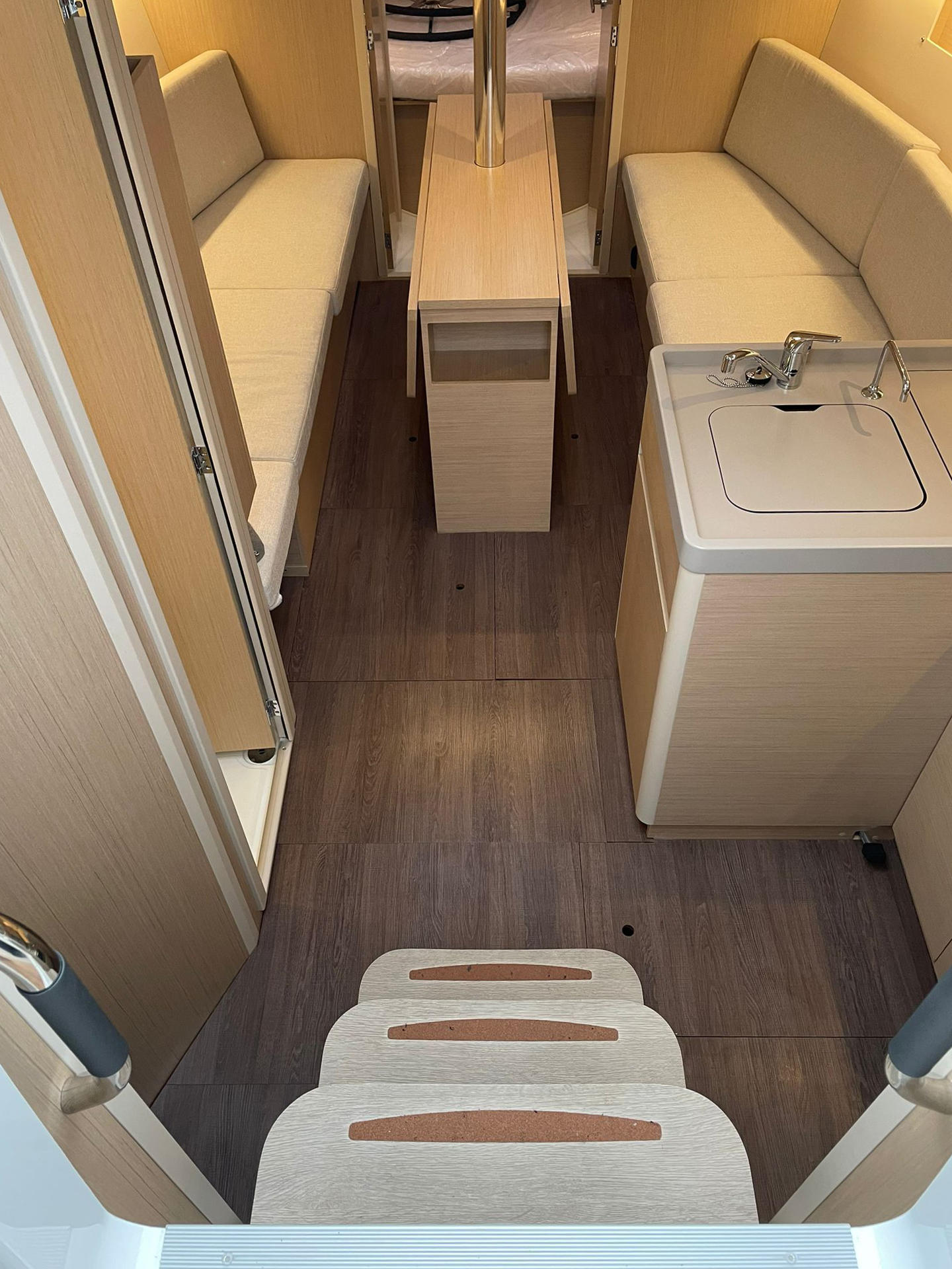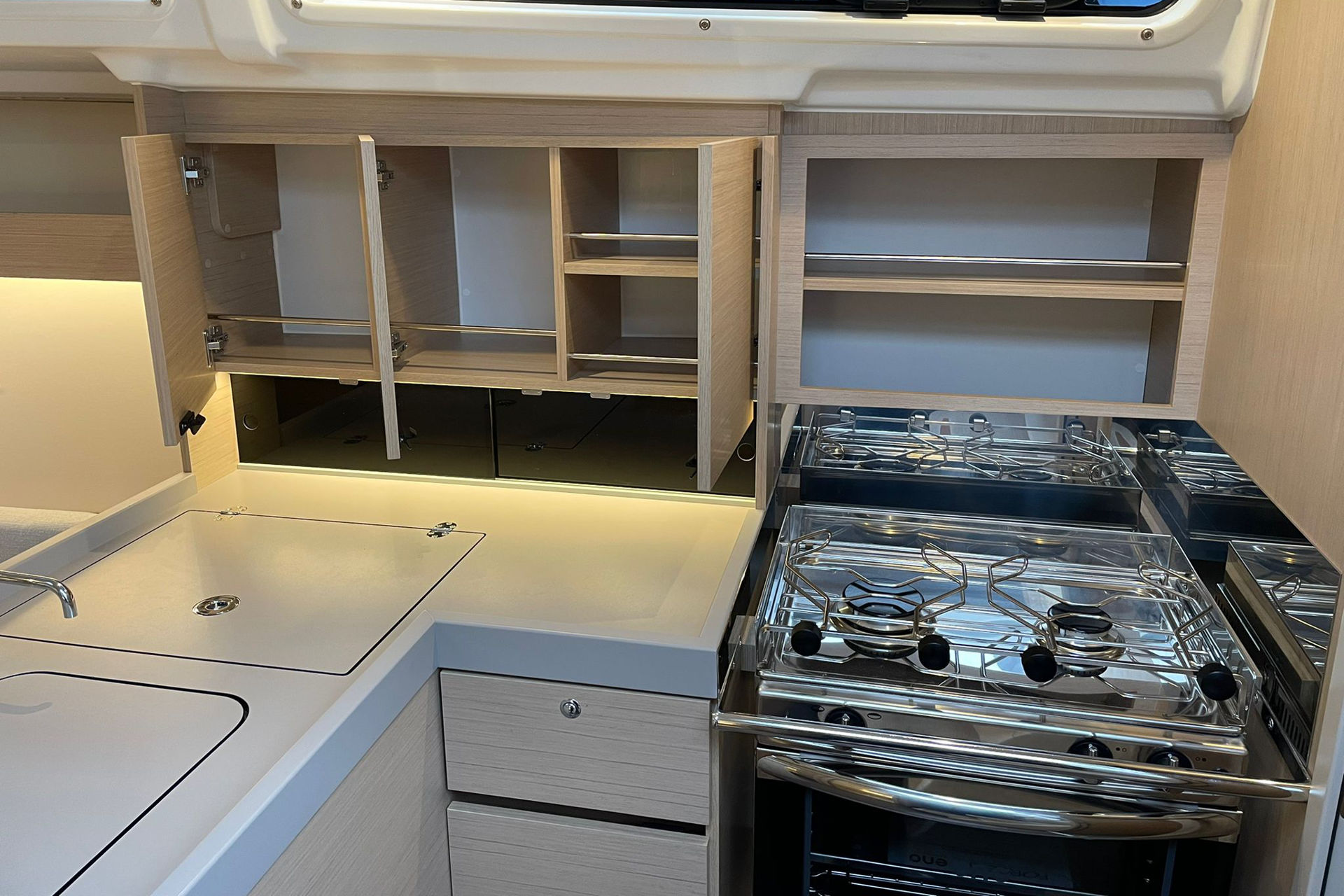 | Inside | 2-flammiger Gasherd, 220V Steckdosen, Backofen, Borduhr, Diesel-Heizung, Druckwasser, elektrische Kühlbox, Ladegerät, Landstromkabel, LCD Fernseher + DVD, Pantryausstattung, Spülbecken, Warmwasser |