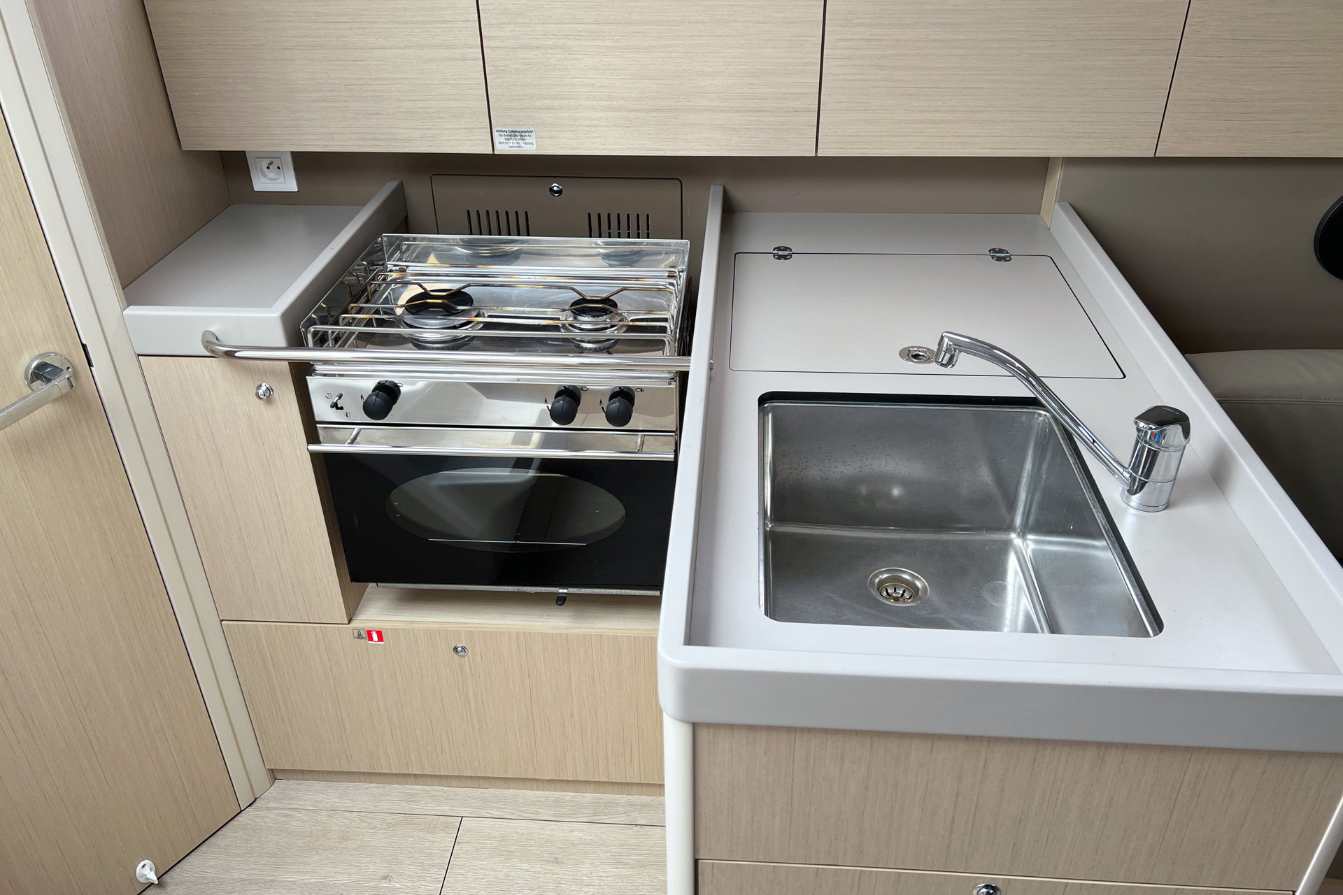 | Inside | Druckwasser, DVB-T, Gasherd mit Backofen, Heizung, Lautsprecher im Salon, Pantryausstattung, TV + DVD, Ventilatoren in Salon und Kabinen, Warmwasser, WC (elektr.) |