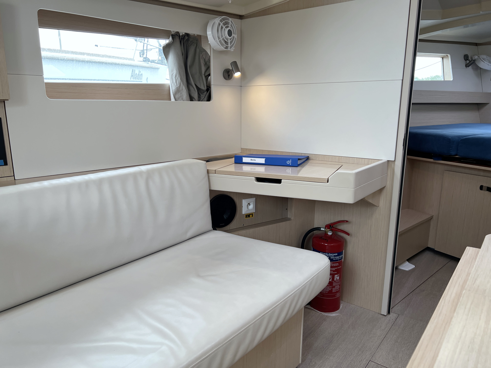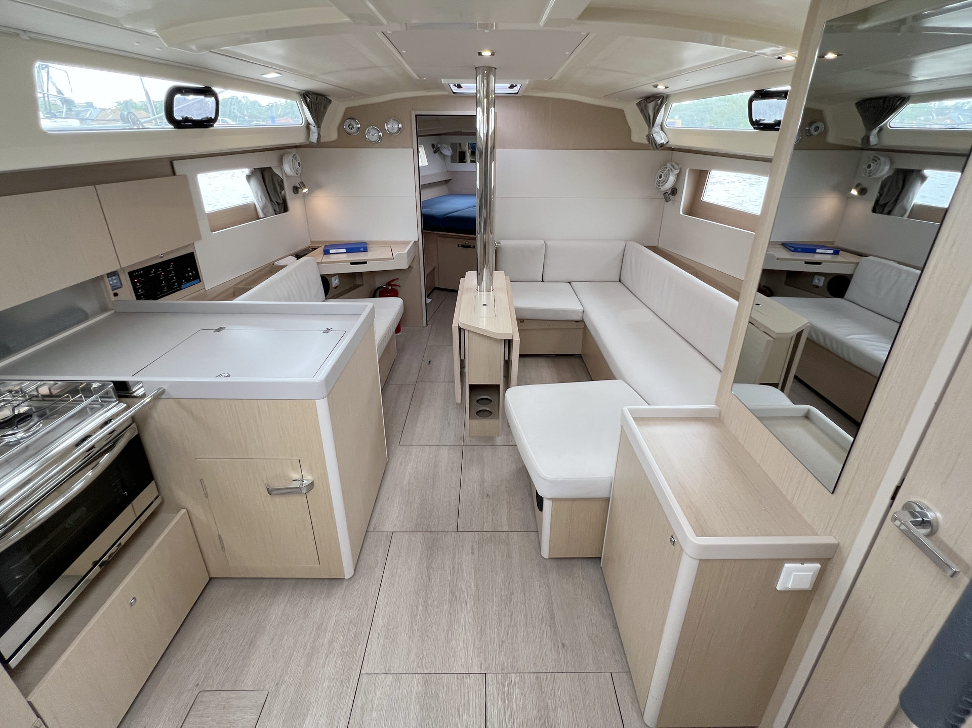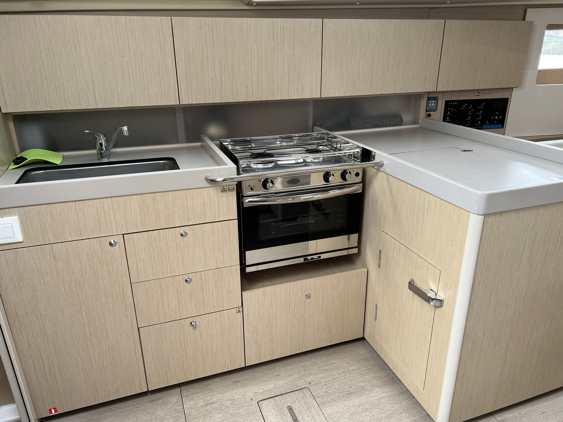 | Inside | Druckwasser, DVB-T, Gasherd mit Backofen, Heizung, Lautsprecher im Salon, Pantryausstattung, Salontisch absenkbar, TV + DVD, USB Steckdosen in den Kabinen, Ventilatoren in Salon und Kabinen, Warmwasser |