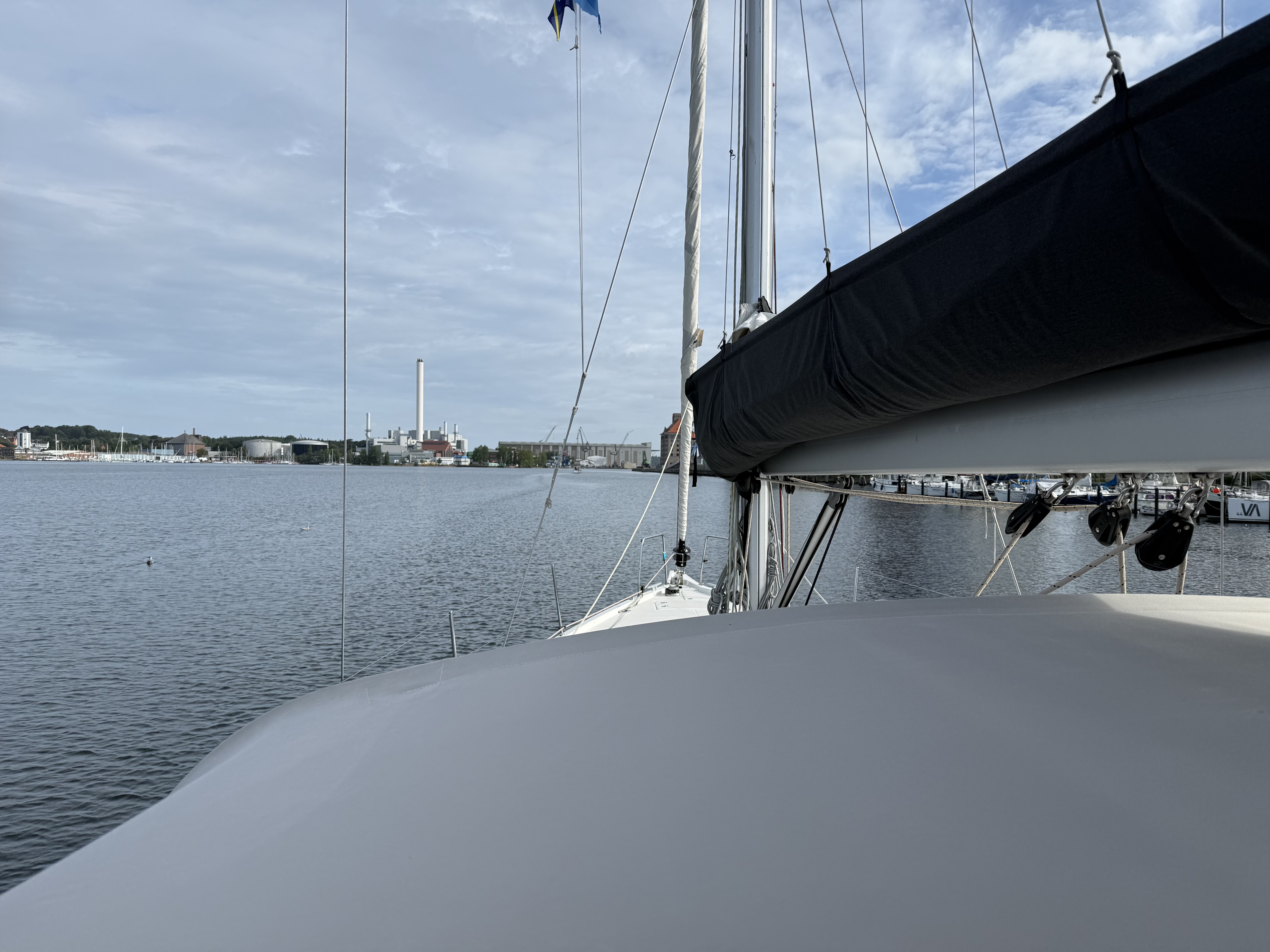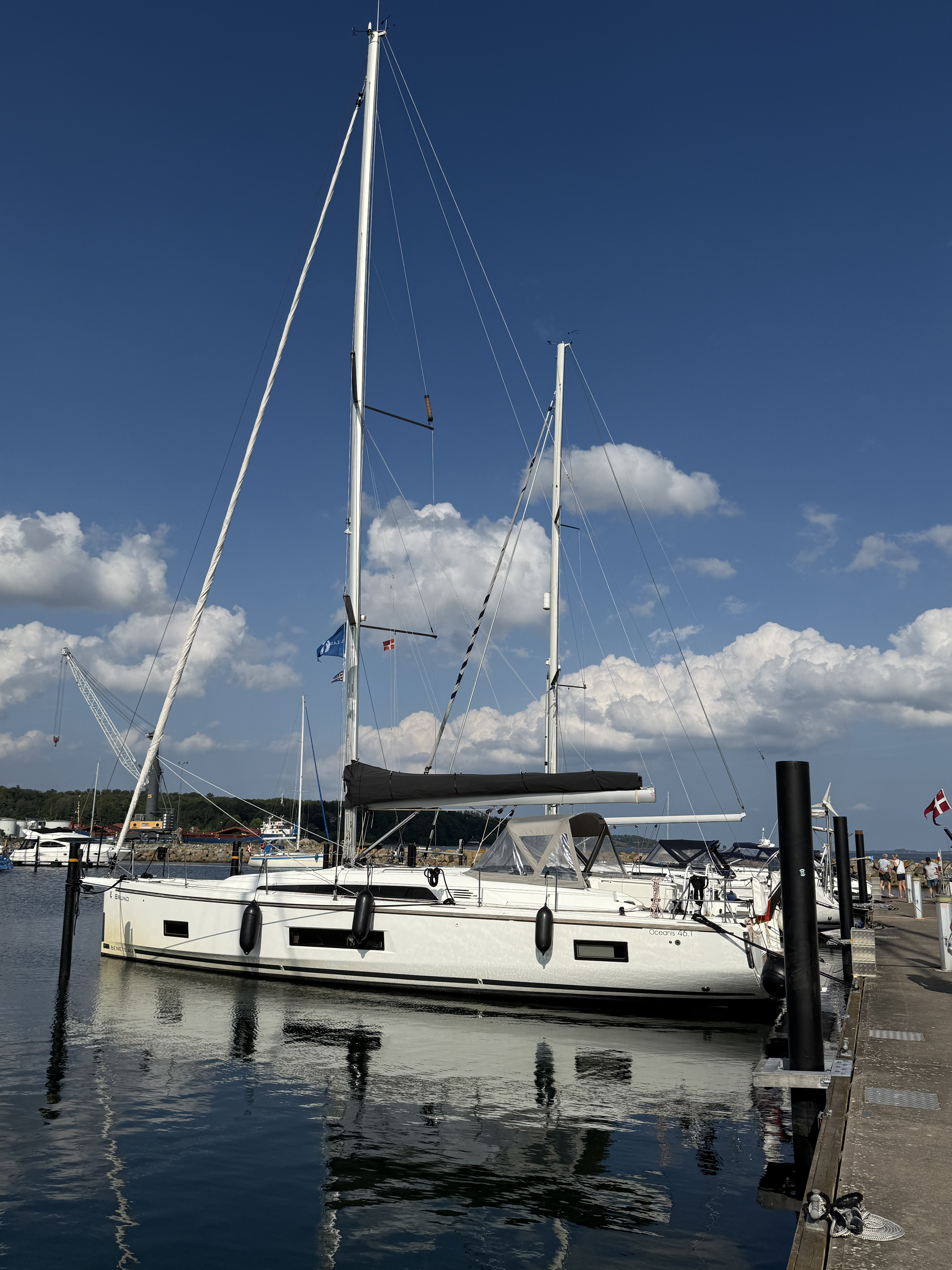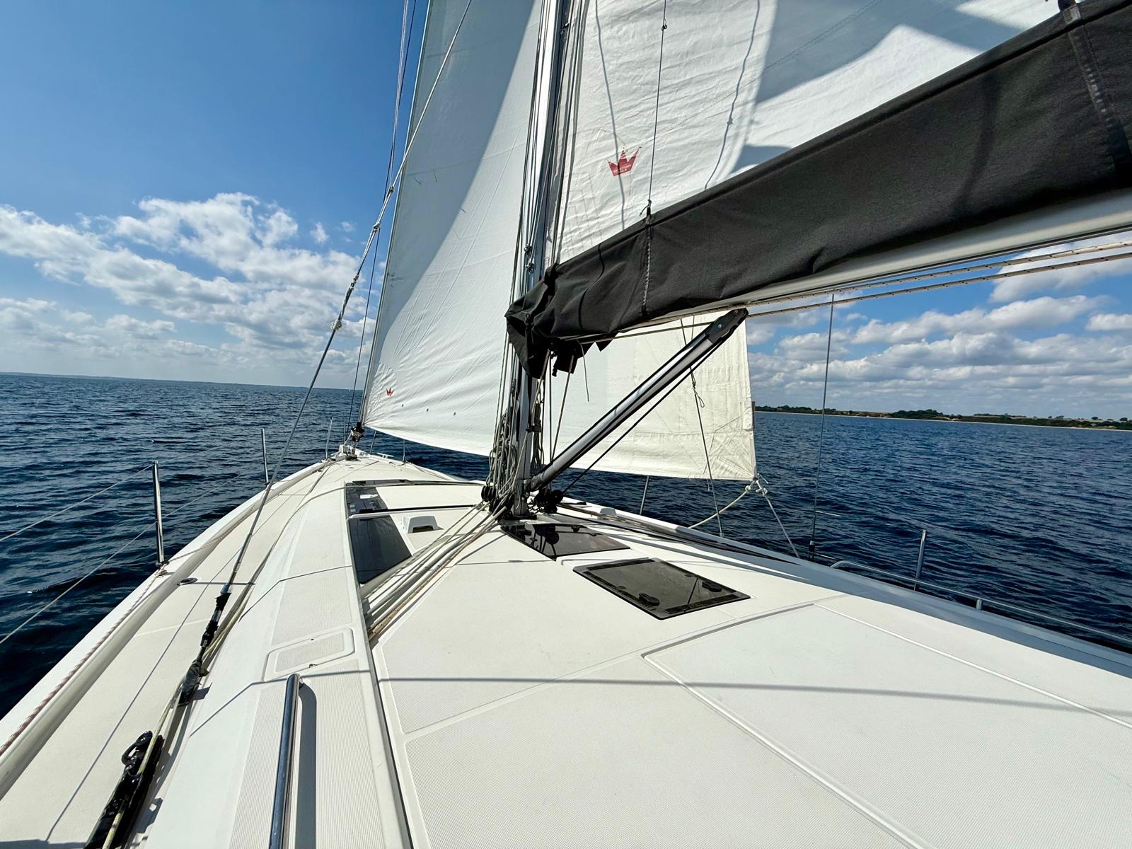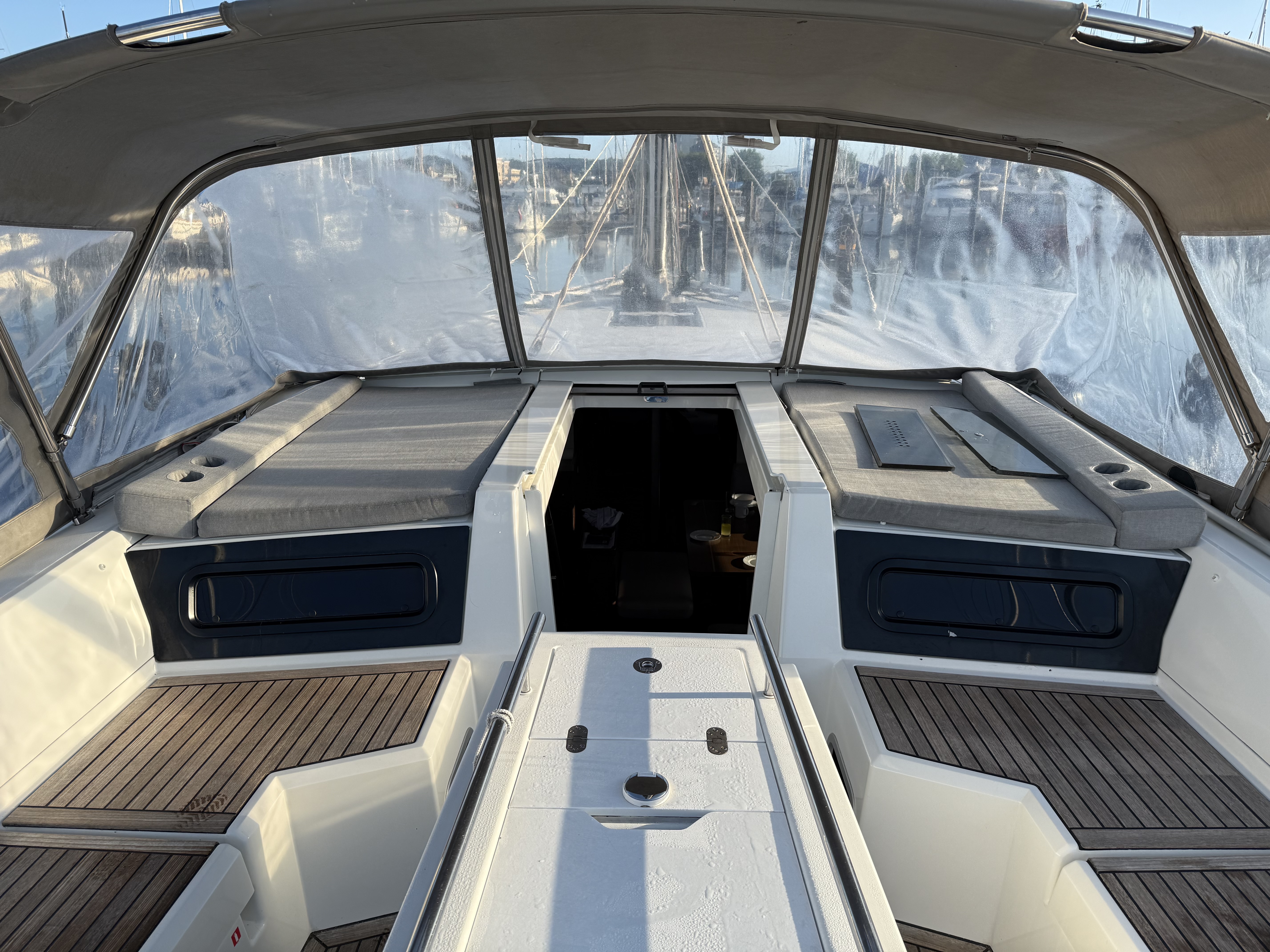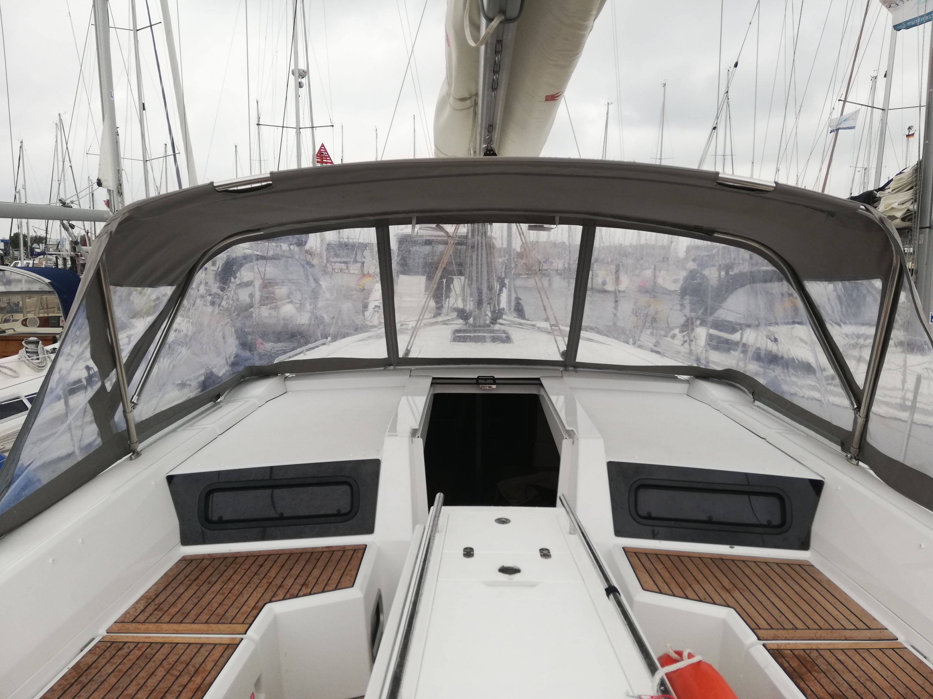 | Outside | Anker mit Kette, Bootshaken, Bugkorb, Cockpittisch, elektr. Ankerwinsch, Festmacherleinen, Seereling, Sprayhood, Wantenschneider |