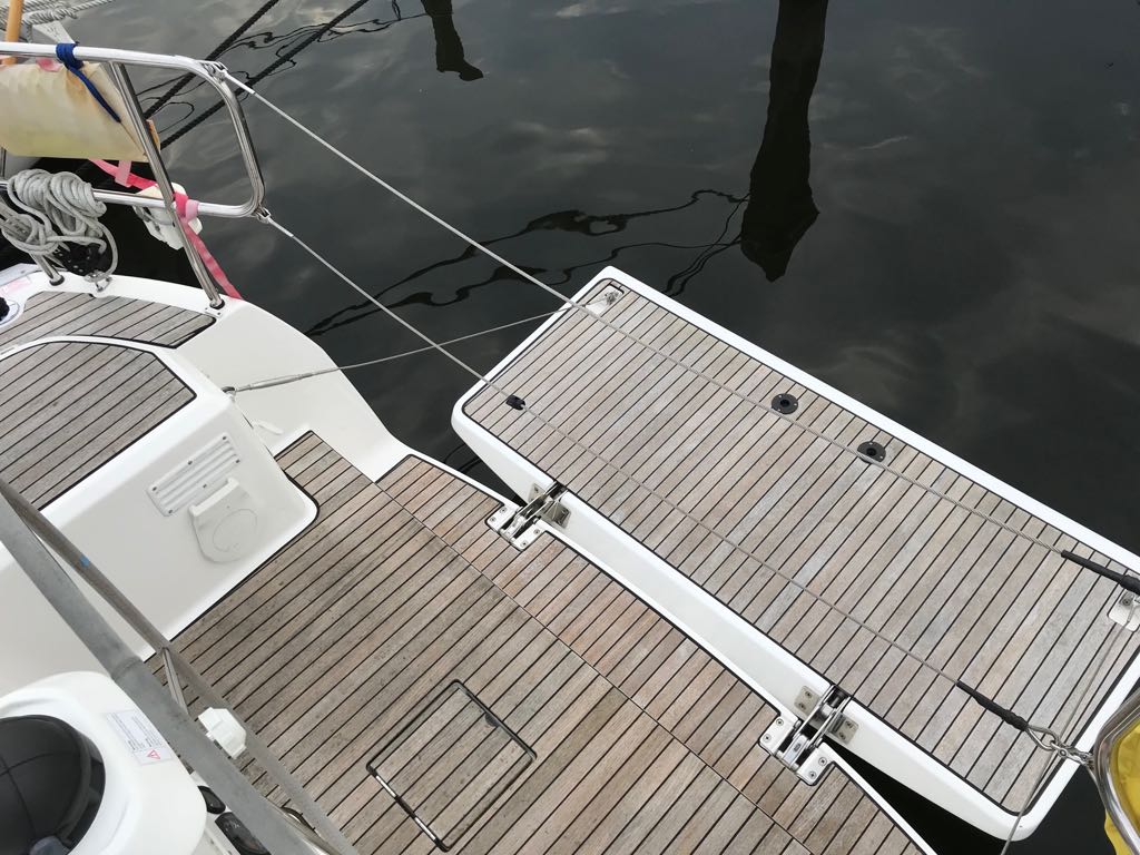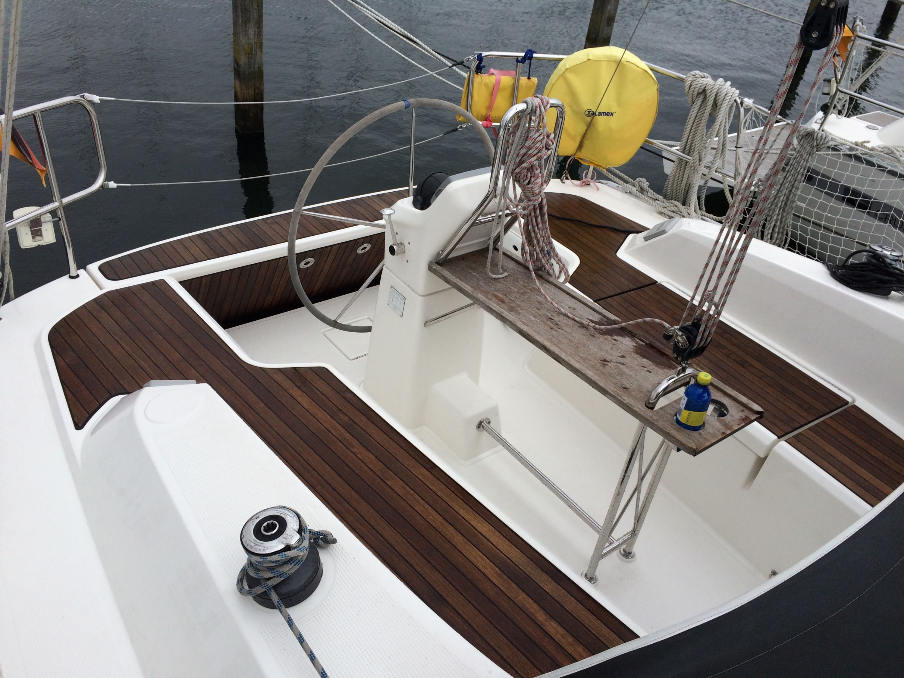 | Outside | 220 V-Landanschluss, Anker mit Kette, Bootshaken, Fender, Festmacherleinen, Heckanker, Sprayhood, Teakdeck (teilw.), Windex |